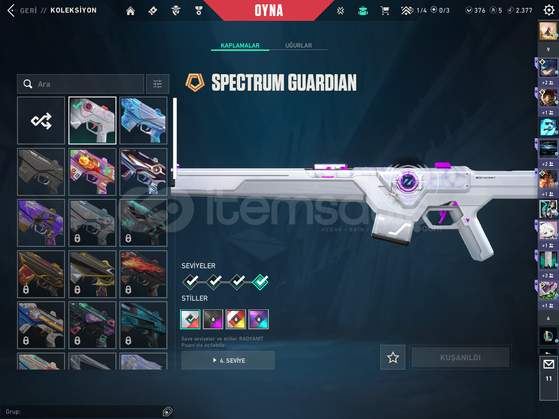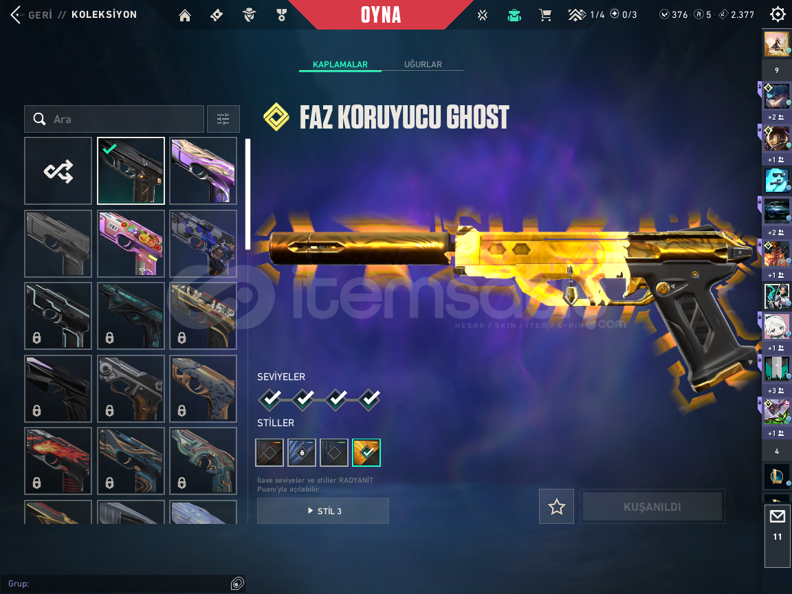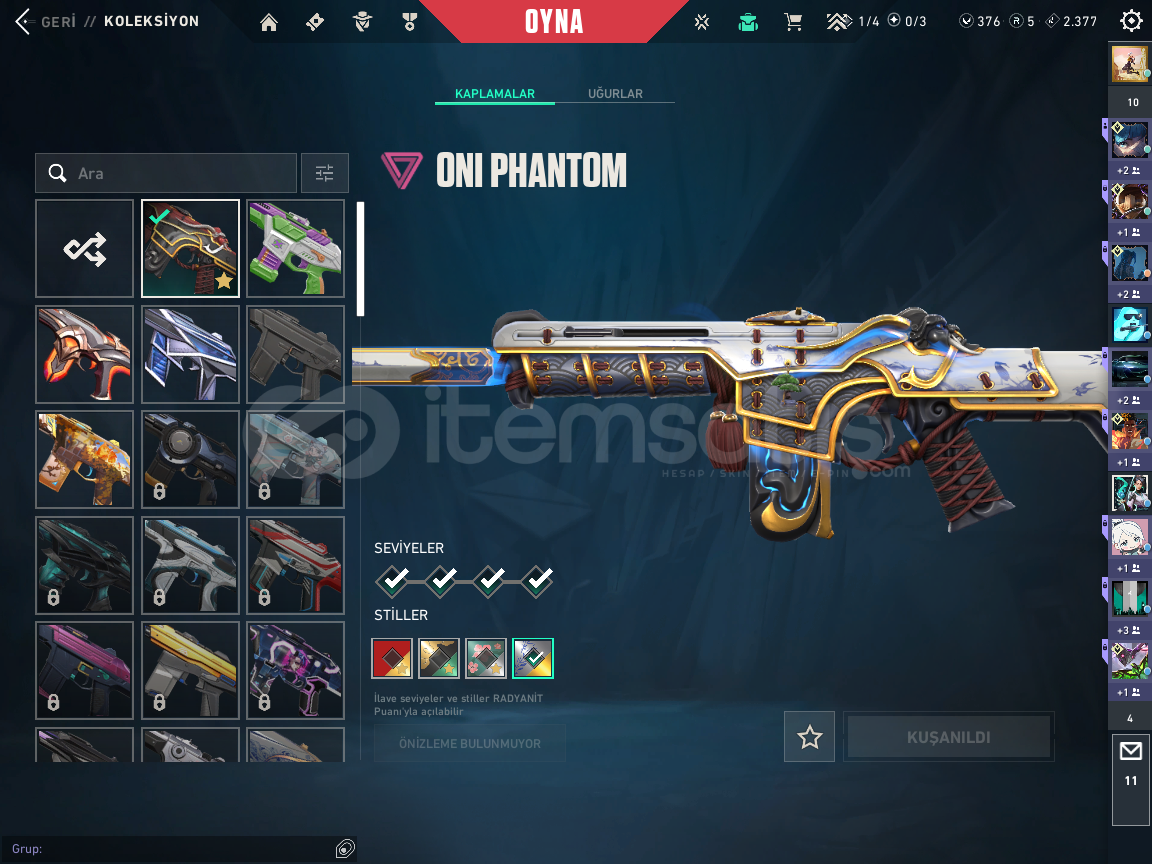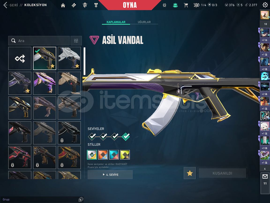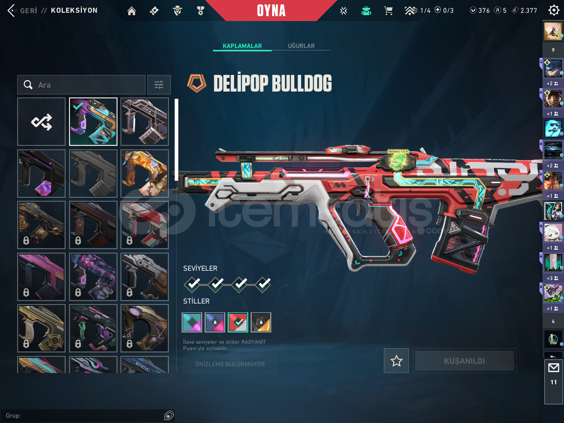 Hesapta delipop bulldog spectrum guardian asil vandal yagmacı vandal faz koruyucu vandal iyon vandal champions vandal ejder vandal asil operator iyon spectre yağmacı bıçak semavi yelpaze oni phantom blastx phantom yağmacı sheriff faz korucu ghost ve yerçekimsel uranyum nöröateşleyici classic gibi skinler bulunmaktadır.Tr sunucudur rankı gold 2 dir,HESABIN MAİLİ DEĞİŞMEMEKTEDİR.