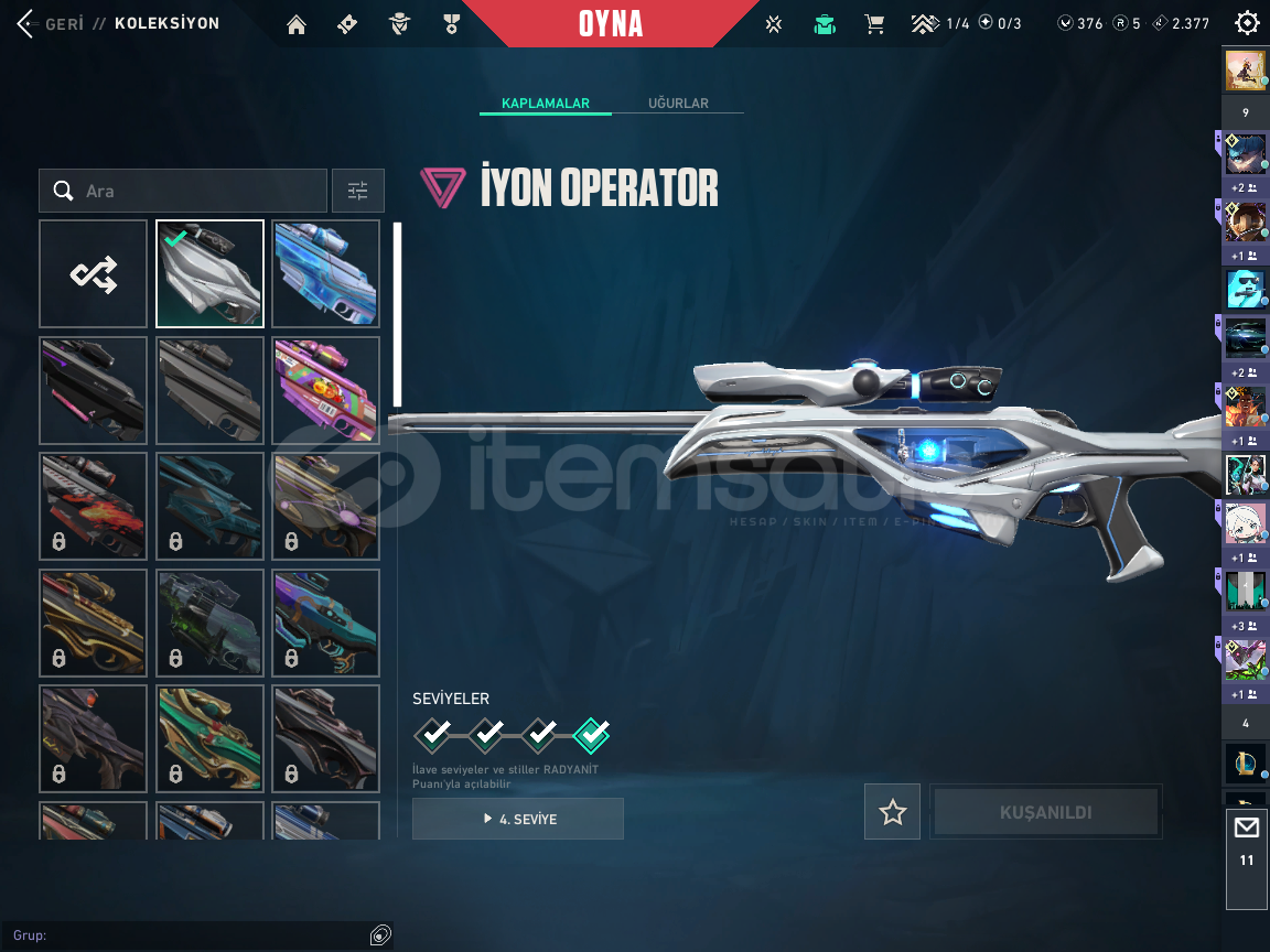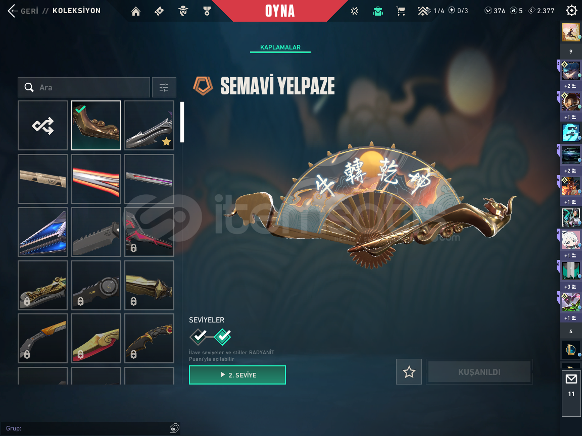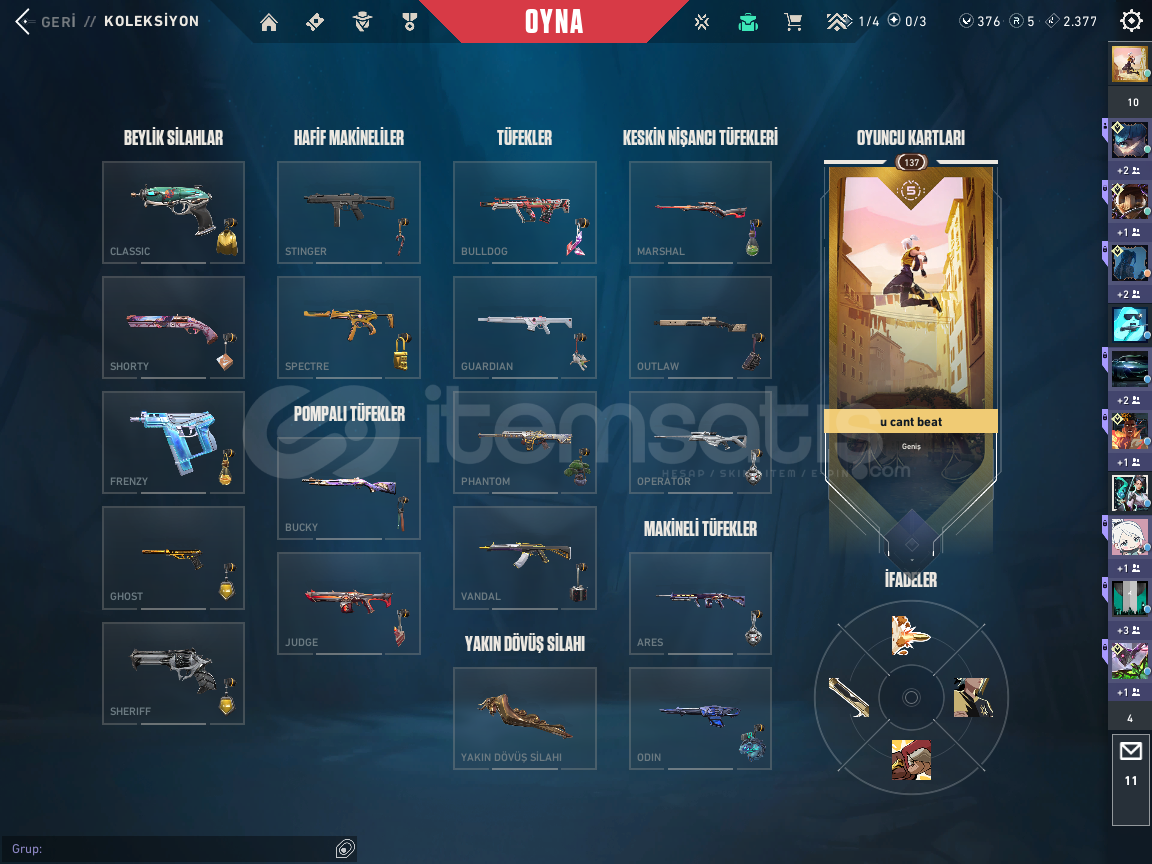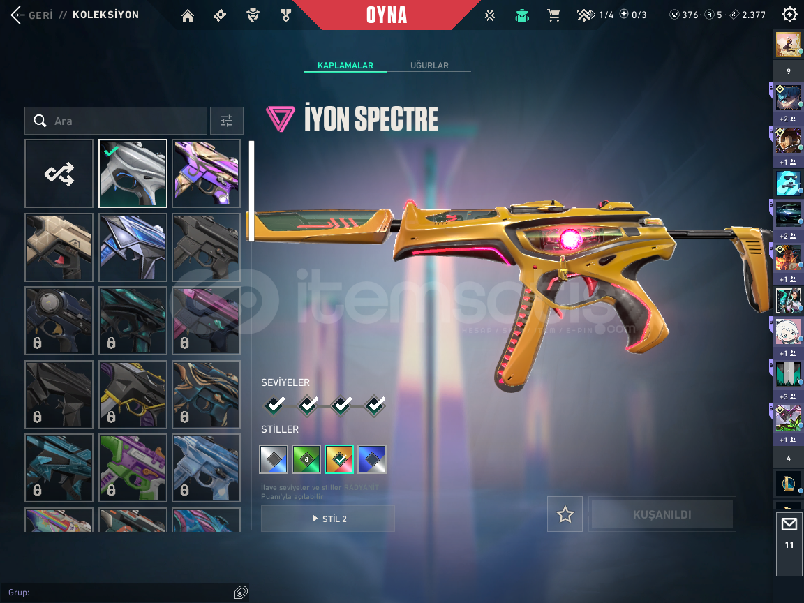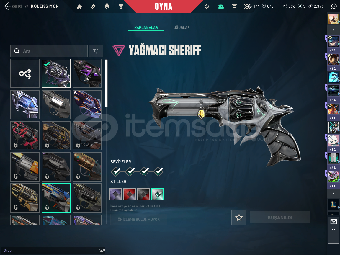 Hesapta delipop bulldog spectrum guardian asil vandal yagmacı vandal faz koruyucu vandal iyon vandal champions vandal ejder vandal asil operator iyon spectre yağmacı bıçak semavi yelpaze oni phantom blastx phantom yağmacı sheriff faz korucu ghost ve yerçekimsel uranyum nöröateşleyici classic gibi skinler bulunmaktadır.Tr sunucudur rankı gold 2 dir,HESABIN MAİLİ DEĞİŞMEMEKTEDİR.