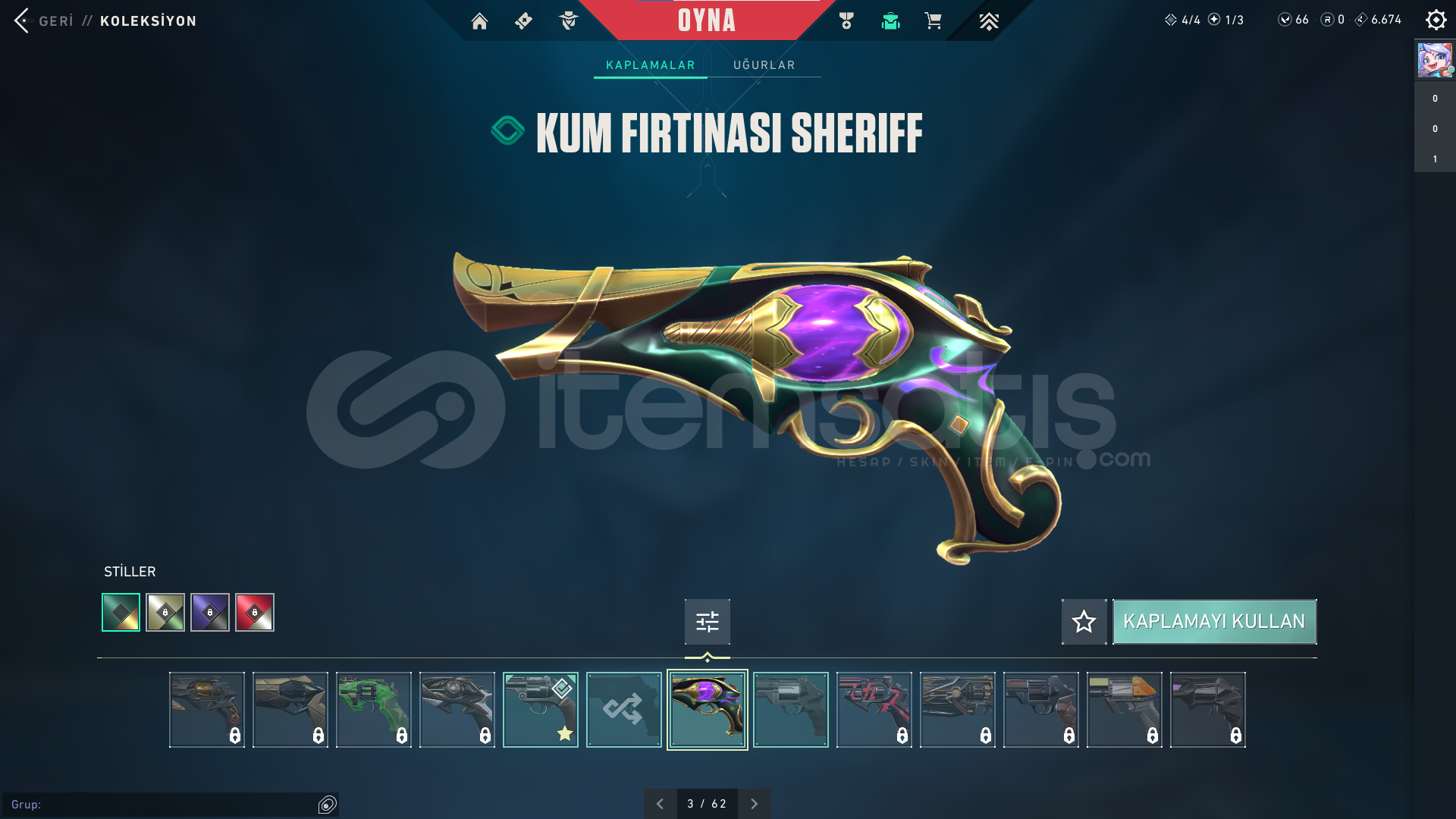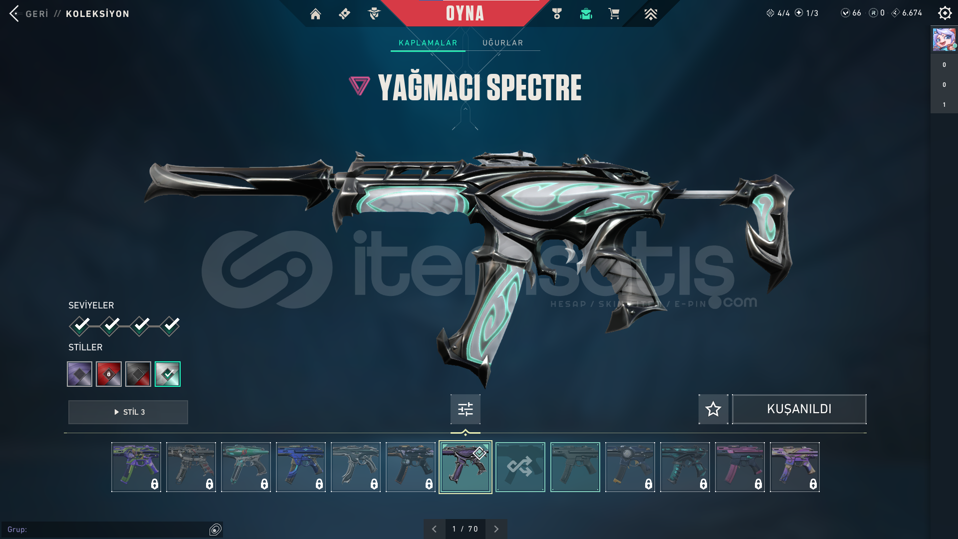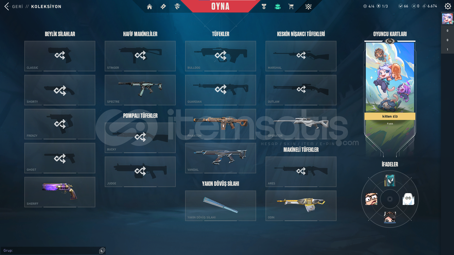 ⭐ Hesabın içinde Asil Odin , Denge , Ejder Ateşi Vandal , Kuronami Vandal , Seri Tetik Sheriff , Sihirpunk Phantom , Iyon Operator , Yağmacı Spectre ve Kum Fırtınası Sheriff skinleri bulunuyor.