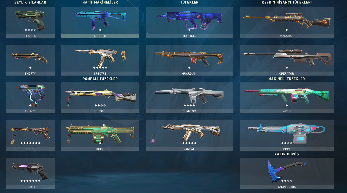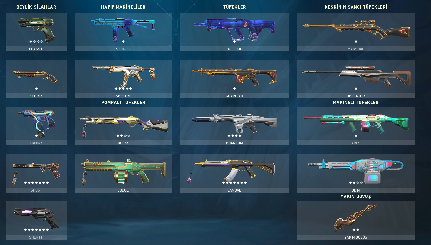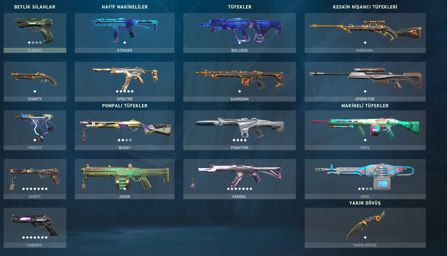 Classic: Zarafet - Şakıyançelik - Robo-Tabanca - Prizma 3 - Elektro - Sonsuz ClassicShorty: Zehirdiş - Dahi Çocuk - Altın Afet FrenzyFrenzy: Koalisyon Kobra - Keskin Kanat - Havai - Elektrik Akımı FrenzyGhost: Vakur - Süvari - Sualtı - Kan Davası - Galaksiler Arası - Sihirpunk GhostSherrif: Son Dilek - Kübik Kurbağa - Işık Dalgası - Elektro - Barışçıl - Anomali SherrifStınger: Süvari - Elektro - Sualtı StingerSpectre: Vakur - Kübik Kurbağa - Yitik SpectreBucky: Süvari - Işık Dalga...
