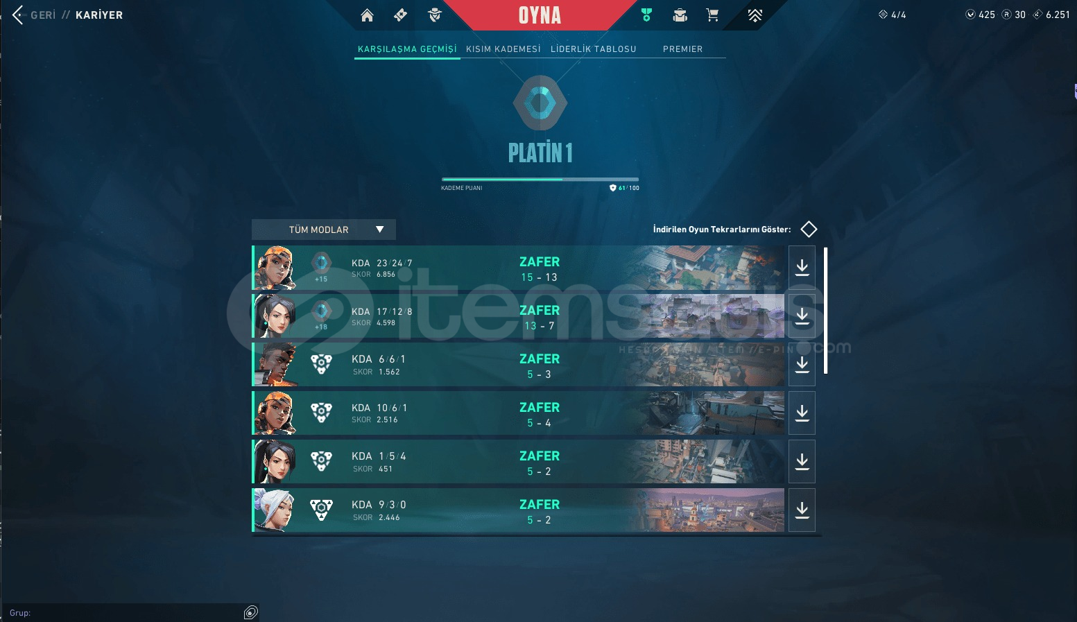 Hesapta Dolmirin İntikamı + RGX Vandal Seri Tetik Phantom + 2 Battle Pass bulunmaktadır. Hesap Plat 2 rankıdır hiç bir ban vesaire sorunu yoktur mmr ı yüksek bir hesap bütün silah geliştirmeleri açıktır alana şimdiden hayırlı olsunÇok az da olsa indirim yaparım.