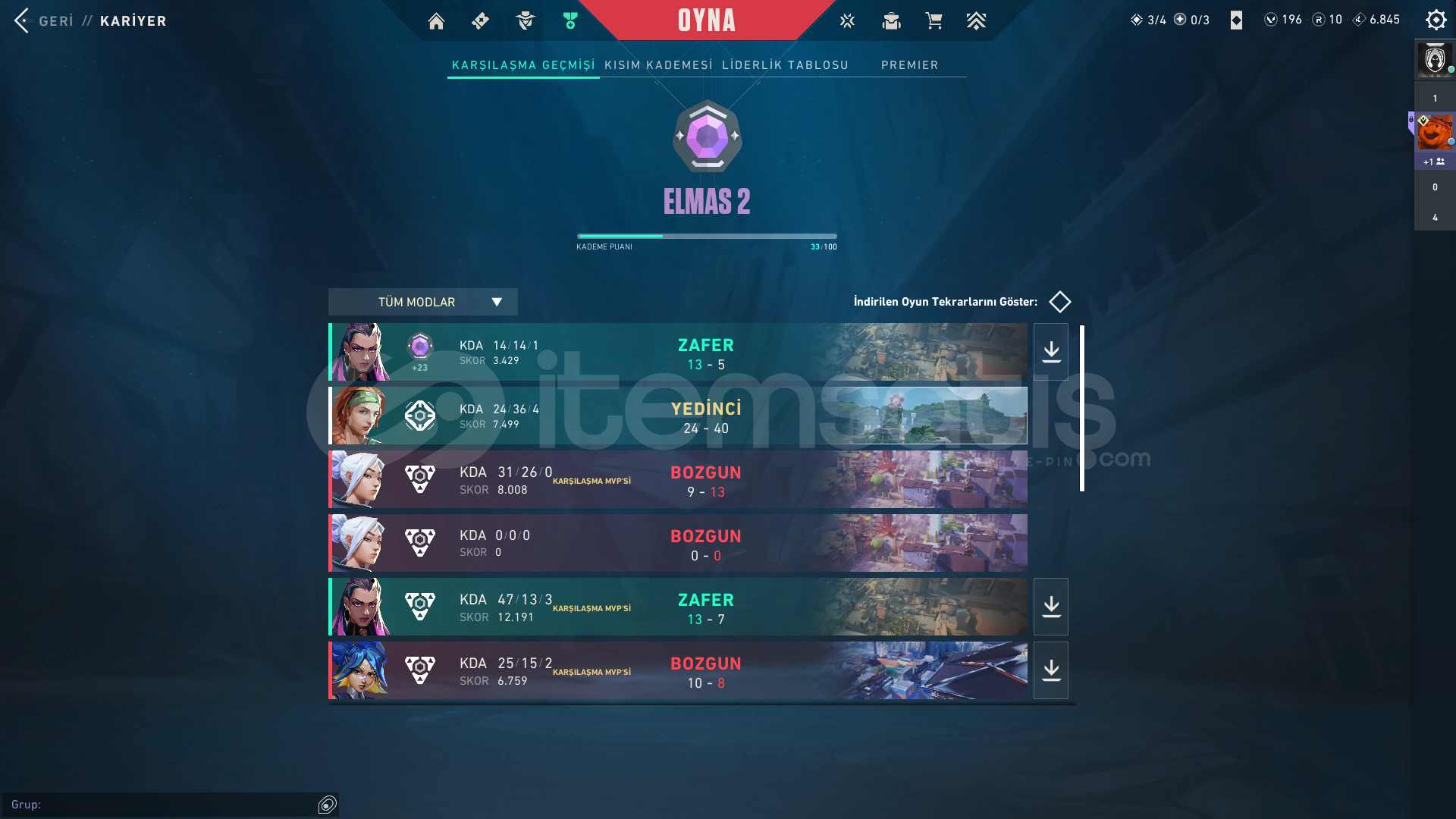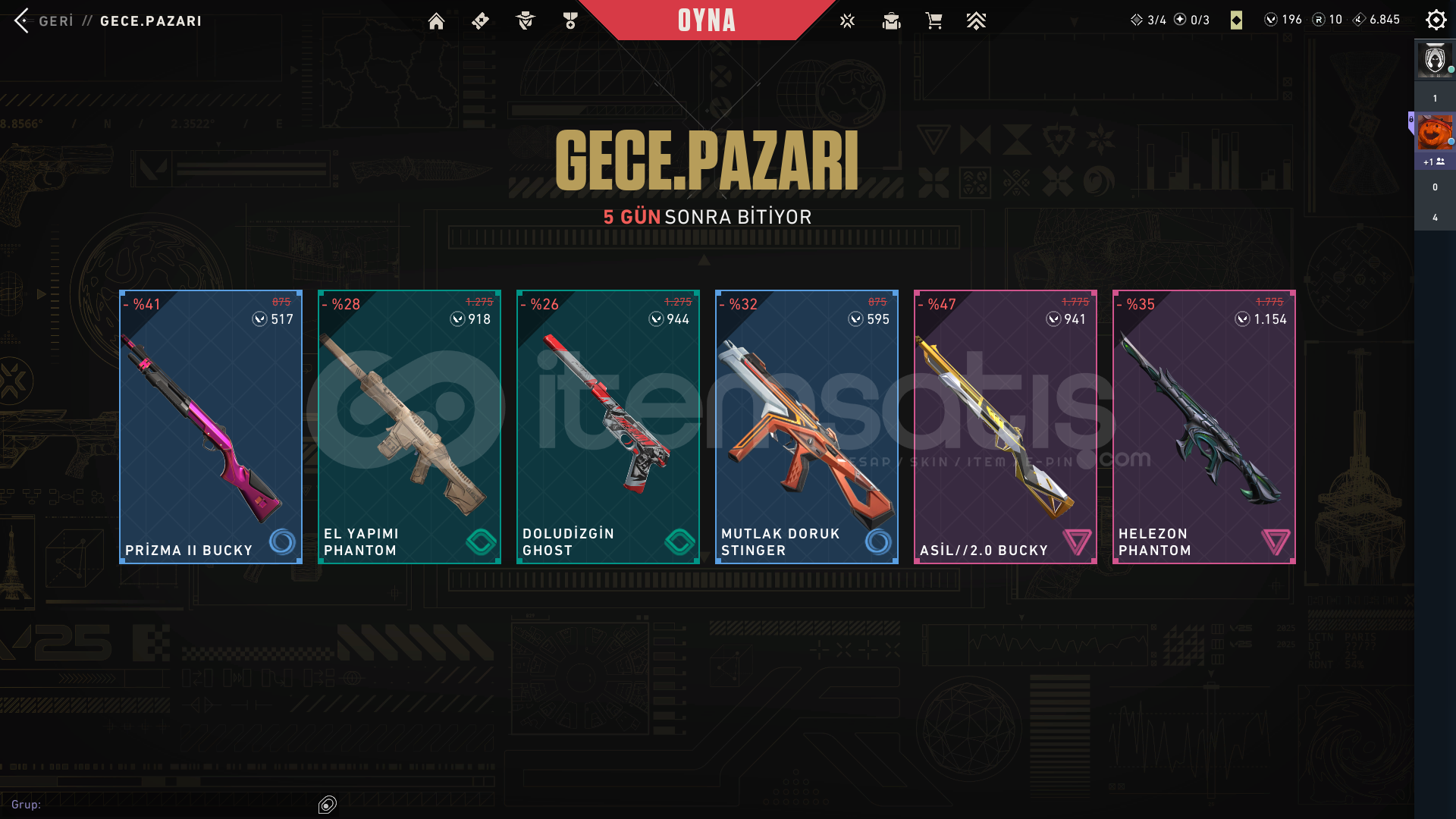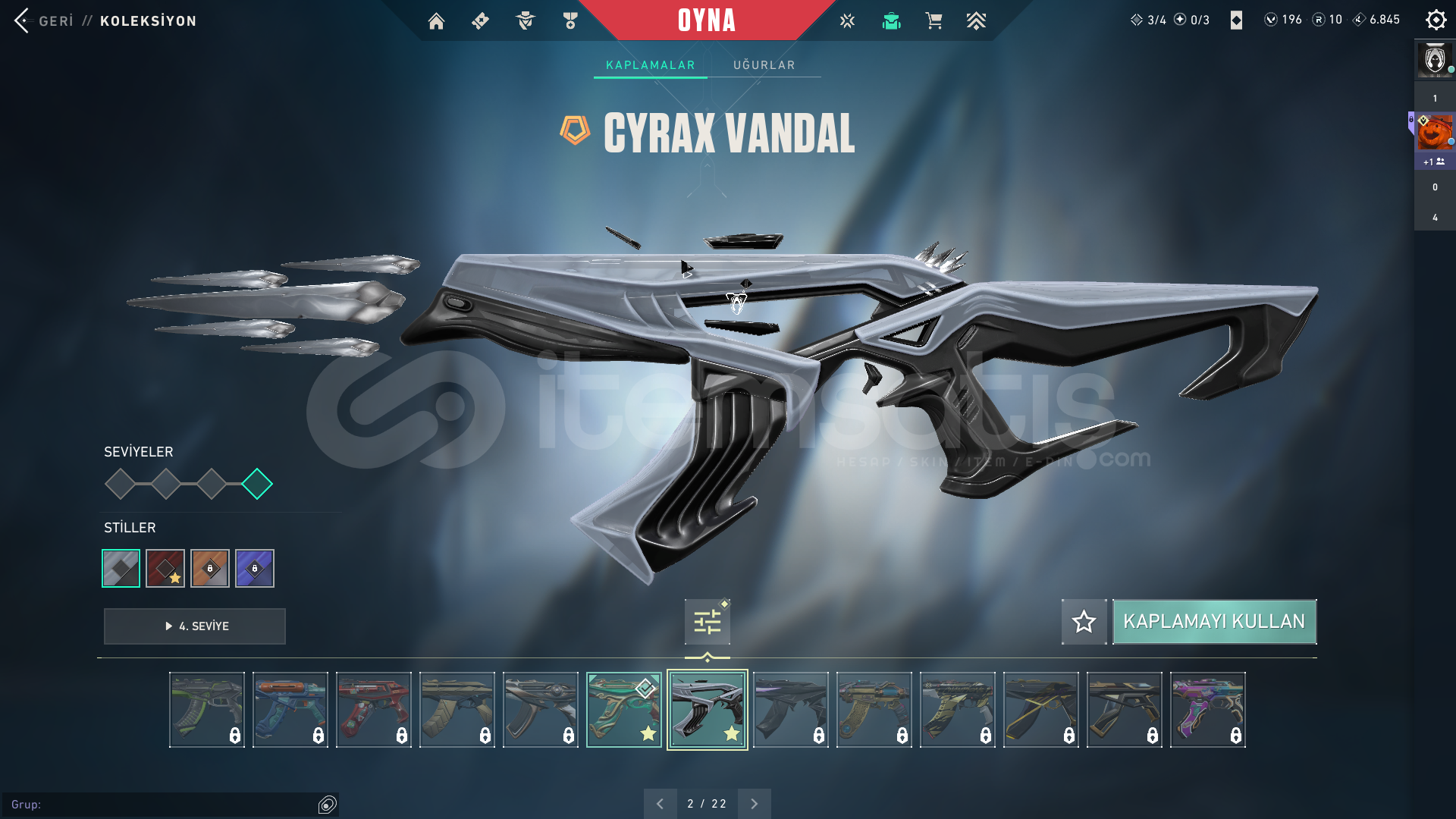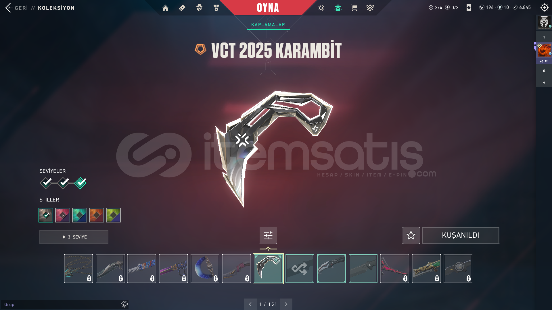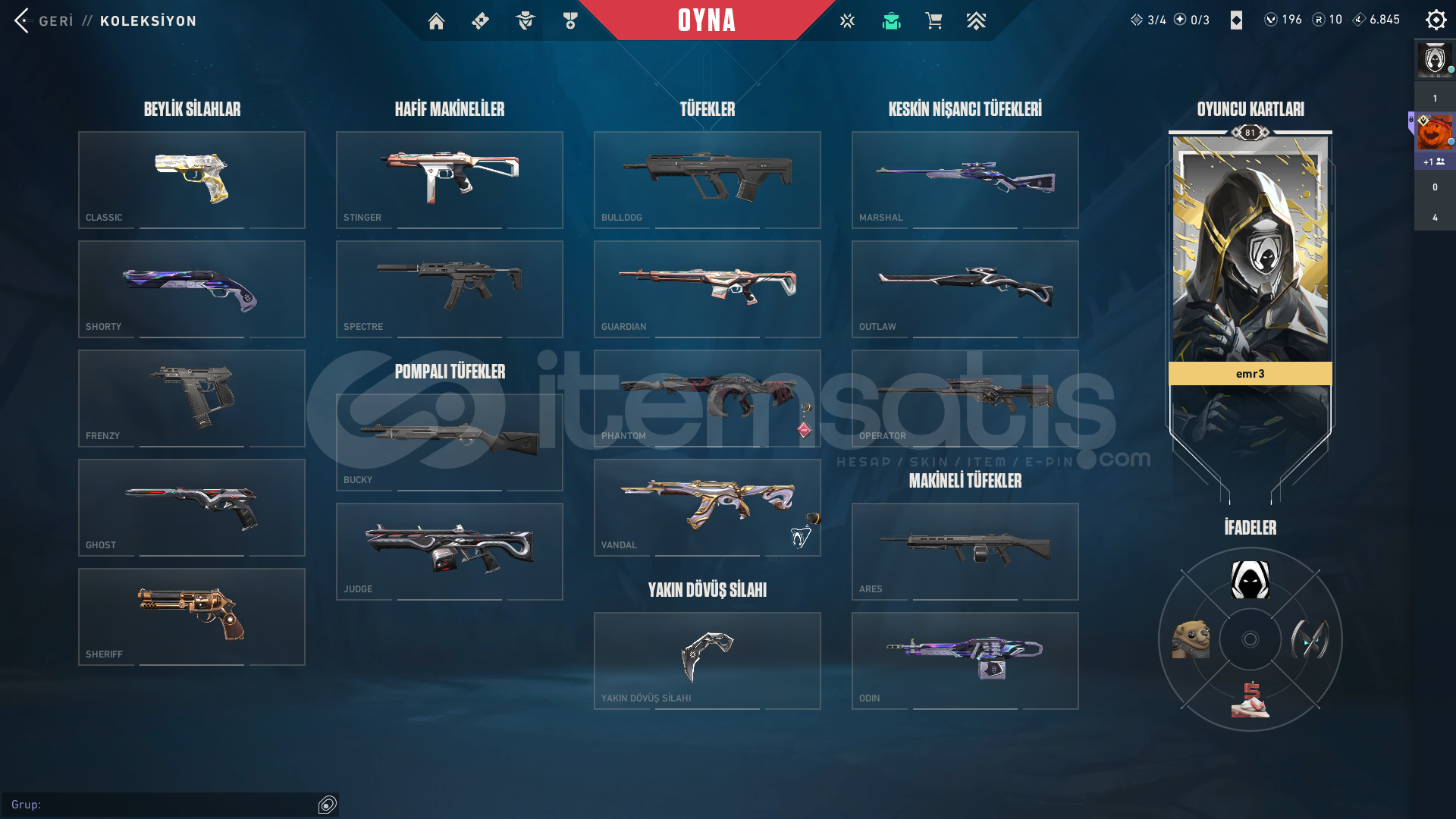 VCT 25 CLASSİCVCT 25 CARAMBİT+1 BIÇAK DAHACYRAX VANDALEJDERİN BUYRUĞU VANDALGAİA PHANTOMZİFİRİ PHANTOMKAOS OPERATOR,SİHİRPUNK SHERİFHESAPTA 1 KEZ SAVAŞ BİLETİ AÇILMIŞTIR+DİA 2 HESAPHESABIN TEK EKSİSİ İSİM KARTI YOK>PAZARLIK YAPILABİLİR ÇOK BOZMASSA
