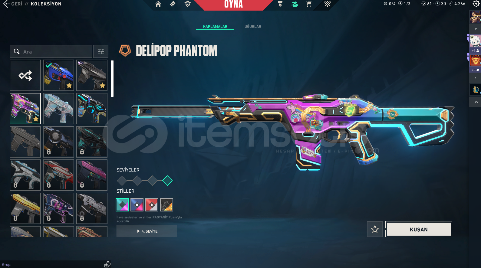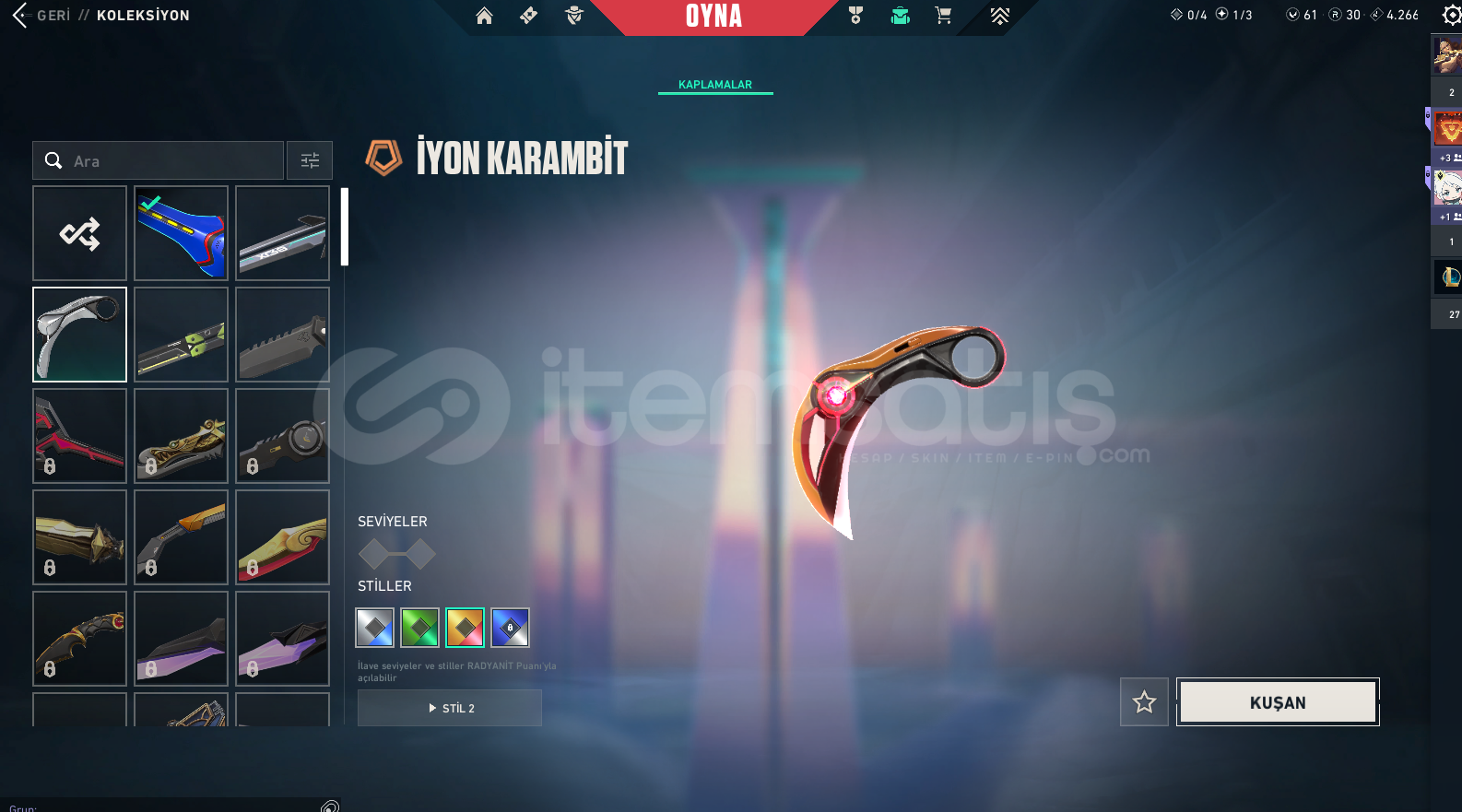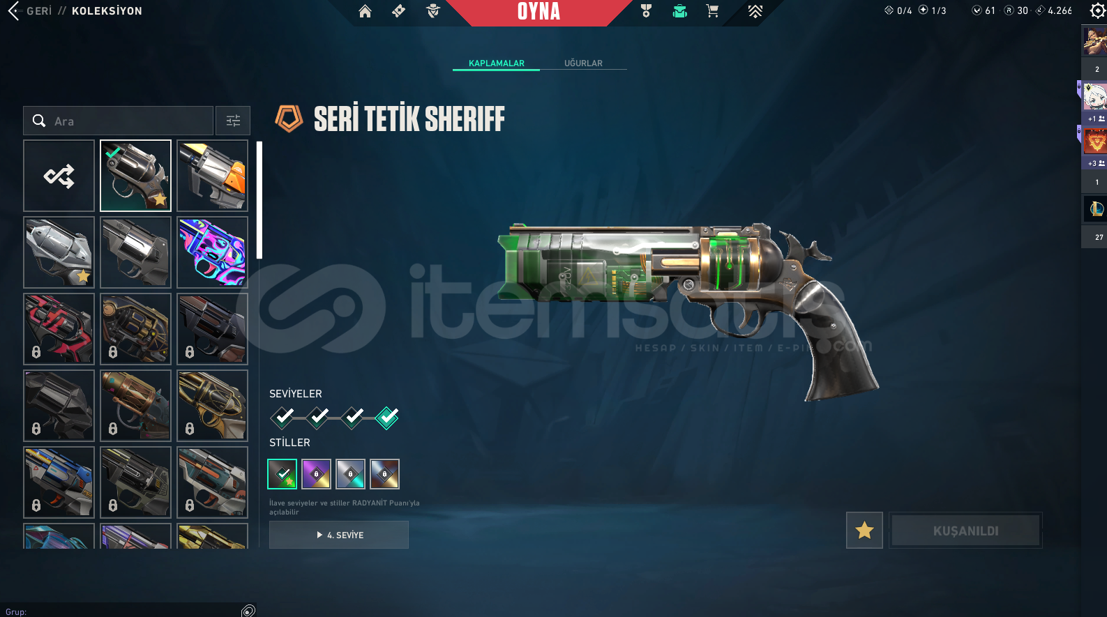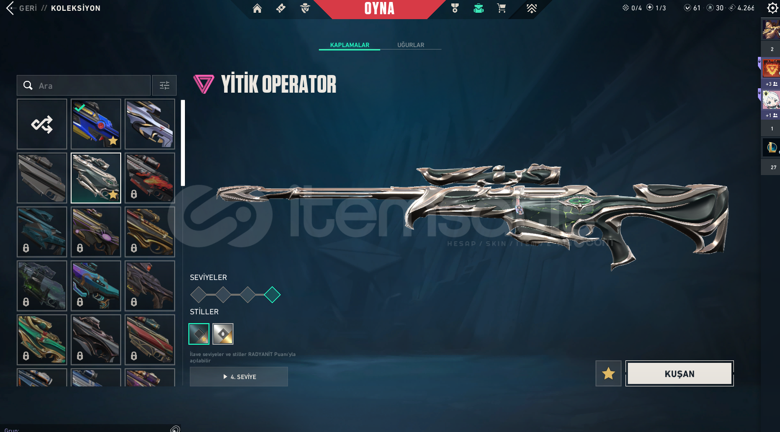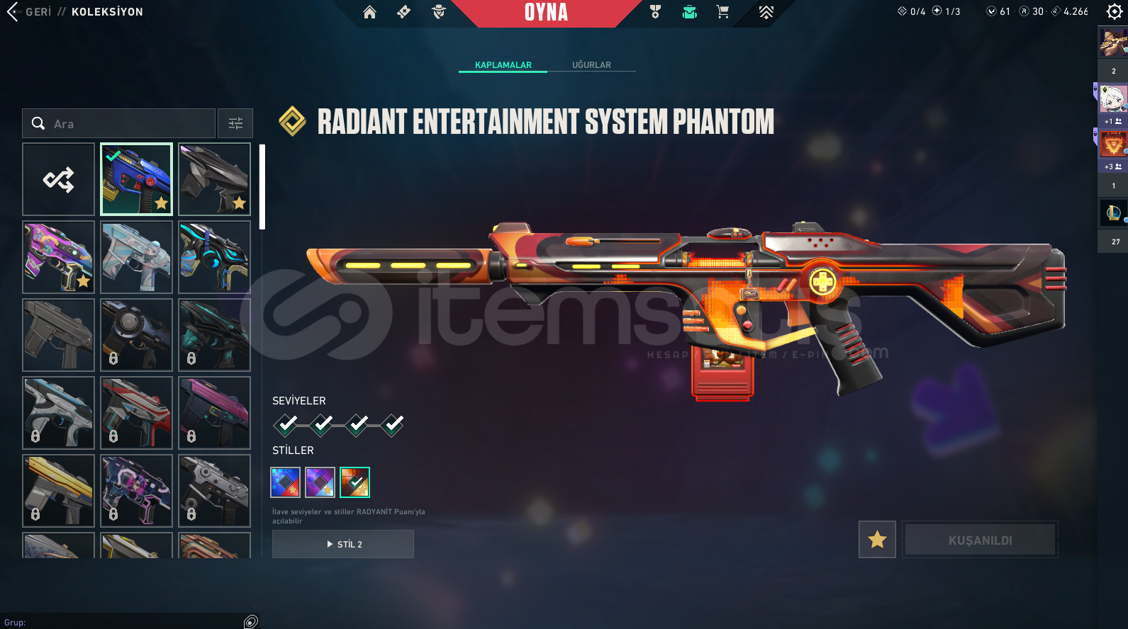 Radiant Ent. System Set, Yağmacı Vandal,Neptün Vandal, Yitik Vandal, İyon Vandal, Oni Vandal,  Champions Vandal,R.E.S Phantom, Delipop Phantom, Anomali Phantom,R.E.S. eldiven,Rgx pro kelebek, İyon karambit,R.E.S. op,Yitik op,Asil classic,Asil Guardian,Blastx Spectre,İyon Sheriff,Seri Tetik Sheriff,R.E.S. Ghost,Gaia Ghost,R.E.S. BulldogToplam 62 skin, 4 bıçak, Eskiden Dia olmuş hesap