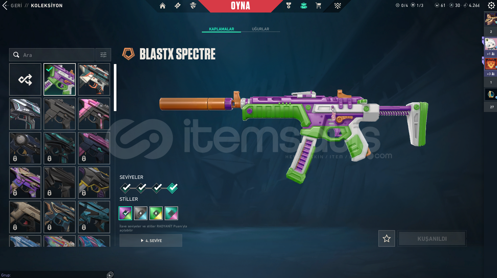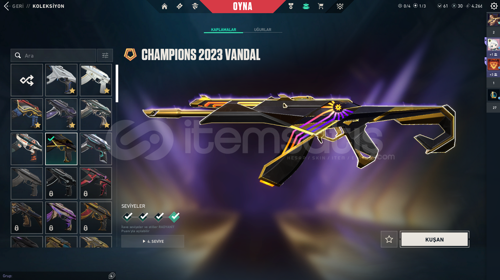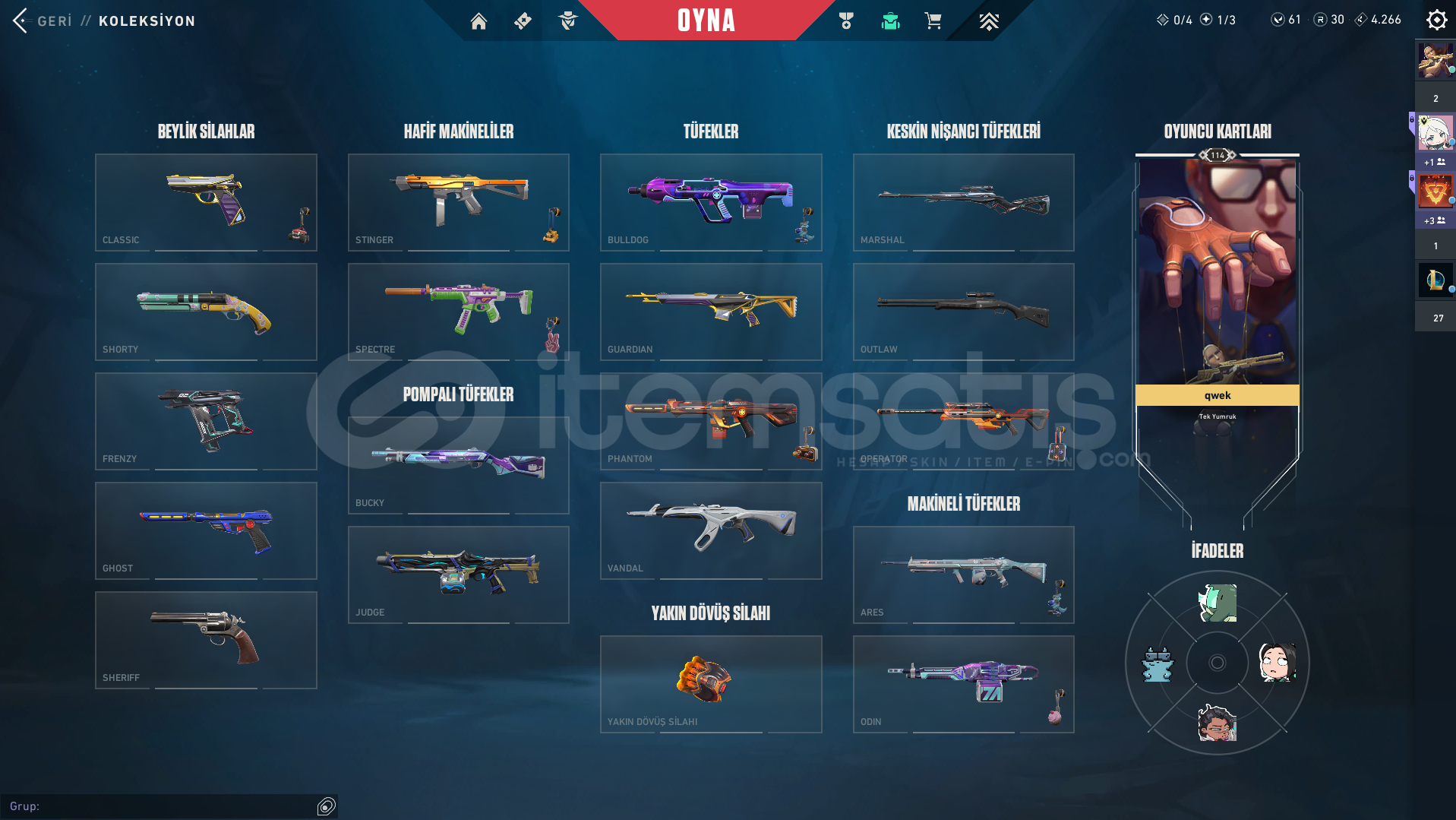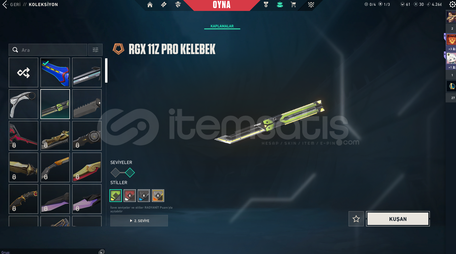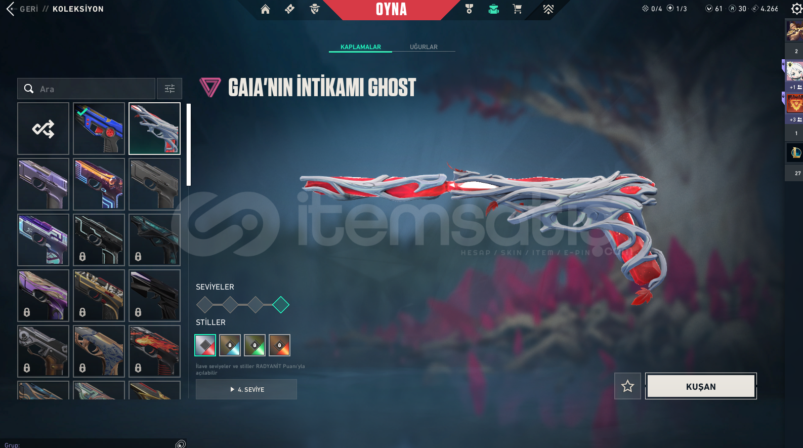 Radiant Ent. System Set, Yağmacı Vandal,Neptün Vandal, Yitik Vandal, İyon Vandal, Oni Vandal,  Champions Vandal,R.E.S Phantom, Delipop Phantom, Anomali Phantom,R.E.S. eldiven,Rgx pro kelebek, İyon karambit,R.E.S. op,Yitik op,Asil classic,Asil Guardian,Blastx Spectre,İyon Sheriff,Seri Tetik Sheriff,R.E.S. Ghost,Gaia Ghost,R.E.S. BulldogToplam 62 skin, 4 bıçak, Eskiden Dia olmuş hesap