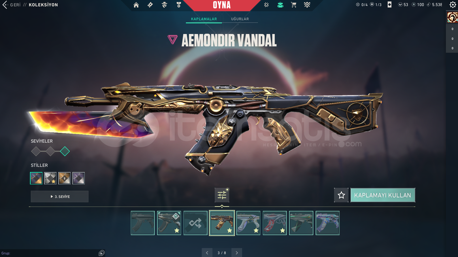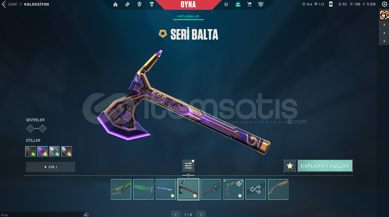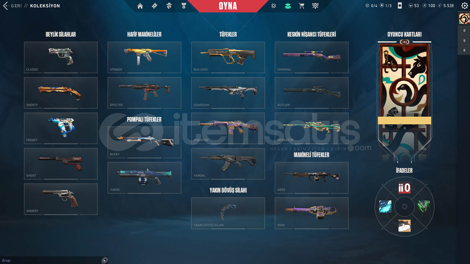 -Yitik Classic-Seri Tetik Sheriff-Sihirpunk Sheriff-Özel Harekat Spectre-Yağmacı Guardian-Seri Tetik Phantom -Zamanın Ötesi Vandal-Aemondır Vandal-Evori Vandal-Gaia'nın İntikamı Vandal-Seri Tetik Marshal-Ejderin Buyruğu Operator-Seri Tetik Odin-Rgx 11z Pro Karambit-Seri Tetik Balta-Savaş Bileti Skinleri -Mail Değişimi Yapılacaktır