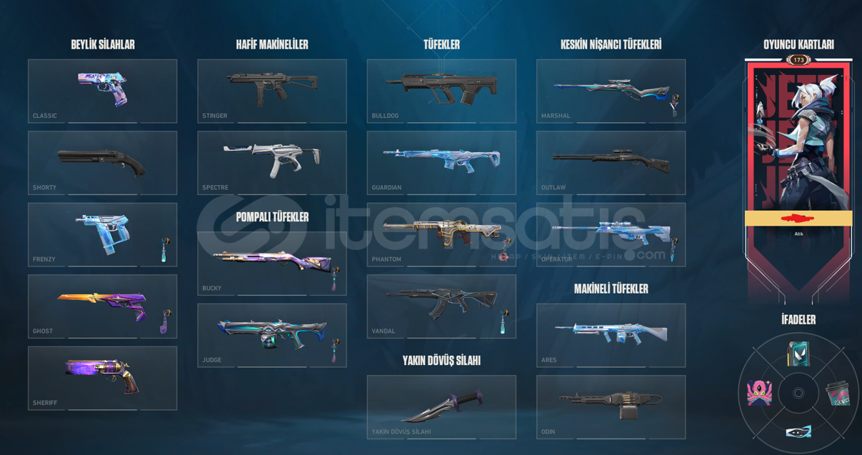 HESAP 170+ LEVELDİR,rankı Gold 1'dirBütün Ajanlar Açıktır,hesapta 359 vp 125 radyanit bulunmaktadır,mail, tel üzerinize yapılır,hesaptaki skinler;rgx vandal,ion vandal,İon spectre,oni phantom,seri tetik şheriff,yağmacı bıçak,geri kalanlar battlepass'lerAlana Şimdiden Hayırlı olsun.(isim değişme hakkı 27'sinde geliyor)