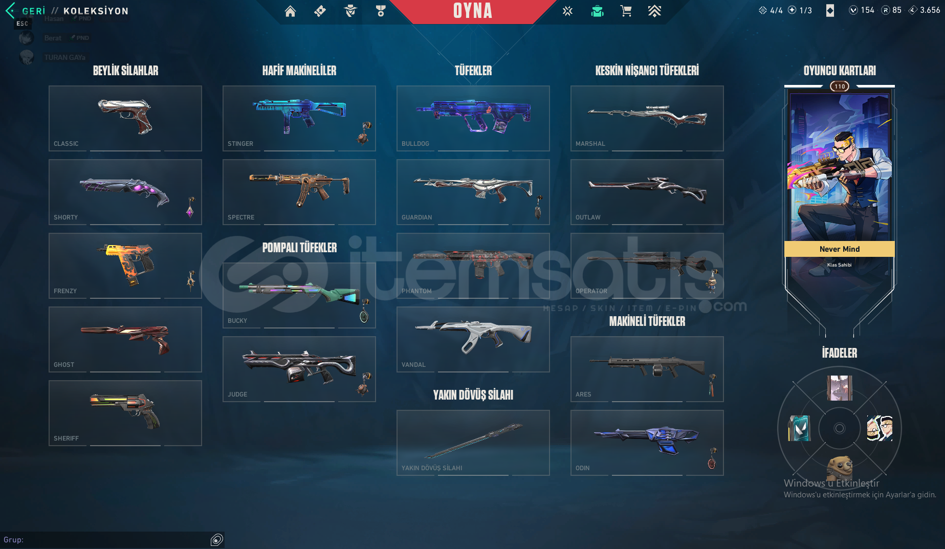 Valorant tarafında İyon vandal Sürat Canvarı vandal Phantom olarak Özel harekat ve Asil Spectre olarak Sihirpunk Ghost olarak anomali bıçak olarak RGX Katana ve Kuronomi no yaiba ve BP skinleriHesapta 148 Kostüm olup Amiral Savaş tavşanı MF Anniemo Hextech Annie Yükselen Efsane Vayne ve dahası olmak üzere hesapta nadir skinler vardır hesap 2016 da açılmış olup Riot kızı tristana Riot Kayl...