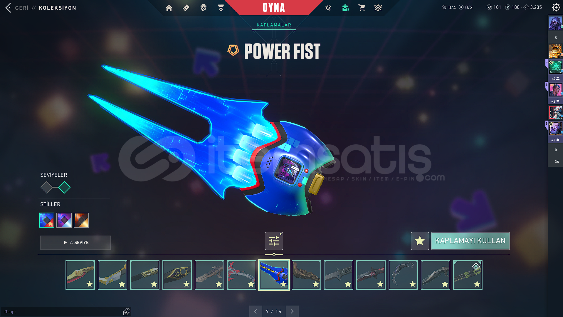 Bıçak:yağmacı karambit,alaz yelpaze,asil karambit,champions22,champions23,ejder ateşi hançer,gaia balta,power fıst,rgx karambit,semavi yelpaze,uzaylı avcısı,vct lock in,yitik hançer+savaş bileti