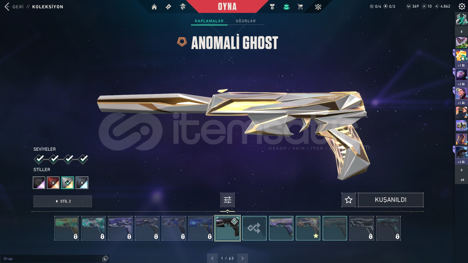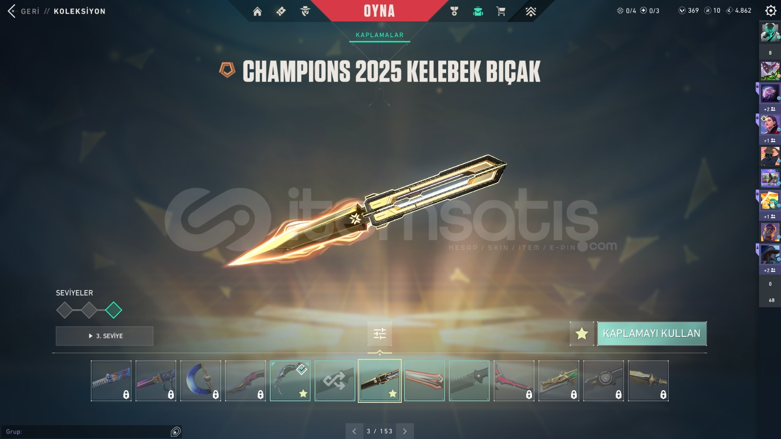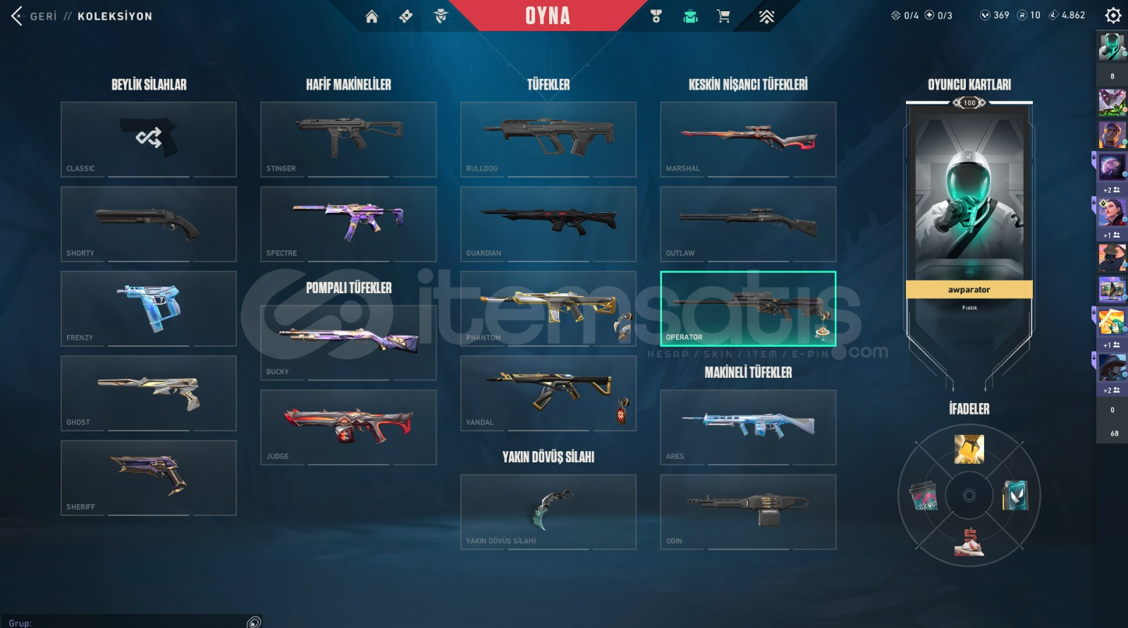 Hesap bilgileri:Seviye = 100Rank = Bronz 1Kullanıcı Adı = awparator #1212Hesaptaki Ekinler:Ghost =AnomaliSherrif =KuronomiGuardian =Yıldız BelasıPhantom =Asil, Özel Harekat, YağmacıVandal =Champions 2025, Kaos'un başlangıcıOperatör =KaosBıçaklar =2025 Champions Kelebek, Yağmacı Karambit