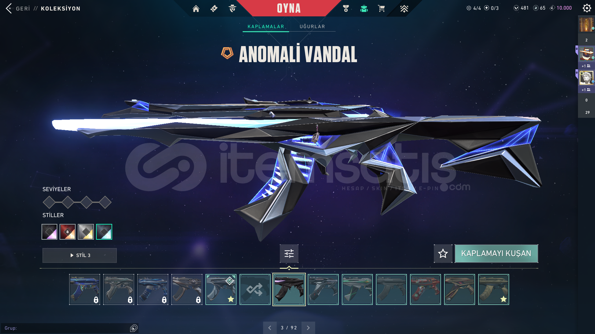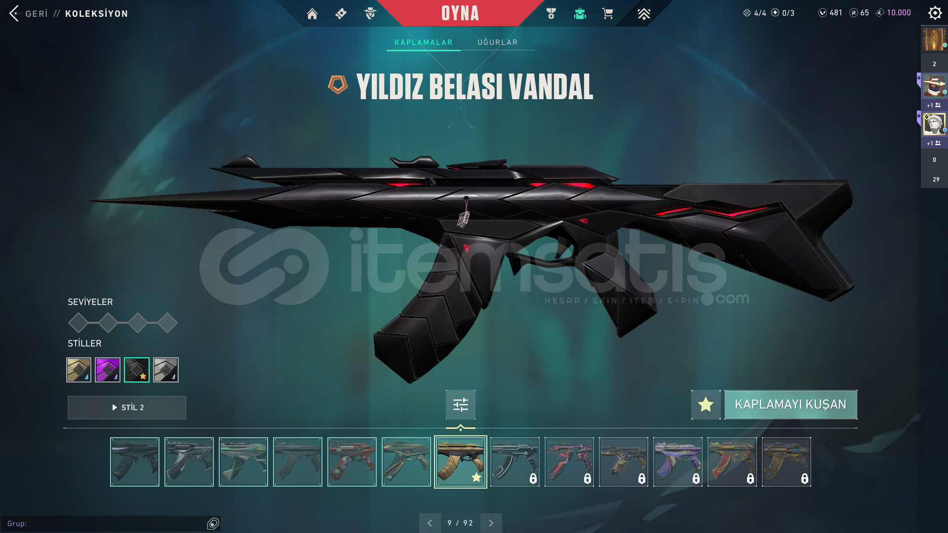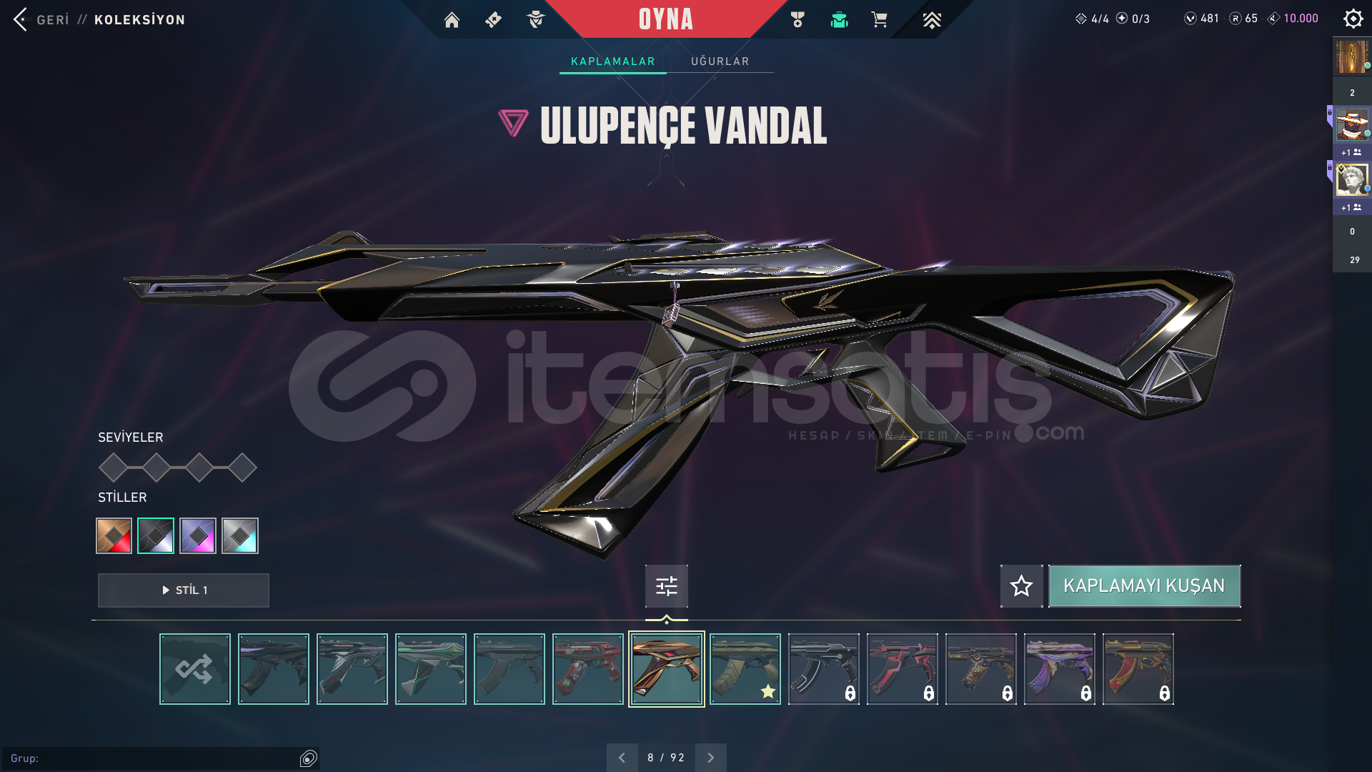 Hesapta 500 vp bulunmaktadır. İlk göz ağrım temiz mmr lı Elmas 3 hesap.Classic: Vct x prx classic (6 tane bp)Shorty: 4 tane bpFrenzy: Delipop frenzy (3 tane bp)Ghost: Anomali, Gaia (4 tane bp)Sheriff: Sırçiçeği (5 tane bp)Stinger: Sürat canavarı (4 tane bp)Spectre: Asil spectre (5 tane bp)Bucky: Sürat canavarı (3 tane bp)Judge: Sırçiçeği (2 tane bp)Bulldog: Spectrum (3 tane bp)Guardian: 5 tane bpPha...