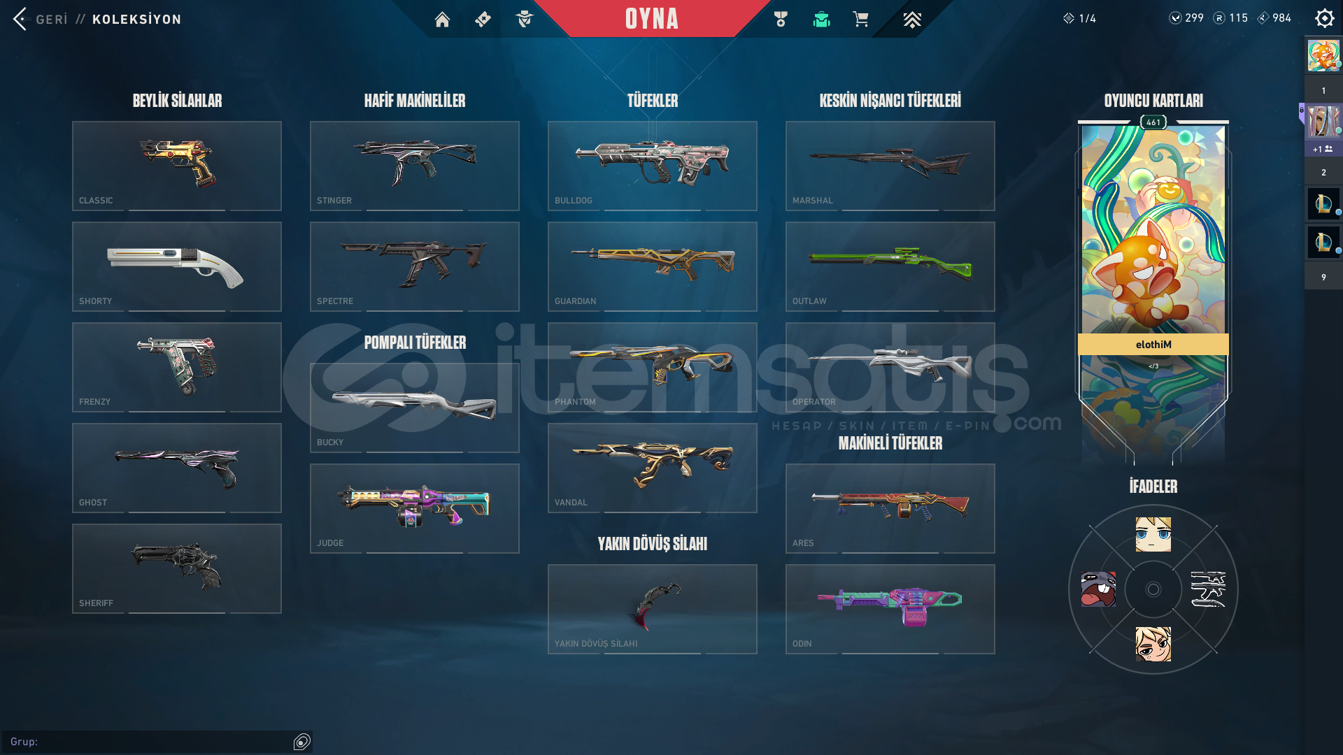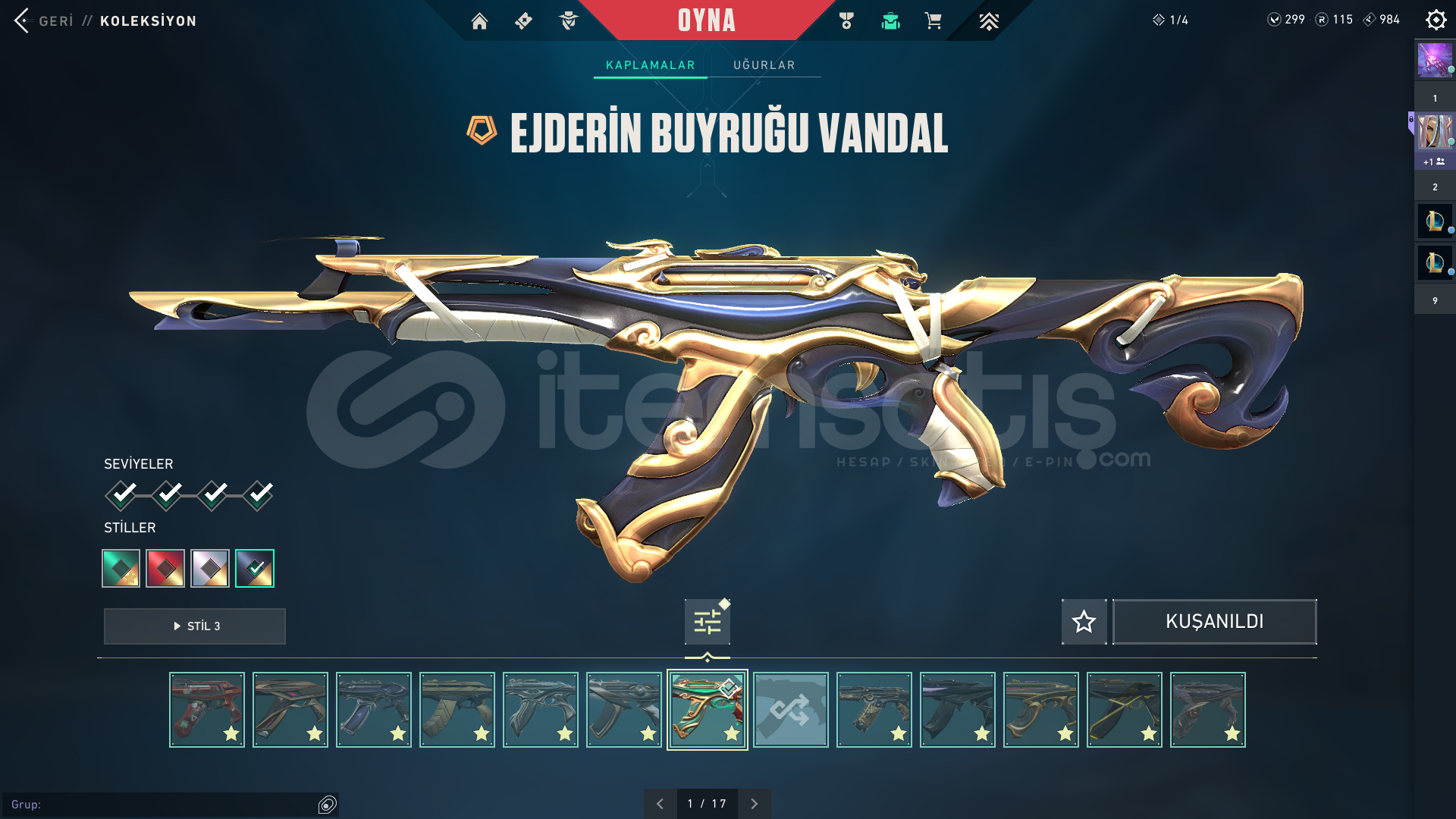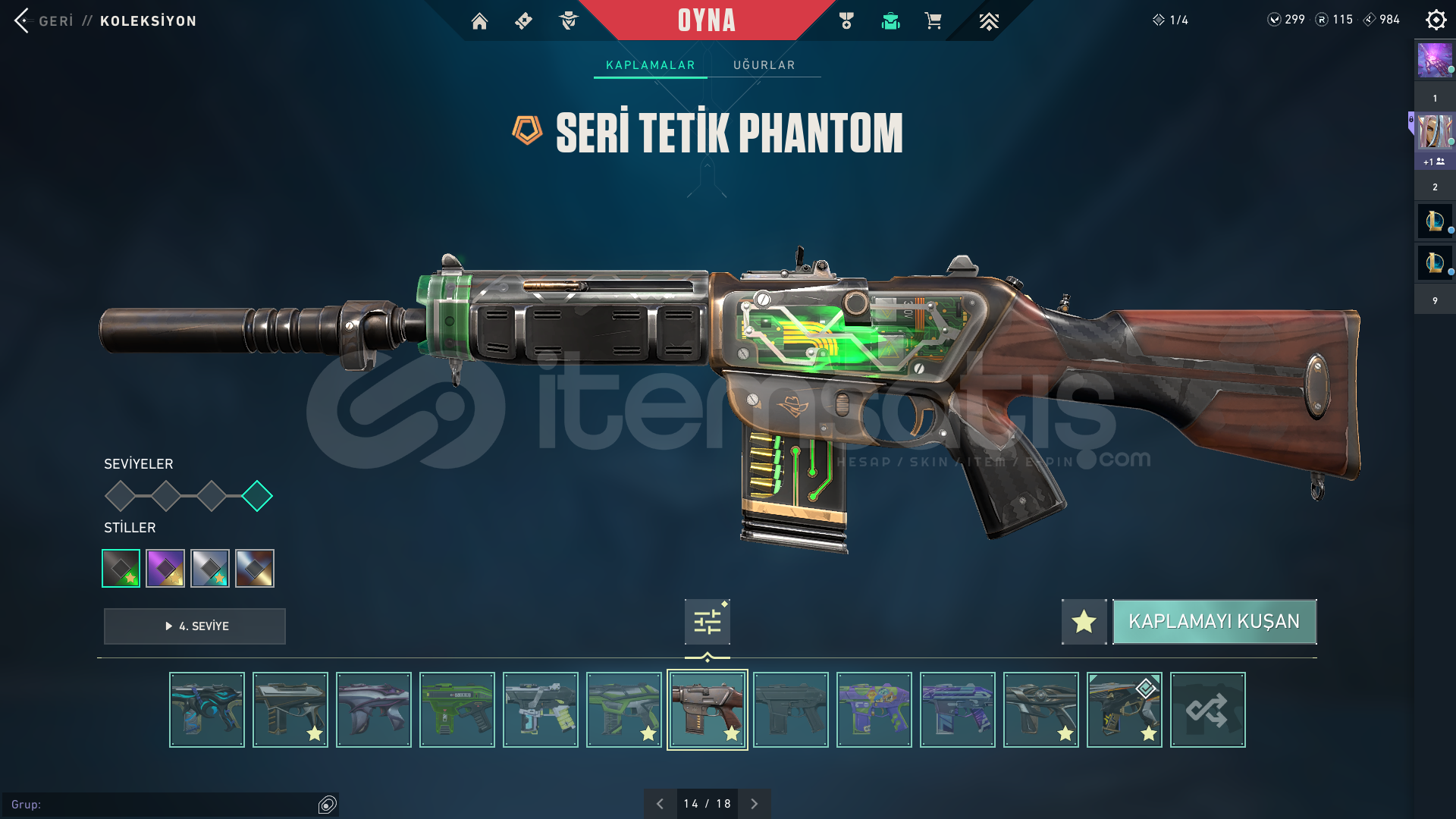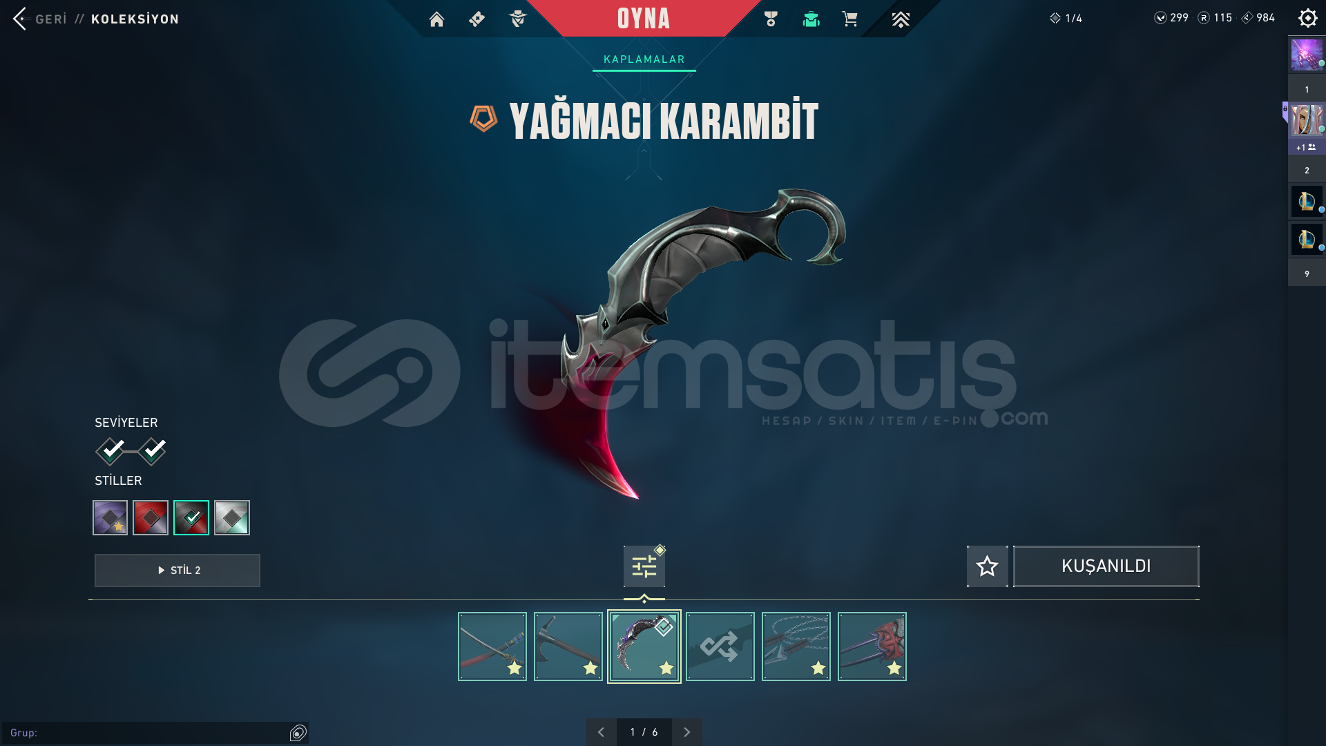 Vandal(16 Animasyonlu Skin Mevcut): YıldızBelası - Champions 2023 - Zamanın Ötesi - Ejder Ateşi - Yitik - Ejderin Buyruğu - Kuronami - Oni - Sürat Canavarı -Kaosun Başlangıcı - Yağmacı - Cesur Yürek - Ulupençe - İyon - Aemondir - AnomaliPhantom(5 Animasyonlu Skin Mevcut): Zamanın Ötesi - Seri Tetik - RGX - Işık Muhafızı - Champions 2024Bıçaklar(5 Animasyonlu Skin Mevcu...