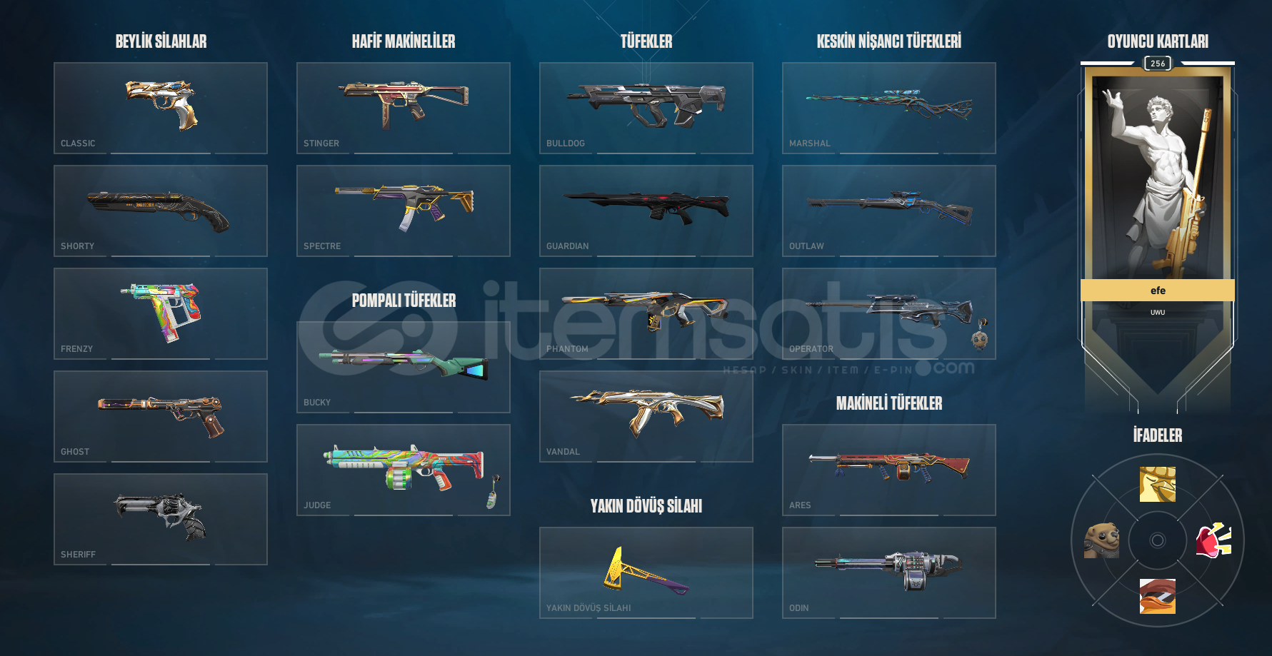 256 seviye hesap. Rank Gold3 (anlık battlepass aktiftir) ilgilenenler dm.Classic: Asil, YitikShorty: BattlepassFrenzy: BattlepassGhost: SihirpunkSherrif:Kuronami ve YağmacıStinger:BattlepassSpectre:AsilBucky:BattlepassJudge:BattlepassBulldog:ProtokolGuardian:Yıldız belasıMarshall:GaiaOutlaw:RGXOperatör:Cesur yürekAres:OniOdin:Seri tetikPhantom:İyon, Asil, RGX, Champions 2024Vandal:Oni, Asil, Yağmacı, Yitik, Champions 2023, Kaos, Faz koruyucu...