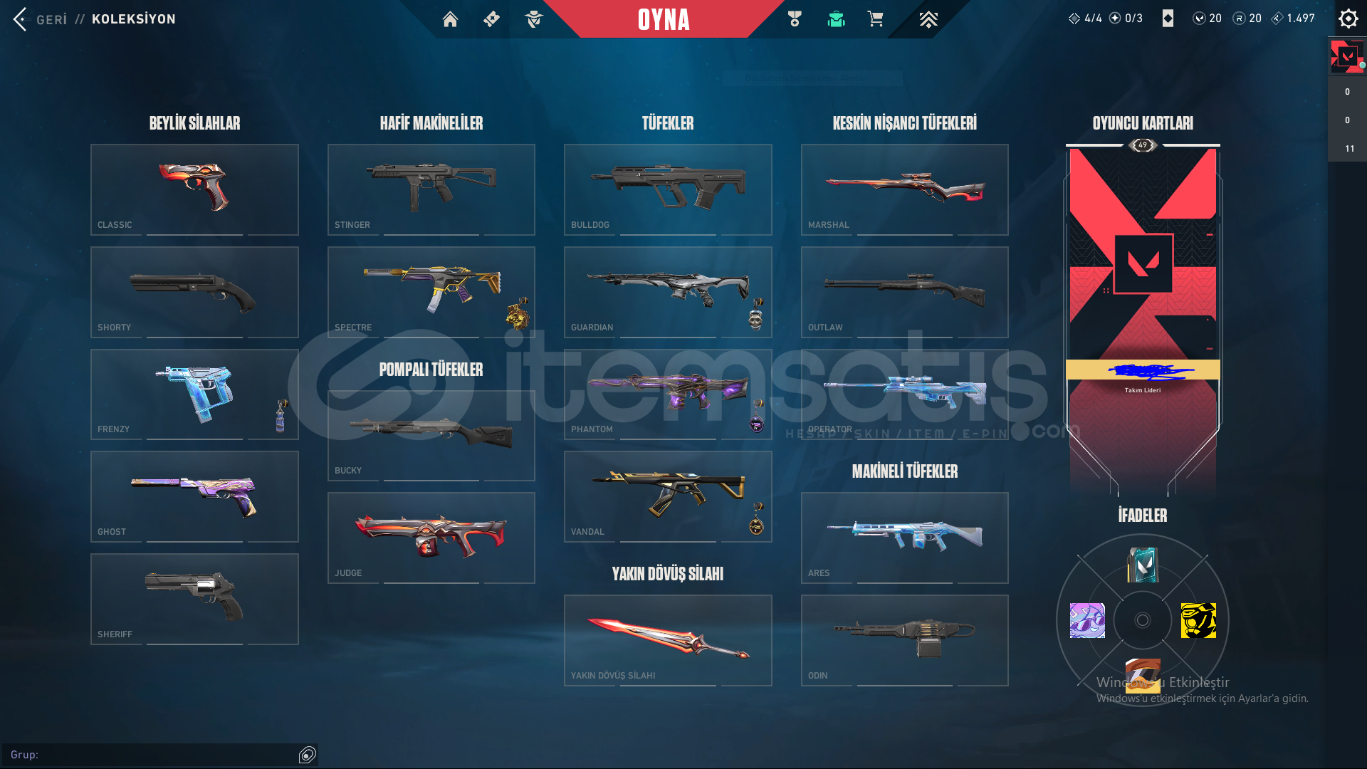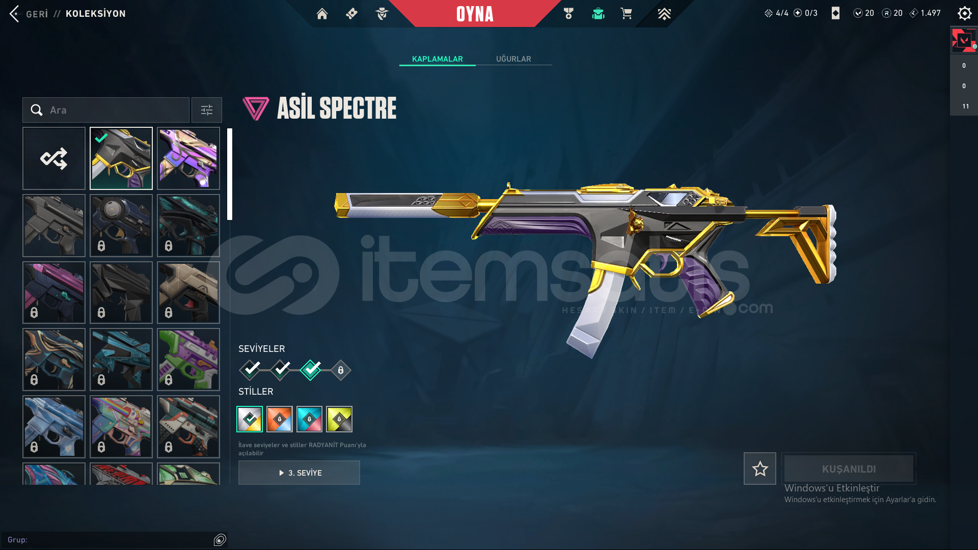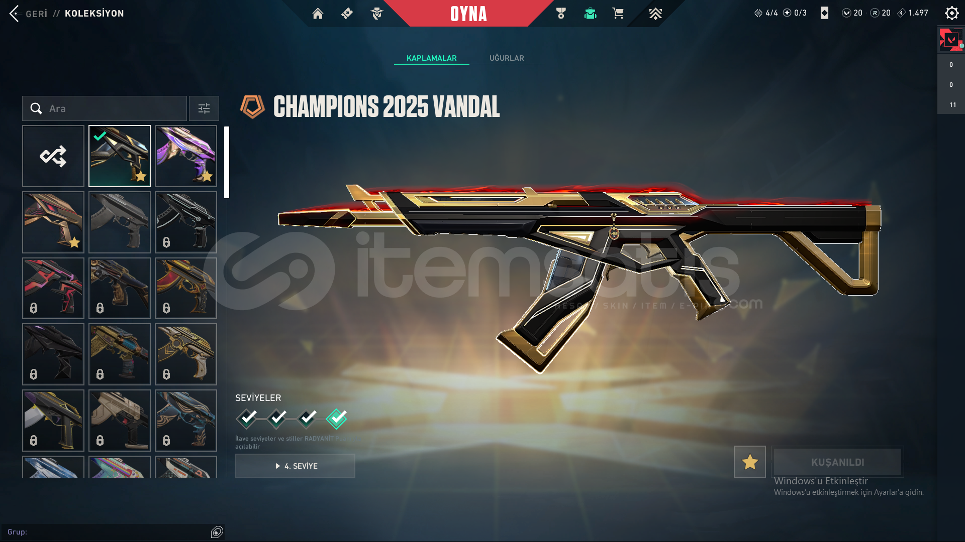 Hesaptaki Skinler:Champions VandalUlu Pençe VandalAfet PhantomYağmacı GuardianAsil Spectre1 Battle Pass Skinleri