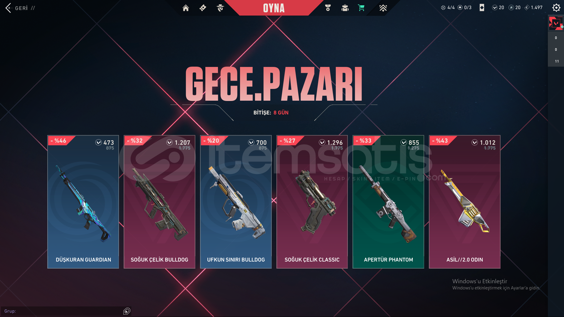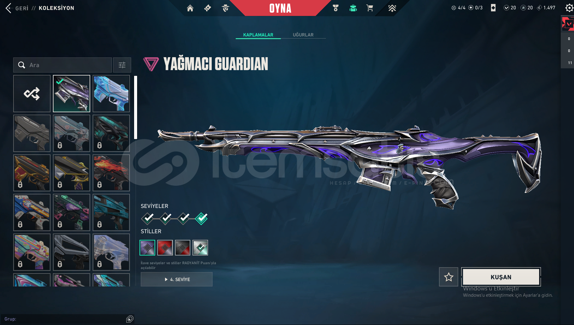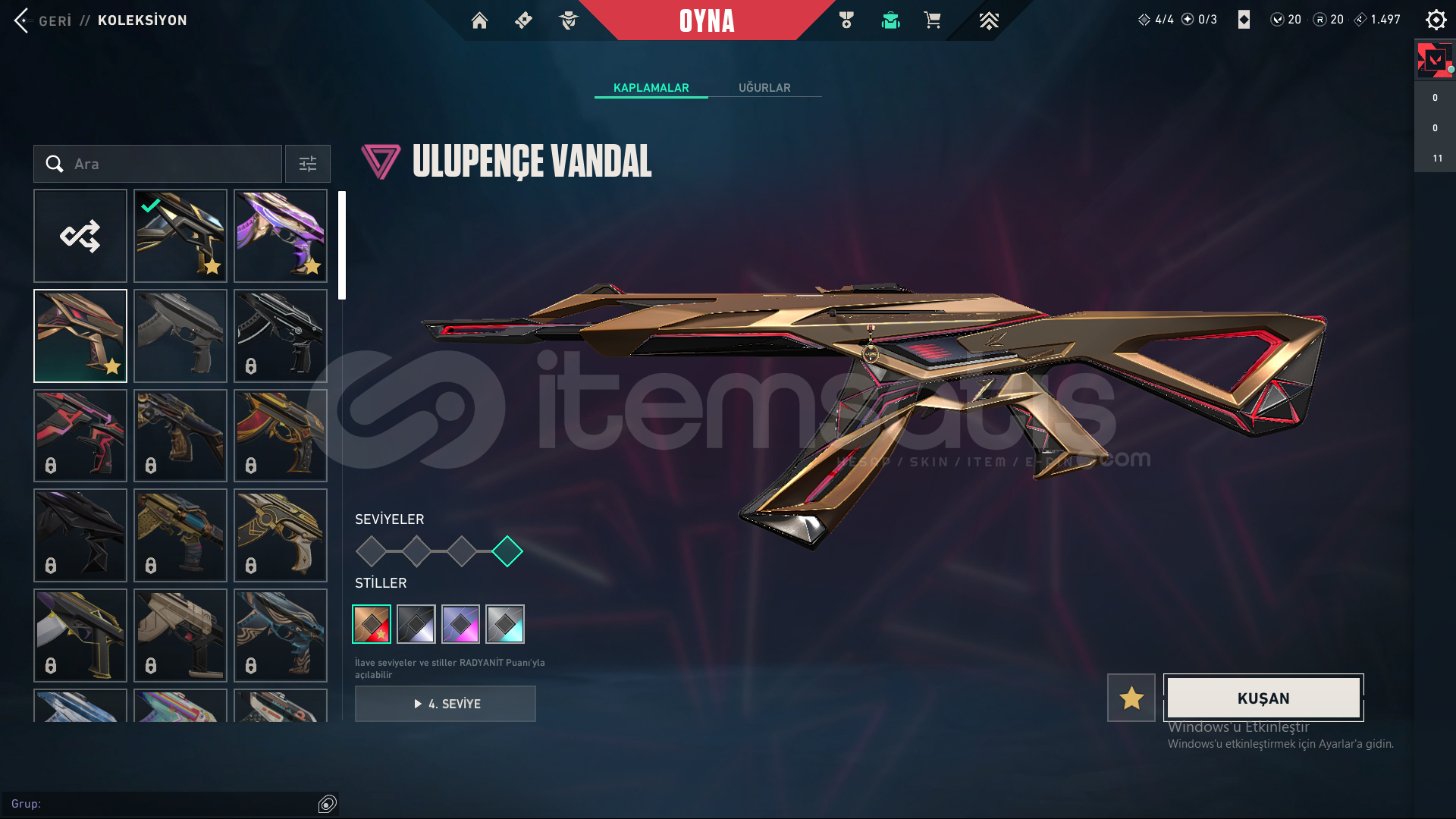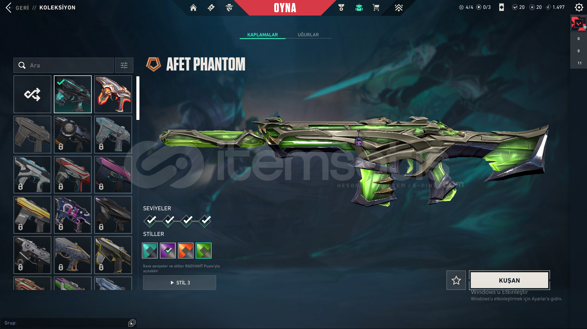 Hesaptaki Skinler:Champions VandalUlu Pençe VandalAfet PhantomYağmacı GuardianAsil Spectre1 Battle Pass Skinleri