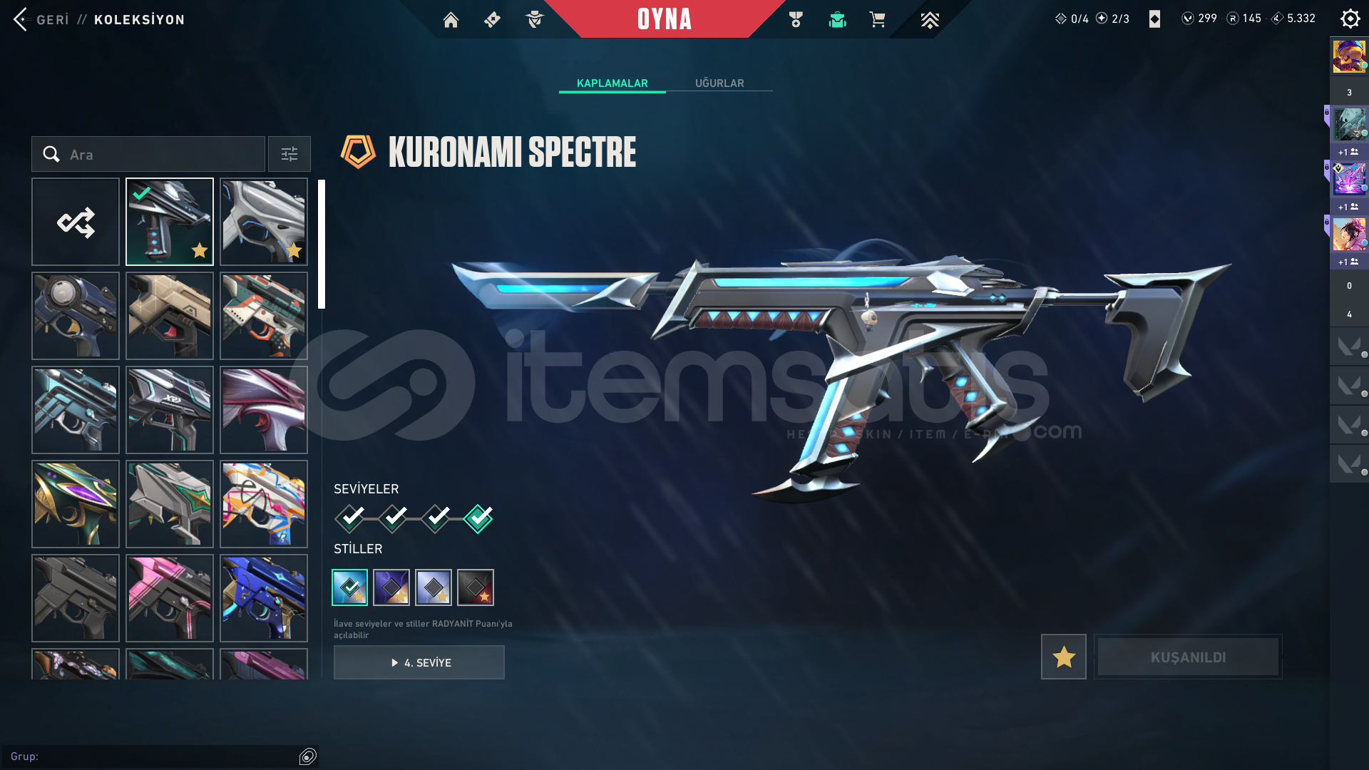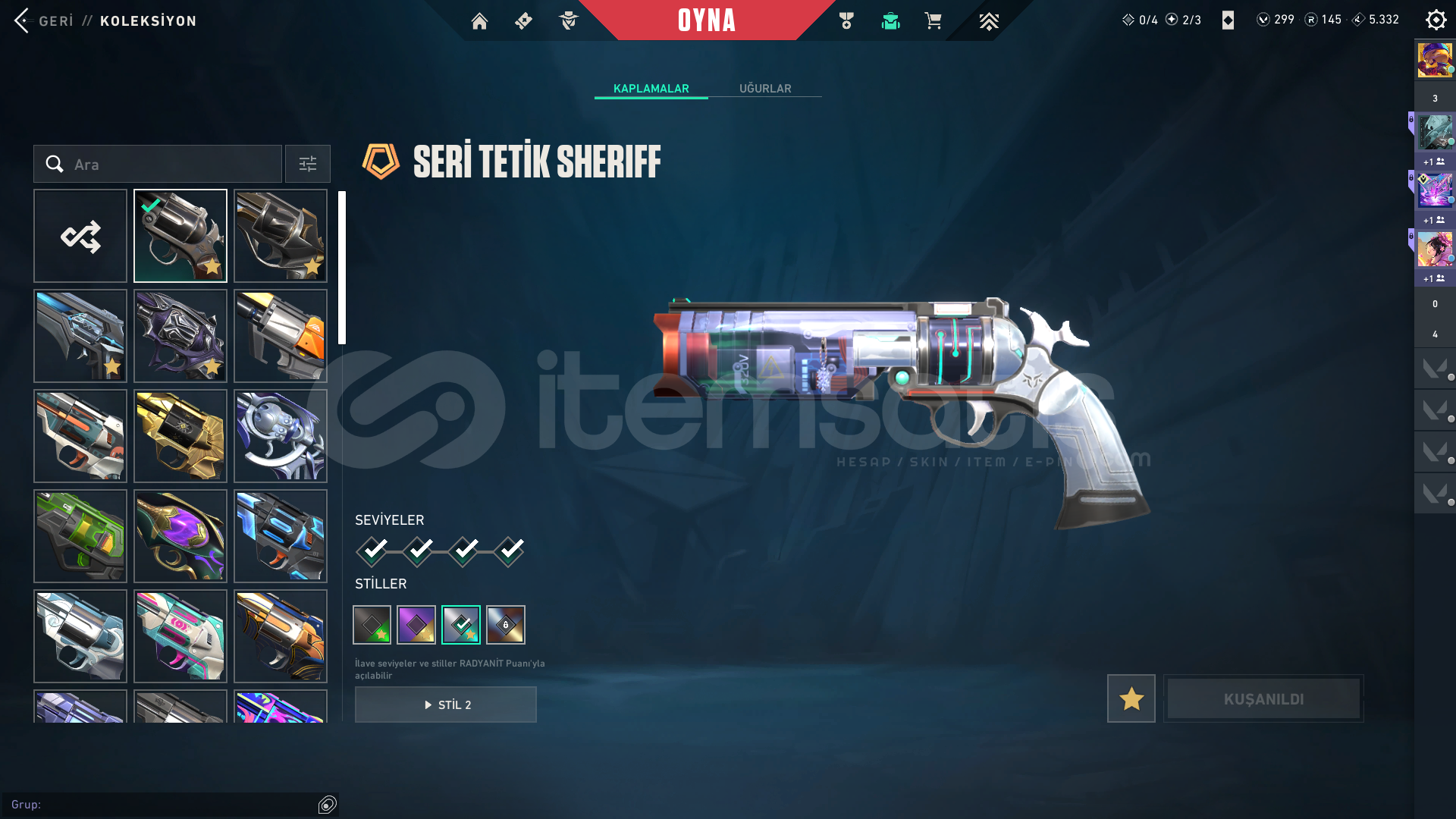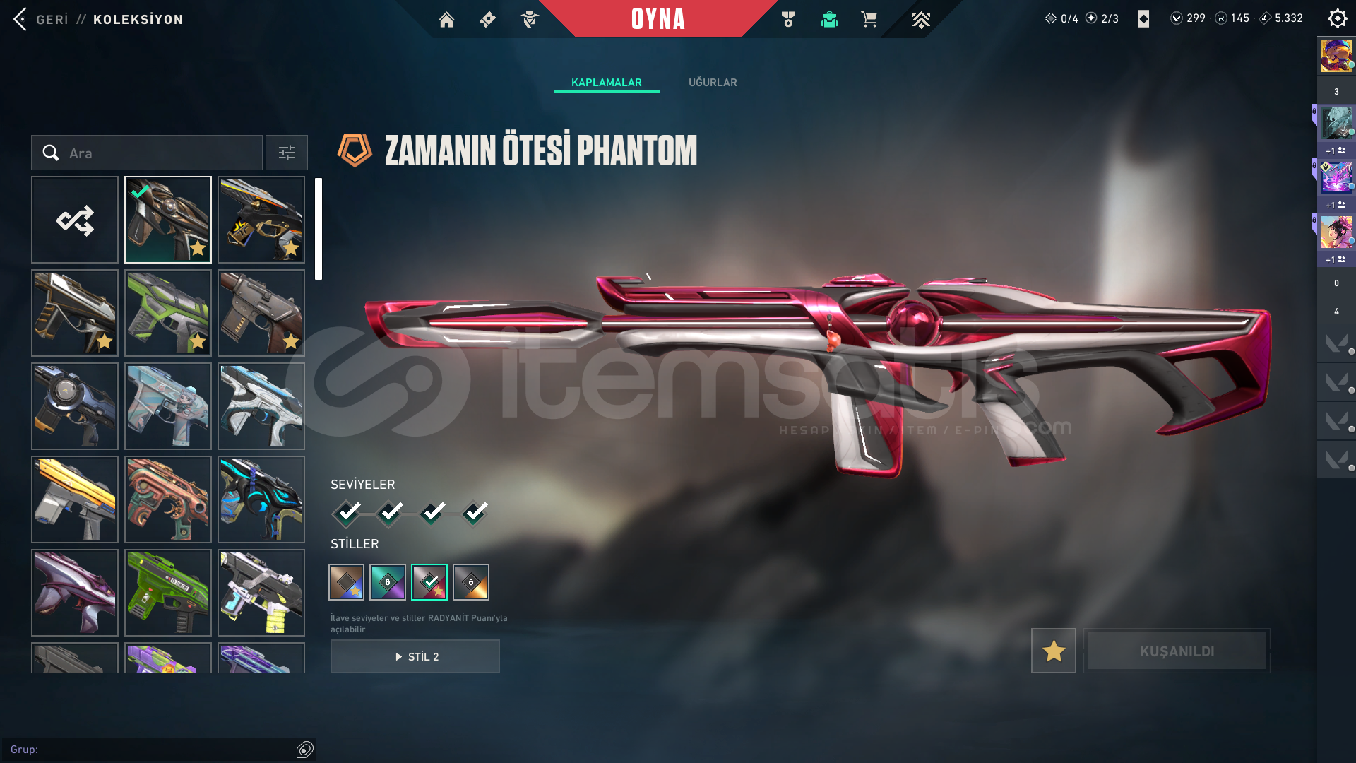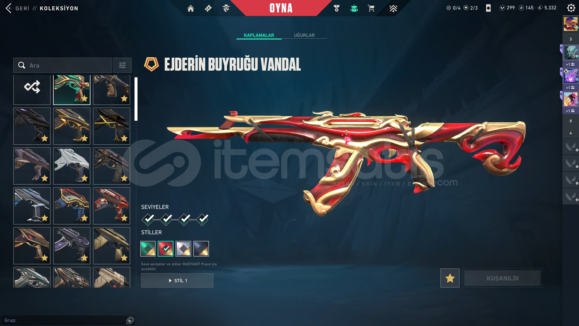 Vandal(16 Animasyonlu Skin Mevcut): YıldızBelası - Champions 2023 - Zamanın Ötesi - Ejder Ateşi - Yitik - Ejderin Buyruğu - Kuronami - Oni - Sürat Canavarı -Kaosun Başlangıcı - Yağmacı - Cesur Yürek - Ulupençe - İyon - Aemondir - AnomaliPhantom(5 Animasyonlu Skin Mevcut): Zamanın Ötesi - Seri Tetik - RGX - Işık Muhafızı - Champions 2024Bıçaklar(5 Animasyonlu Skin Mevcu...