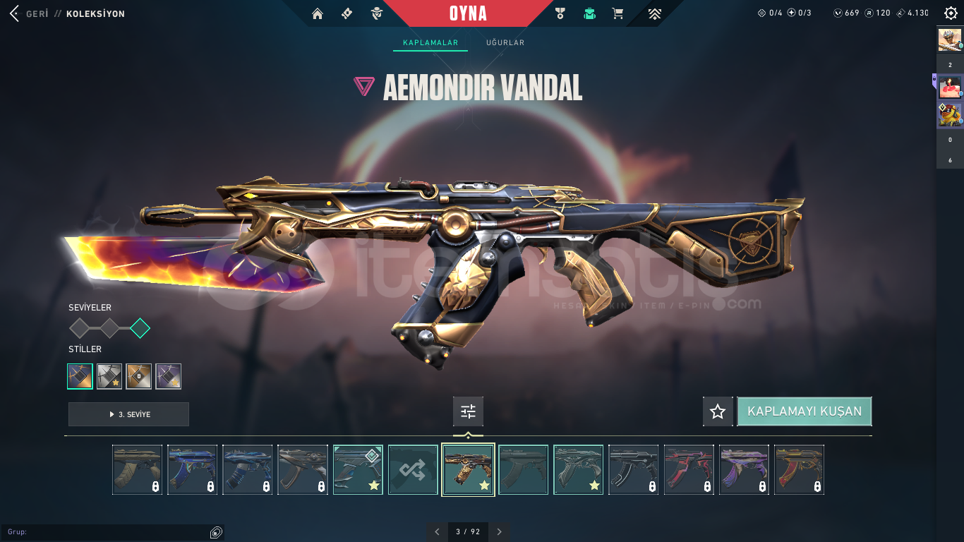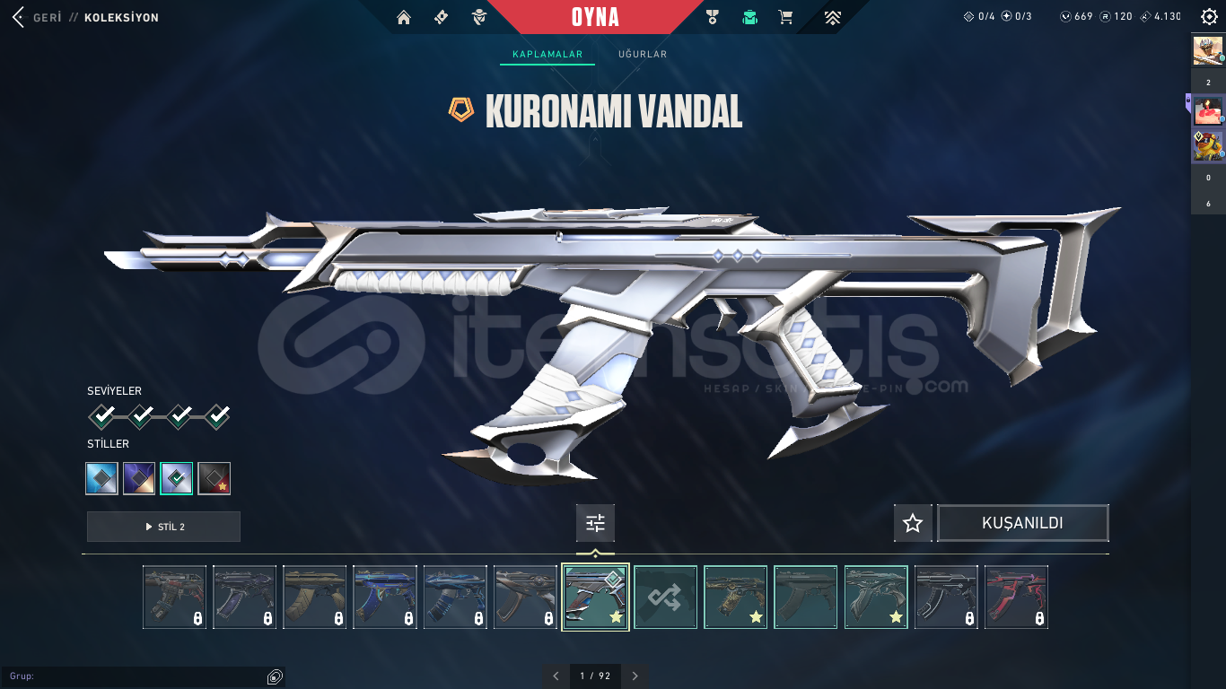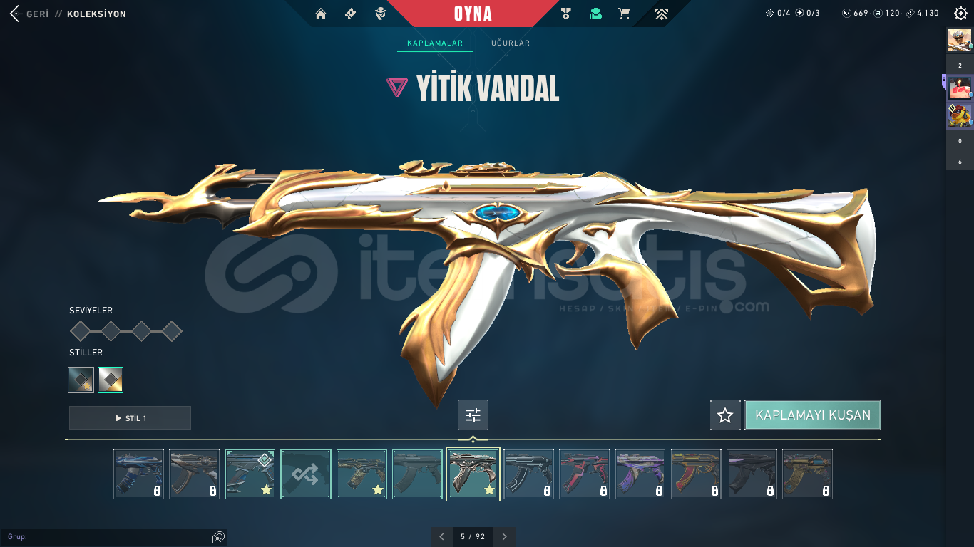 Skinler:Kuronami VandalAemondir VandalYitik VandalFatih PhantomYağmacı GhostRGX KarambitAçıklama: Ranked açıp keyfi oynanmıştır, alan kişiye maili de verilecektir. Hesaptaki skinlerin tüm renkleri ve seviyeleri açıktır, alıp keyfini çıkarmalık hesap. İçerisinde 660VP ve 120 Radyanit mevcut. Hesaba yatırılan VP tutarı hesap edilip fiyat biçimlendirilmiştir. C...