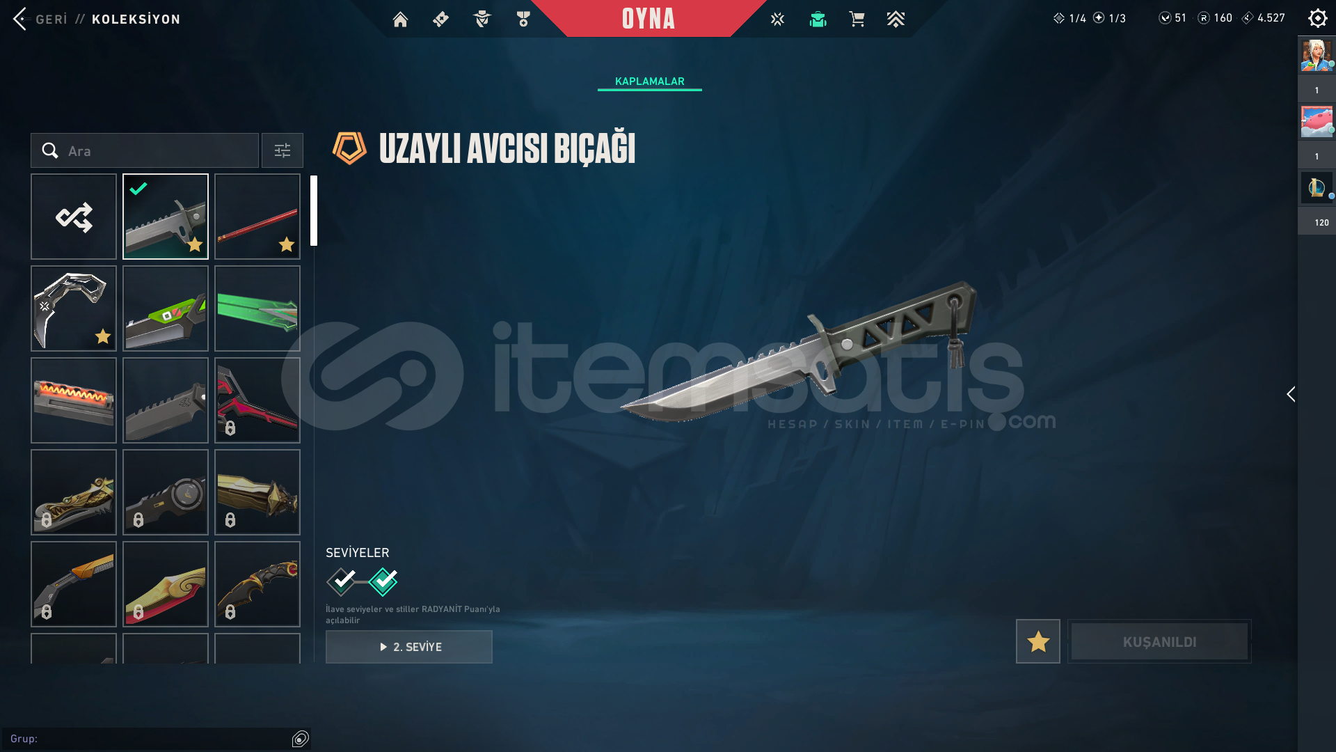 hesapta uzay avcısı bıçak + vct karambit 6 bıçak deseni kuronomi vandal vb birsürü skin vardır