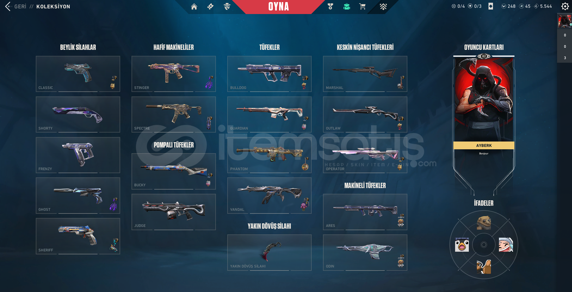 içinde yok yok hafta sonuna özel güzel indirimlerle oyun keyfi sizi bekliyor. İçerisinde isteyeceğiniz her skin var ve vandal da 2 phontomda 2 sherifte 2 bıçakta 2 ve dahası olmak üzere çok güzel animasyonlu skinlerimi var alıcısına şimdiden hayırlı olsun.