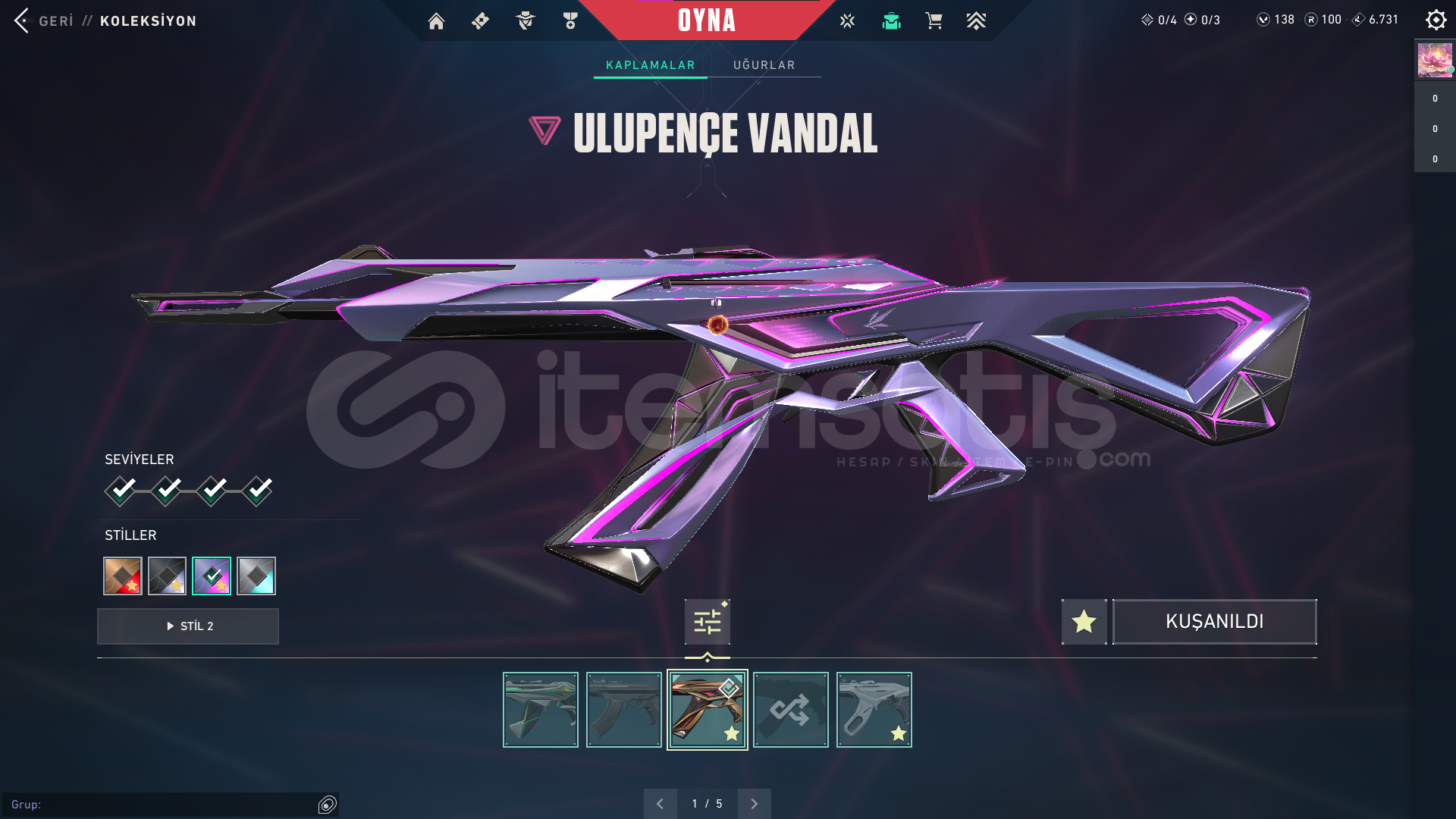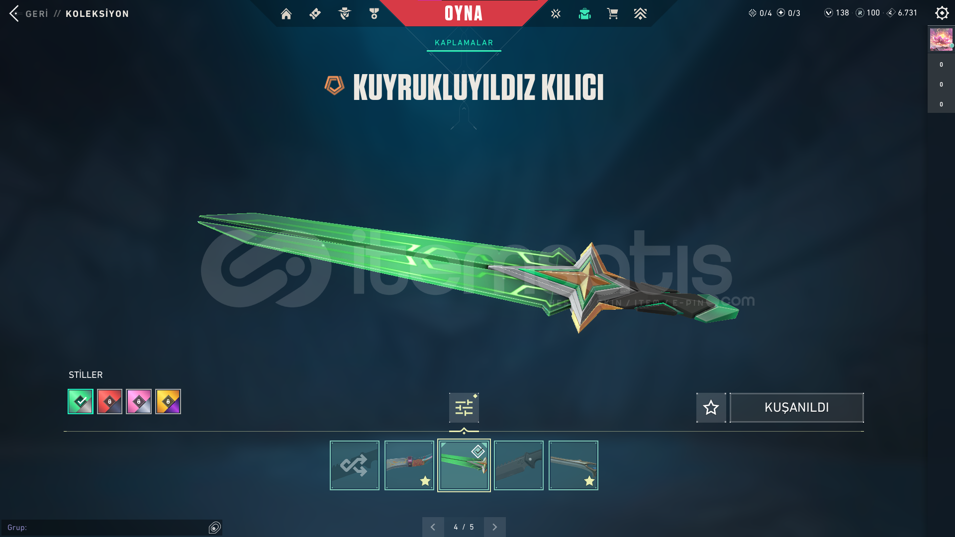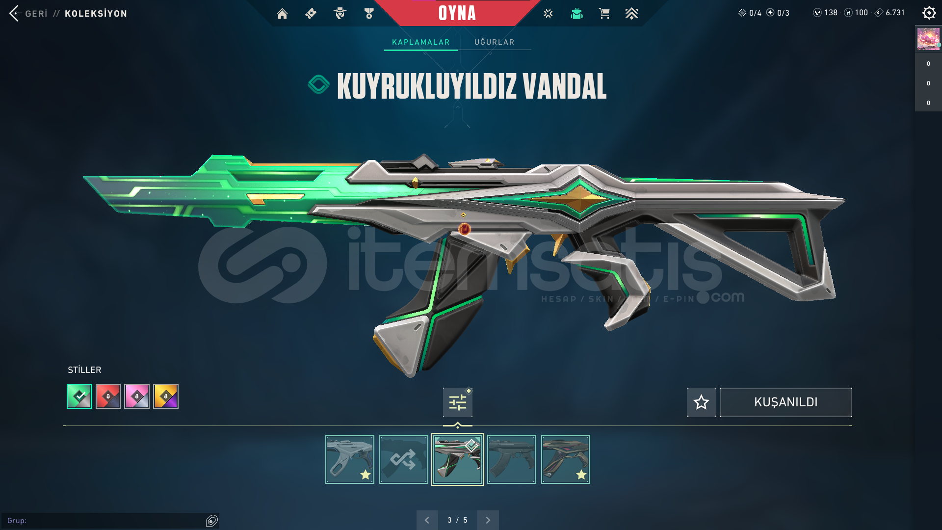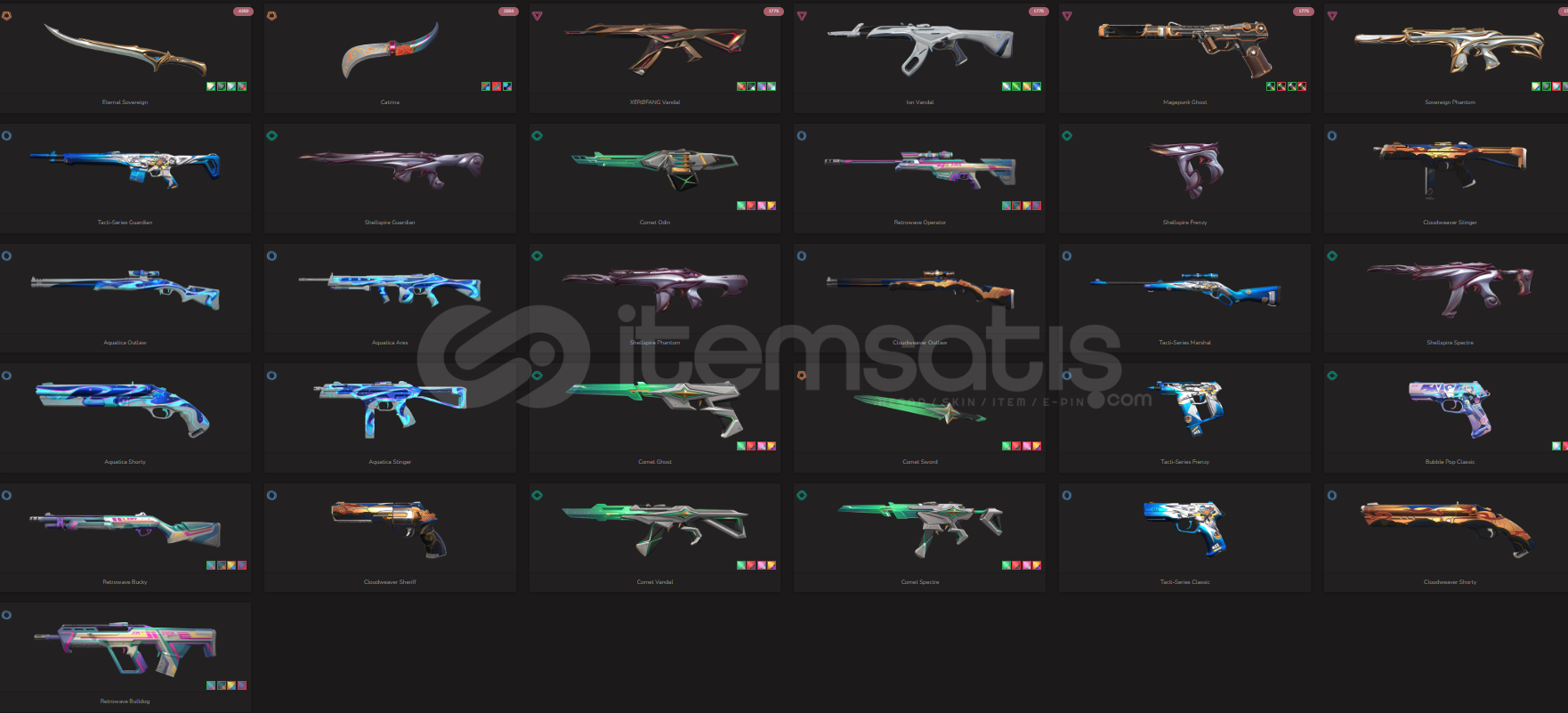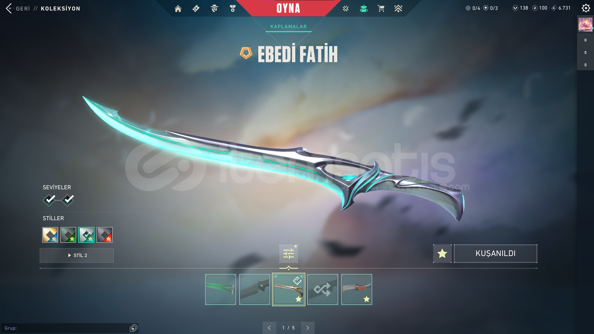 ⭐ Hesapta Ebedi Fatih , Katrina , Kuyrukluyıldız Kılıcı , Ulupençe Vandal , Iyon Vandal , Sihirpunk Ghost , Fatih Phantom , Kuyrukluyıldız Vandal gibi toplamda 31 skin bulunuyor.