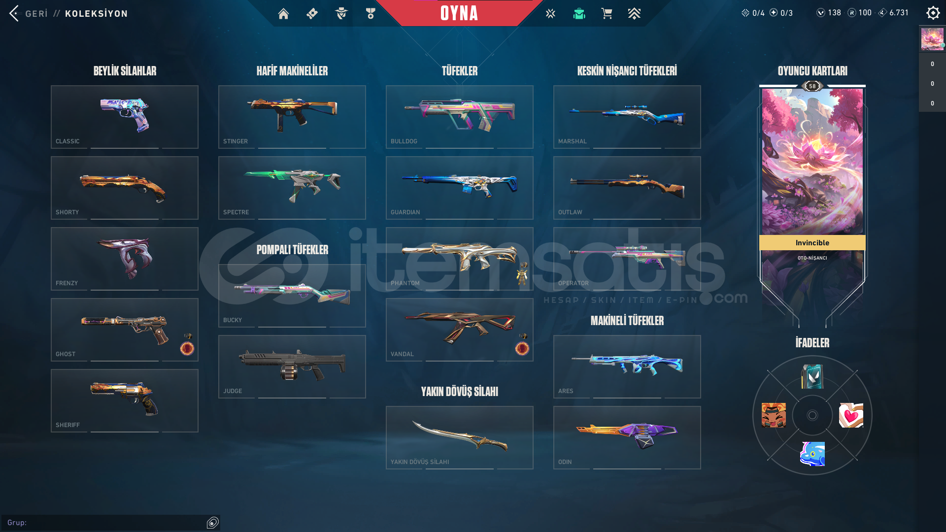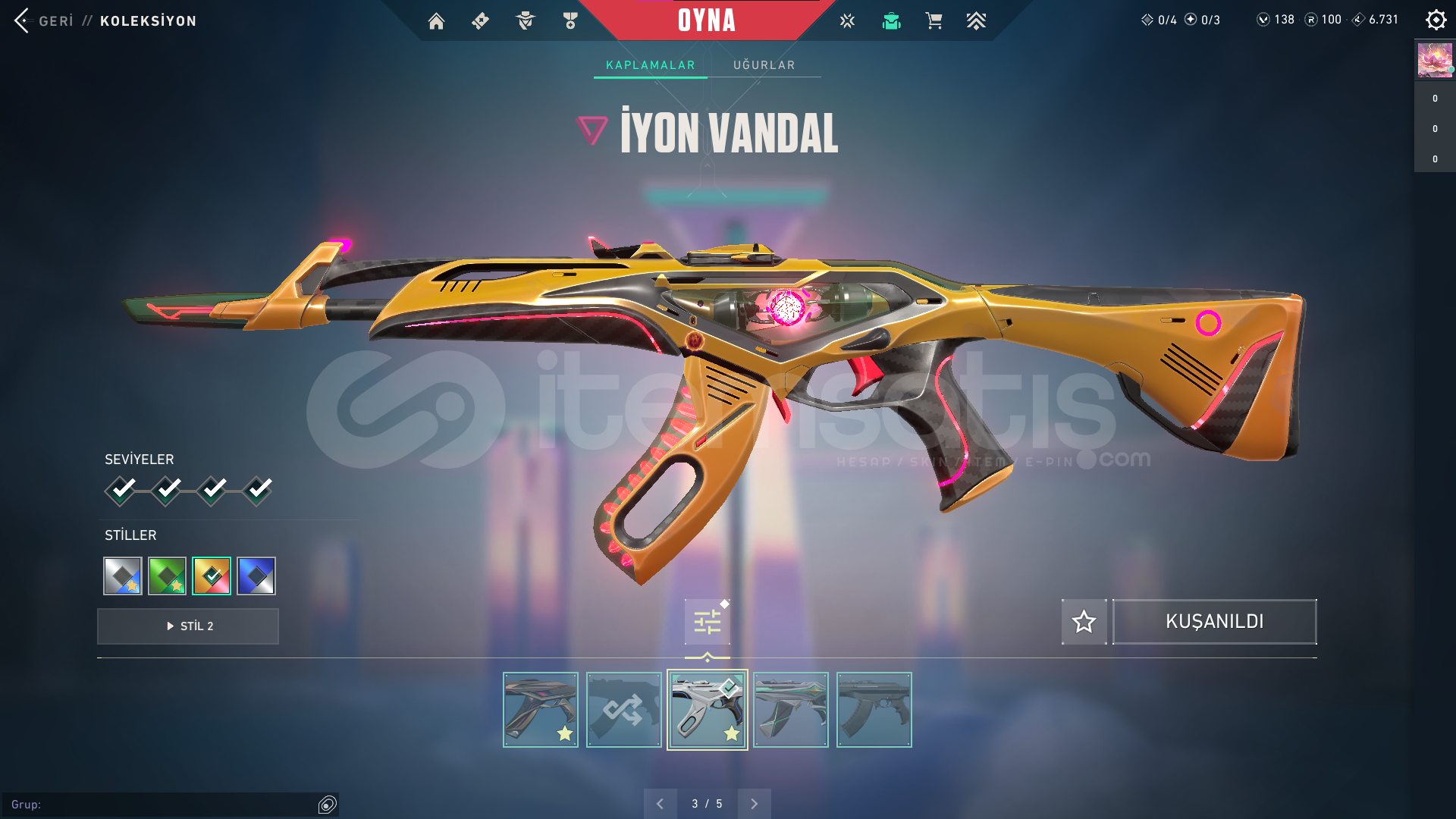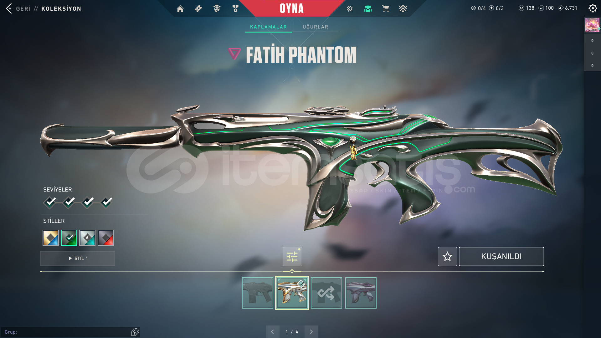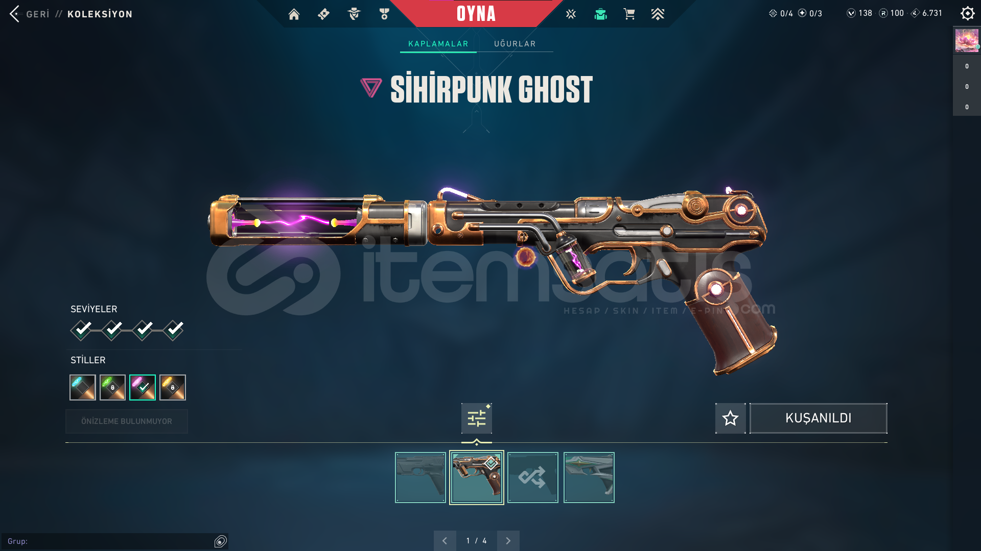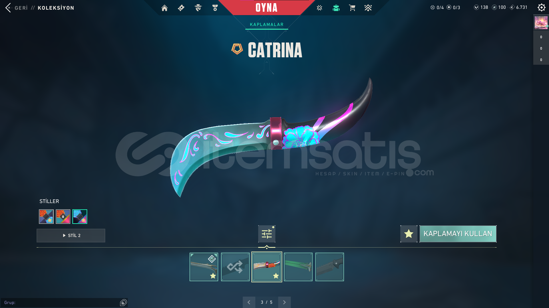 ⭐ Hesapta Ebedi Fatih , Katrina , Kuyrukluyıldız Kılıcı , Ulupençe Vandal , Iyon Vandal , Sihirpunk Ghost , Fatih Phantom , Kuyrukluyıldız Vandal gibi toplamda 31 skin bulunuyor.