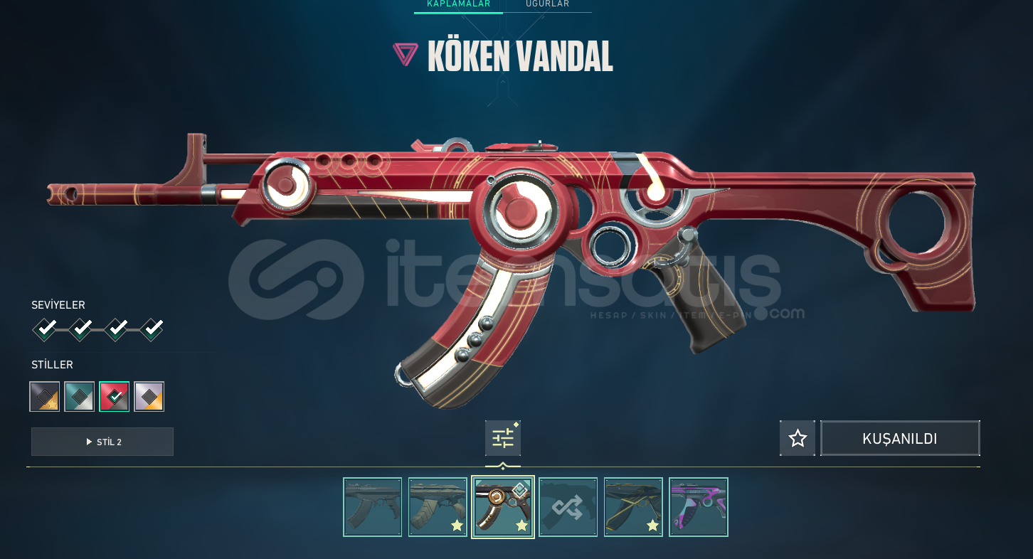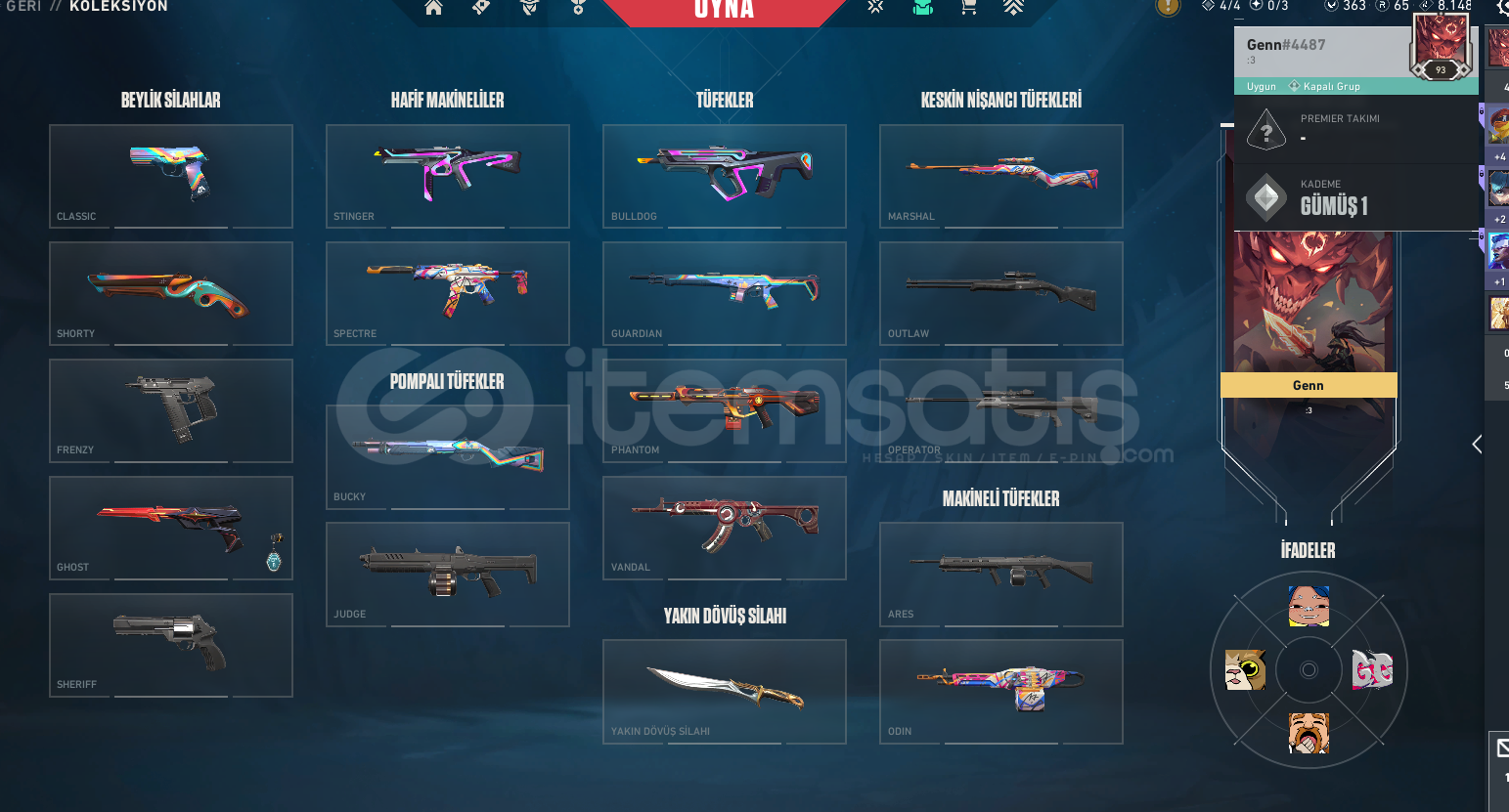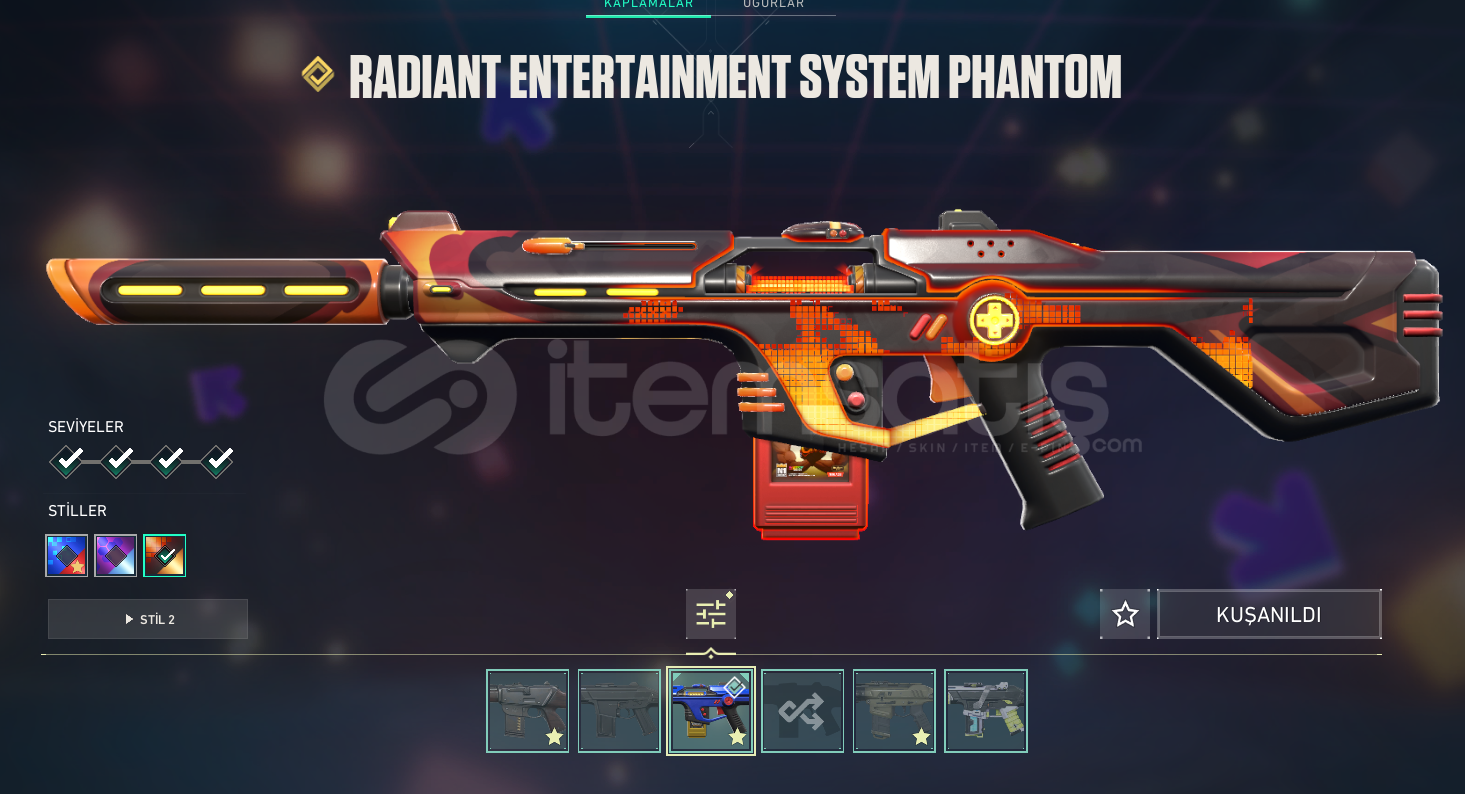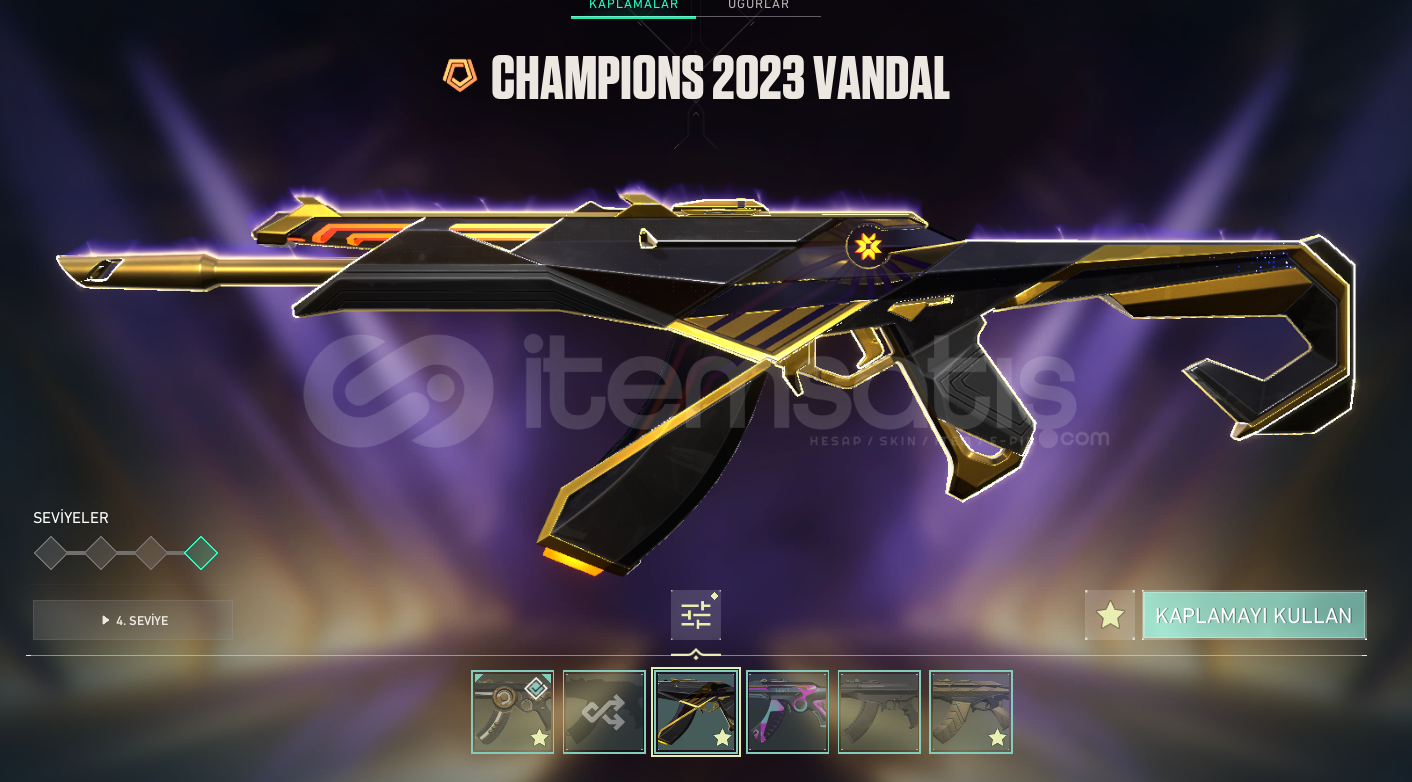 • Fatih Kılıç+Uzaylı Avcısı Bıçak +Champions 2023 Vandal+Radiant Entertainment system Phantom+Yıldız Belası Vandal+ Özel Harekat Phantom+Köken Vandal+ olmak üzere 23 skin mevcuttur
