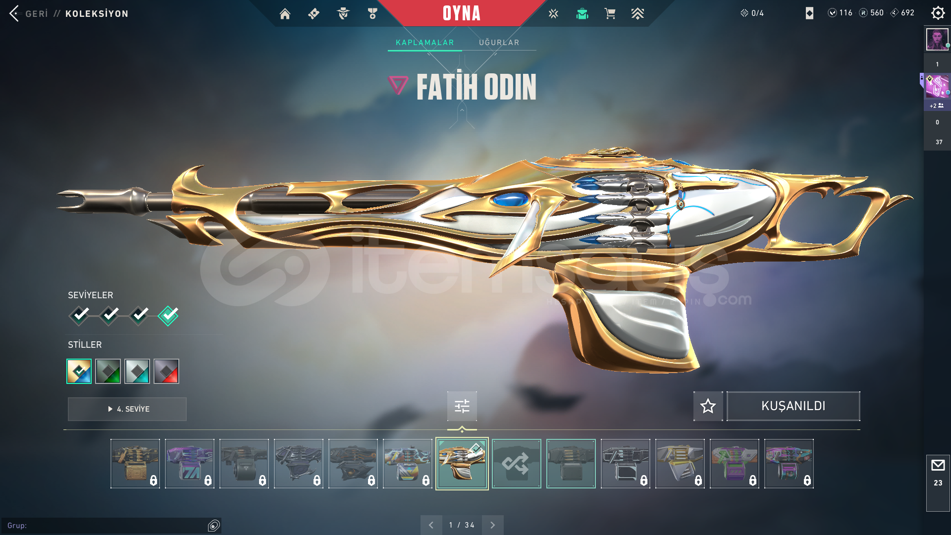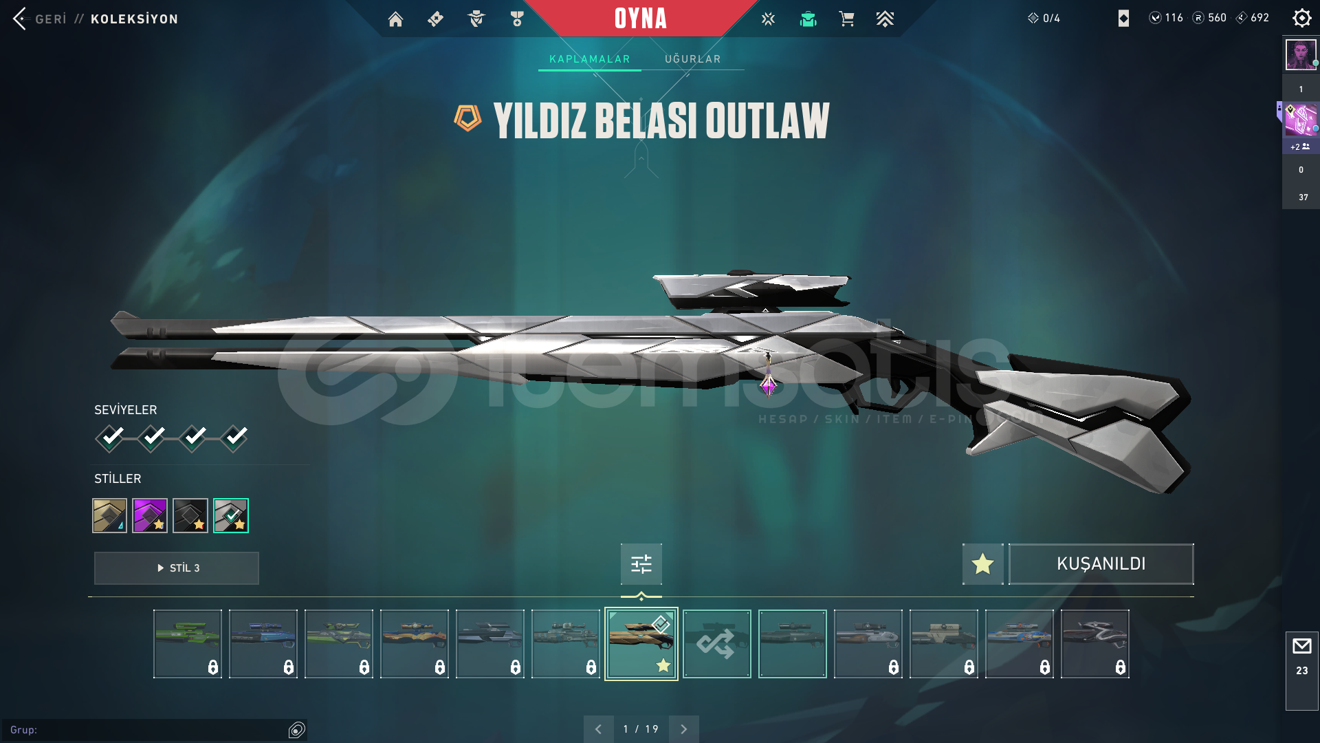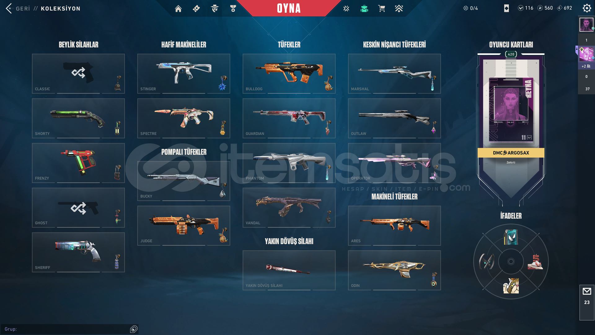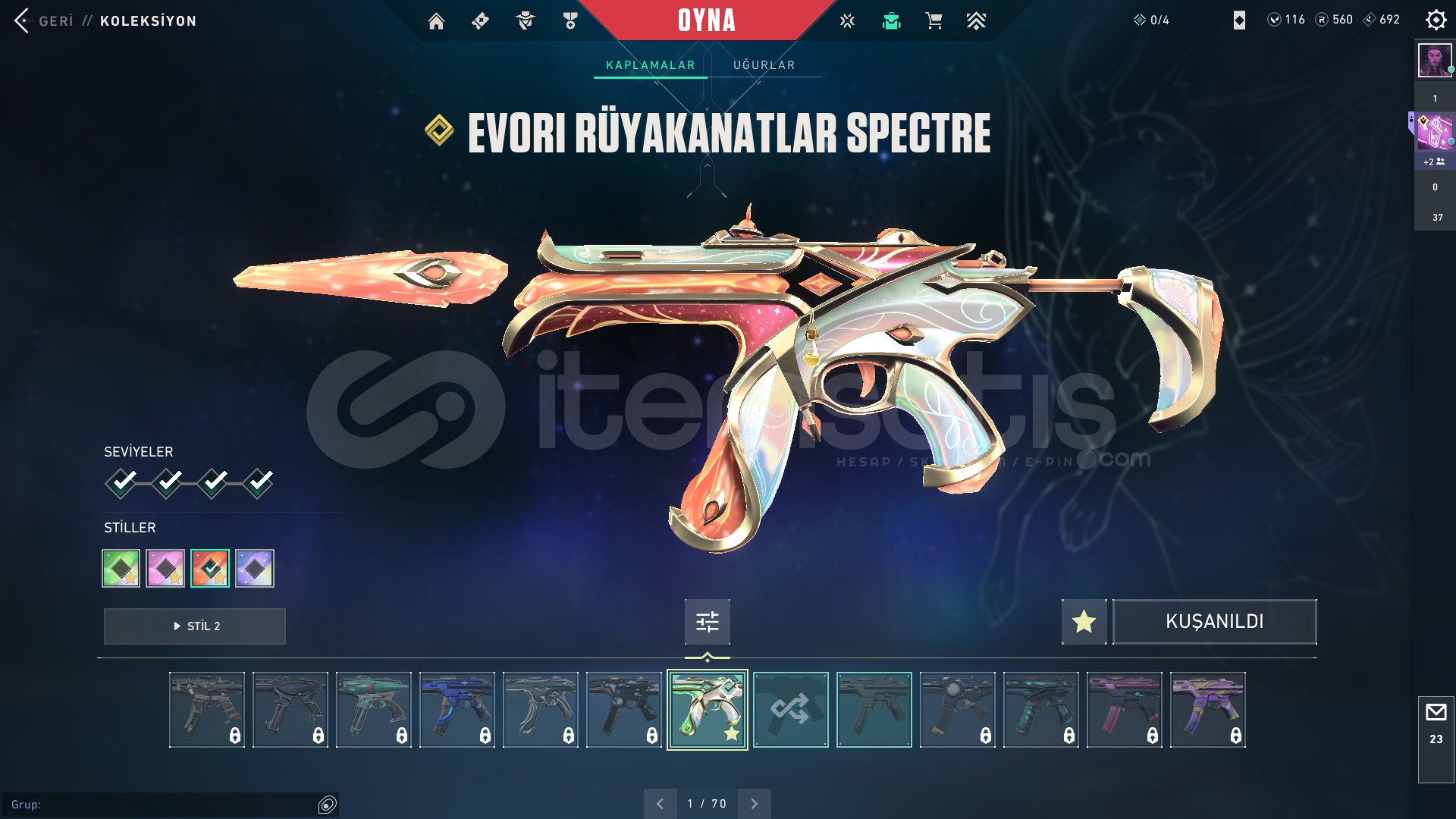 ✅ Mail: Mail değişimi yapılacaktır.✅ Level: 419✅ Rank: Plat✅ Knife / Bıçak Sayısı: 1✅ Skin Sayısı: 54🎯 Önemli Skinler:Elderflame VandalEvori Dreamwings SpectreAraxys OutlawNeo Frontier SheriffSentinels of Light OperatorBubble Pop Light StickSovereign OdinPrime ClassicIon PhantomRadiant Crisis 001 BuckyGaia's Vengeance GhostReaver VandalVe dahas...