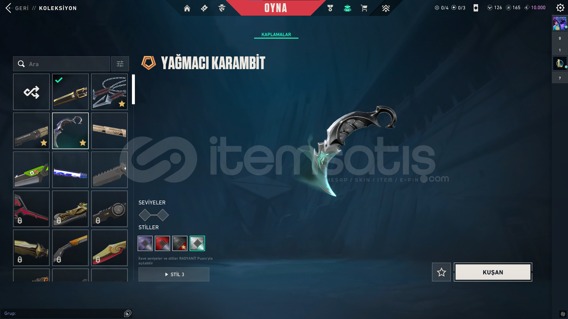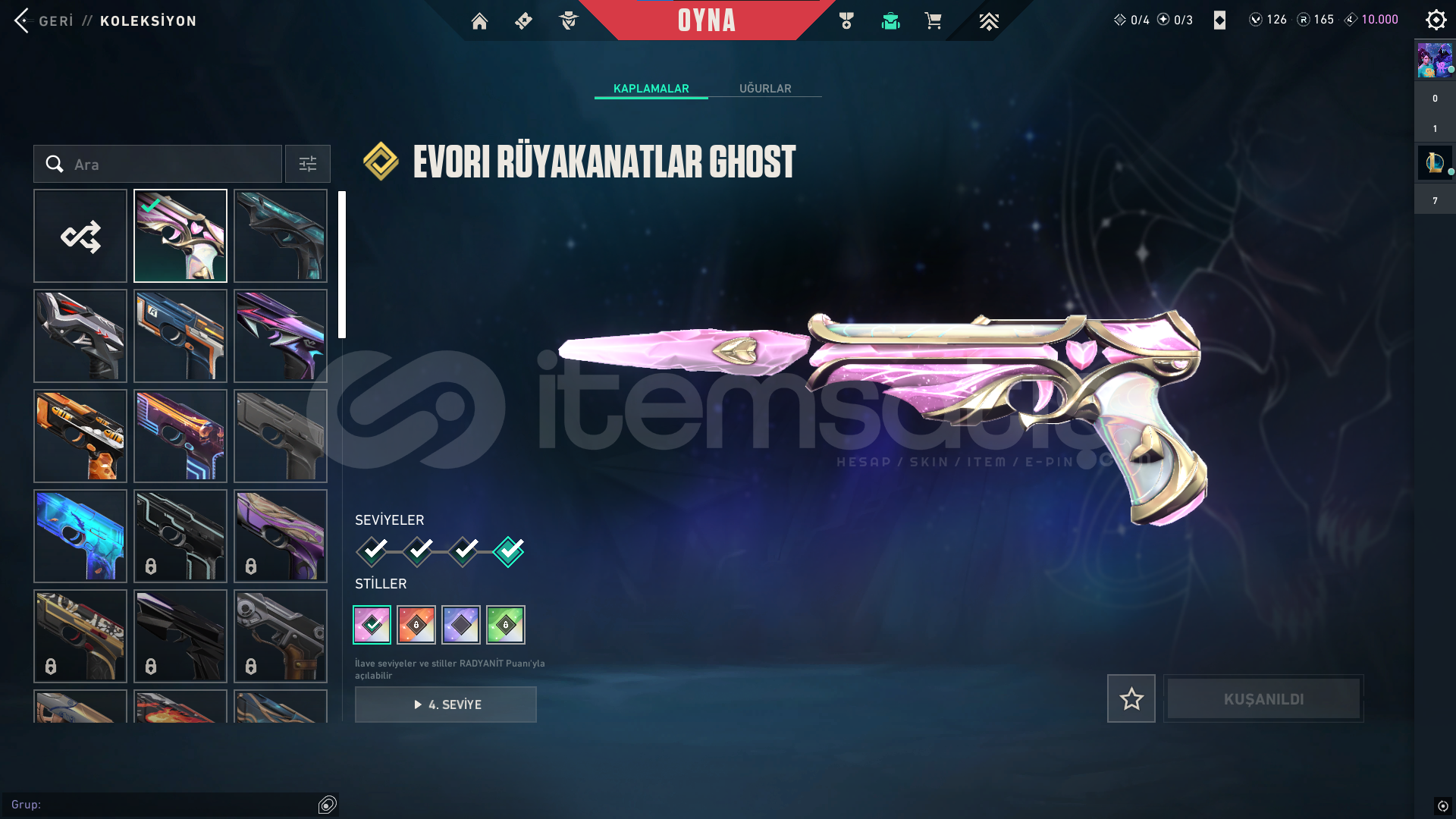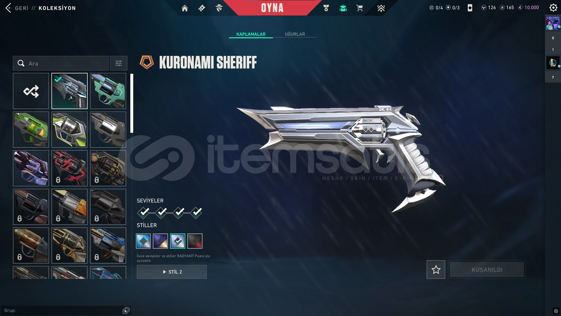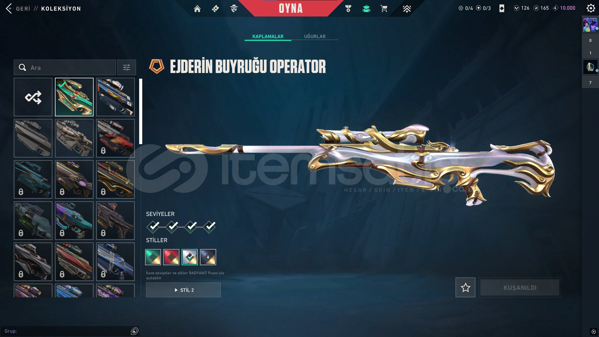 classic: Yitikghost: afet-evorisheriff: kuronami-rgxspectre: rgx-evorioperatör: Ejderin buyruğuphantom: asil-champ24vandal: delipop-anomali-faz koruyucu-champ25odin: asil2.0bıçaklar: champ25-yağmacı karambit-kuronami-özel harekatdiğer saymadığım silahlarda bp skinleri vardır toplamda 12k harcanmıştır