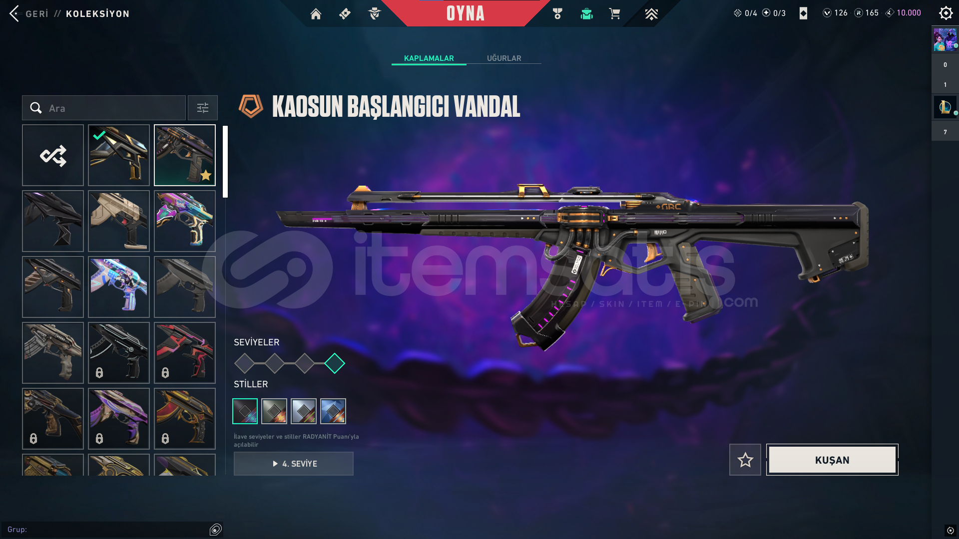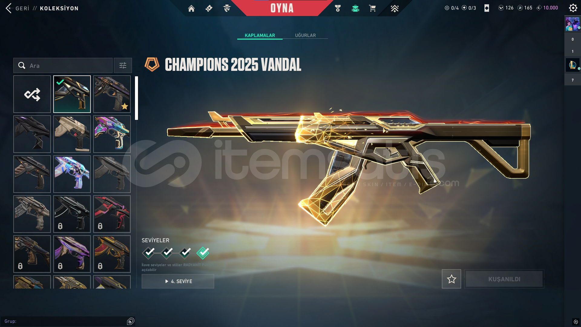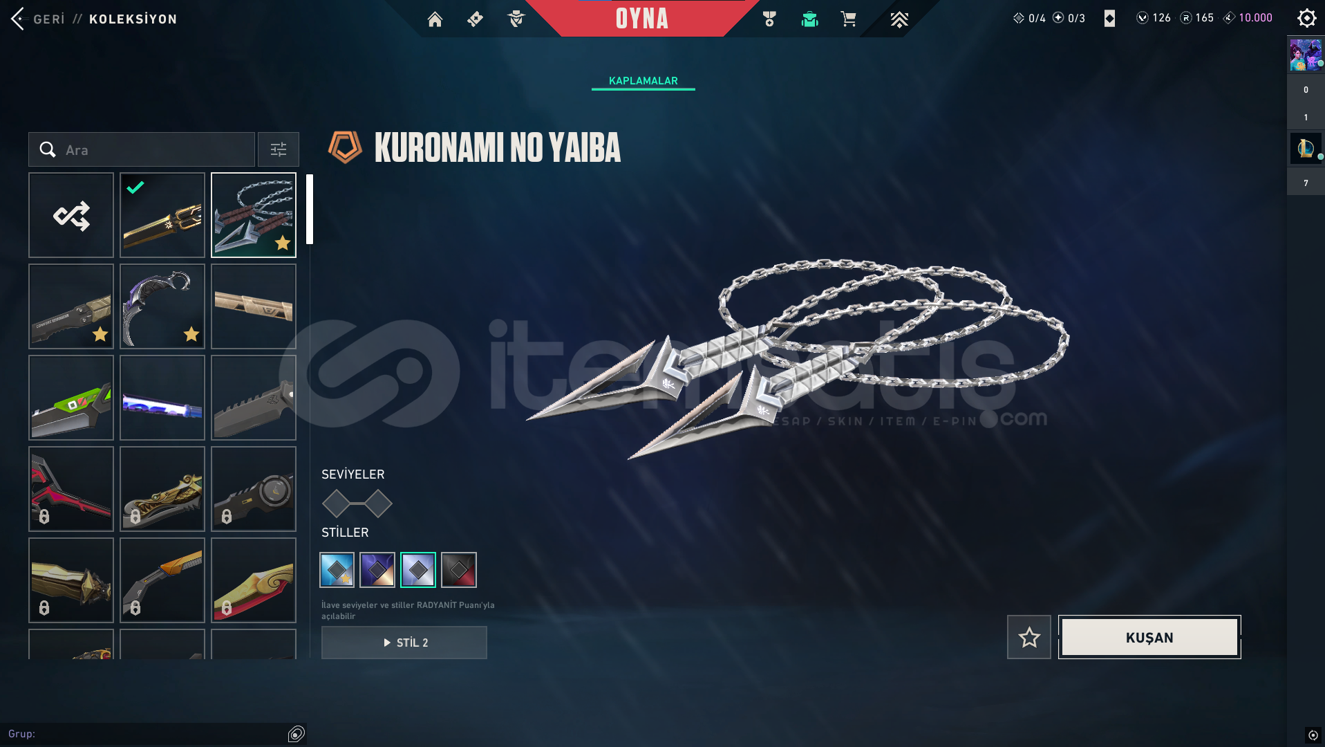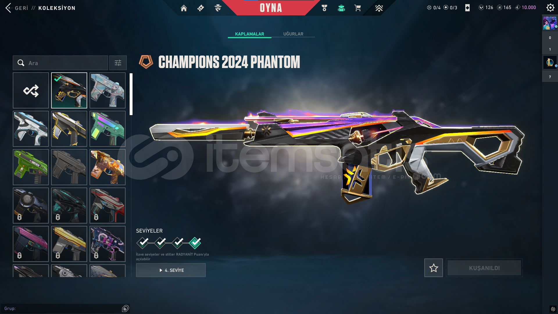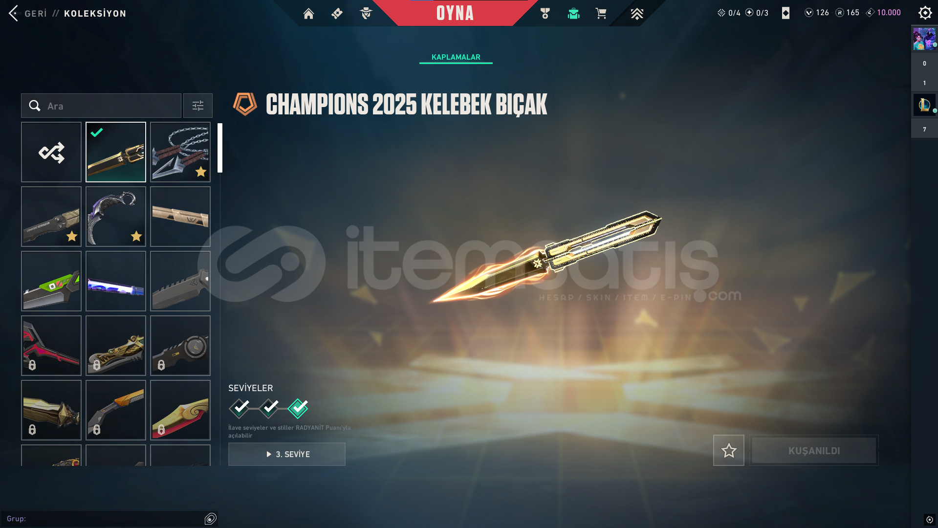 classic: Yitikghost: afet-evorisheriff: kuronami-rgxspectre: rgx-evorioperatör: Ejderin buyruğuphantom: asil-champ24vandal: delipop-anomali-faz koruyucu-champ25odin: asil2.0bıçaklar: champ25-yağmacı karambit-kuronami-özel harekatdiğer saymadığım silahlarda bp skinleri vardır toplamda 12k harcanmıştır