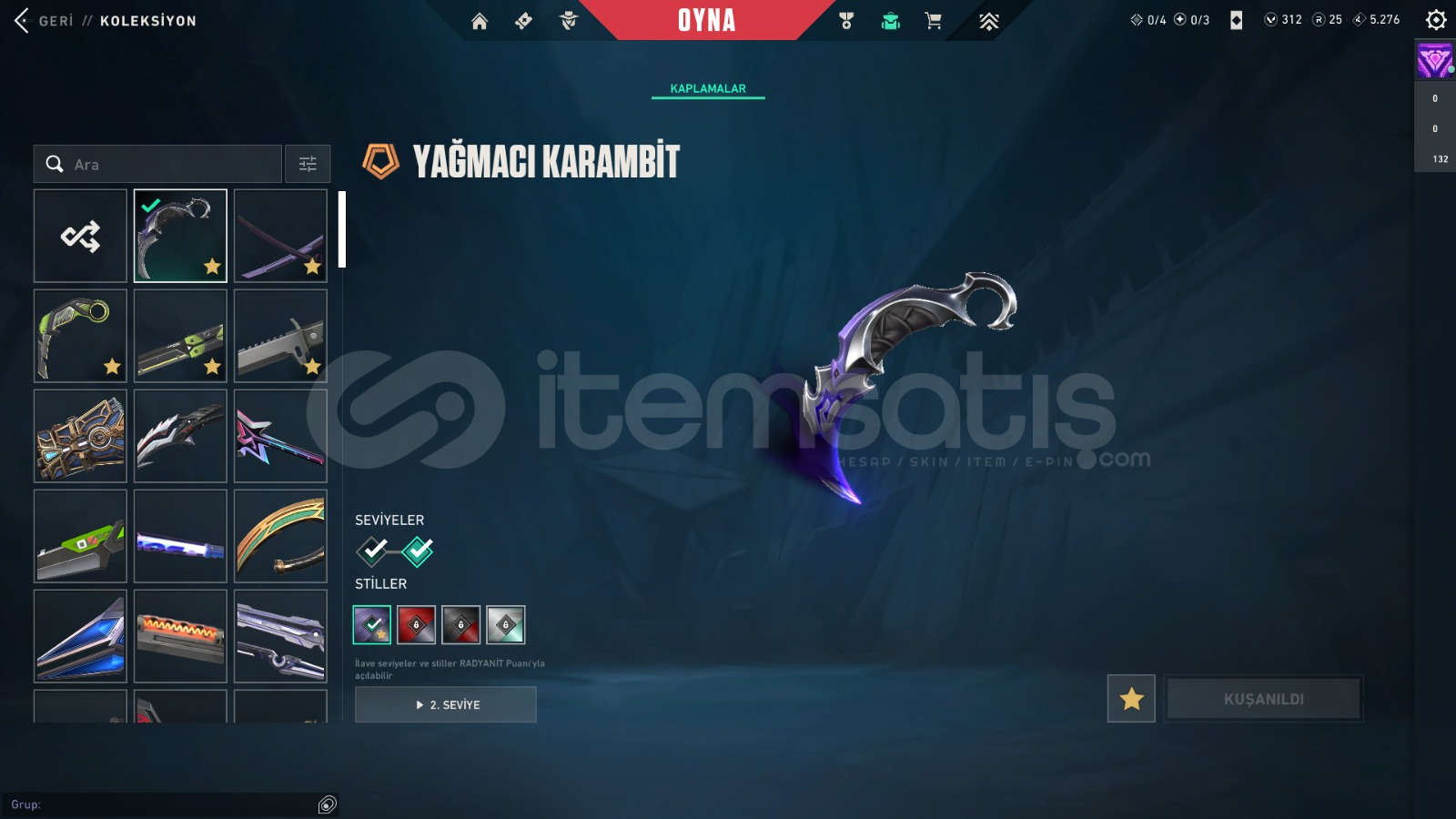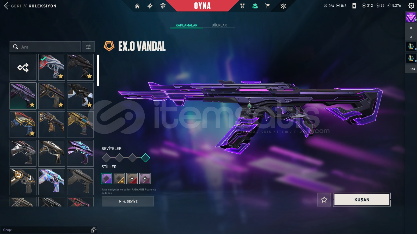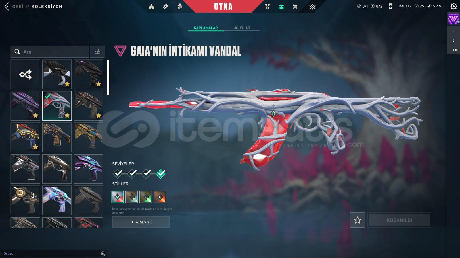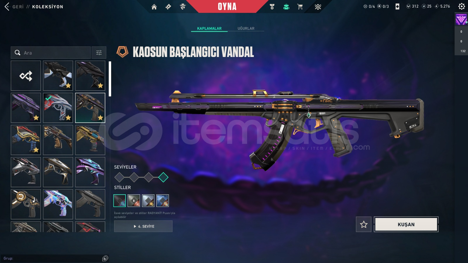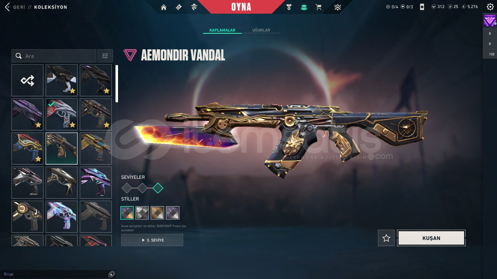 VANDAL SKINLERİGaia'nın İntikamı VandalAnomali VandalEx.o VandalKaosun Başlangıcı VandalOnetap'ten Ora VandalArcane VandalAemondır VandalIşık Muhafızları VandalOni VandalKöken VandalBp SkinleriBIÇAK SKİNLERİYağmacı KarambitEx.o KılıcıRgx 11Z Pro KarambitRgx 11Z Pro KelebekUzaylı Avcısı BıçağıArcane EldivenleriBp SkinleriPHANTOM SKINLERİProtokol 781-...