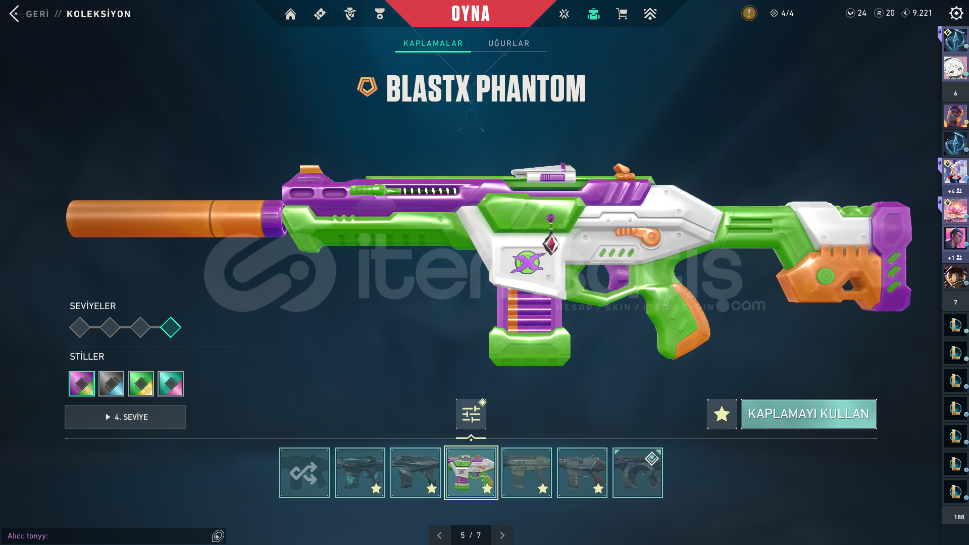 Classic: evrim classic, soğuk çelik classic Shorty: kaos shorty, Ghost: faz koruyucu ghost , fatih ghost Spectre: asil spectre, kuronami spectre, Sheriff:kuronami sheriff, anomali sheriff, Judge: evrim judge, Buldogg: faz koruyucu buldogg, zifiri buldogg Guardian: yağmacı guardian Phantom: zifiri , afet, anomali, blastx, seri tetik, özel harekat phantom Vandal: evrim , aemondır, arcane, asil, cesur yürek, exo, delipop, faz koruyucu, gaianın intikamı...