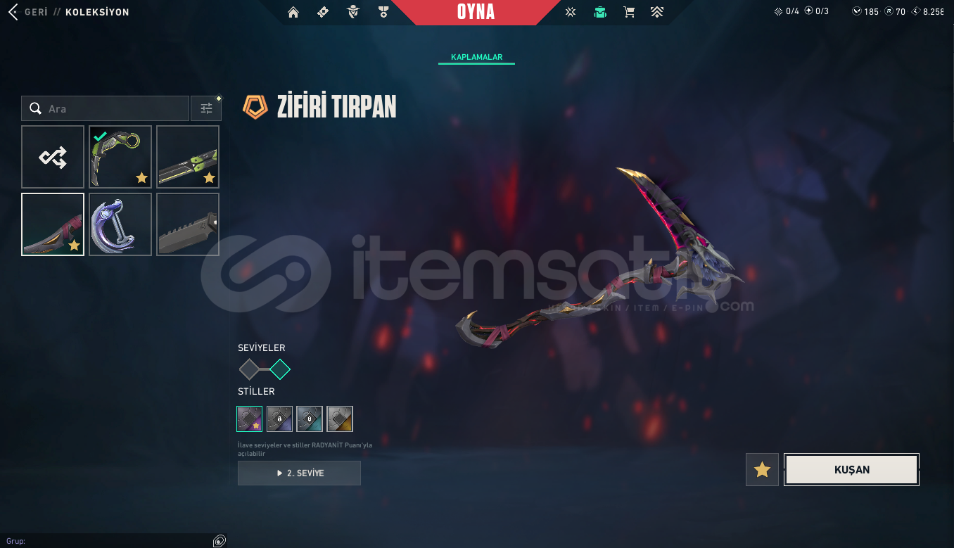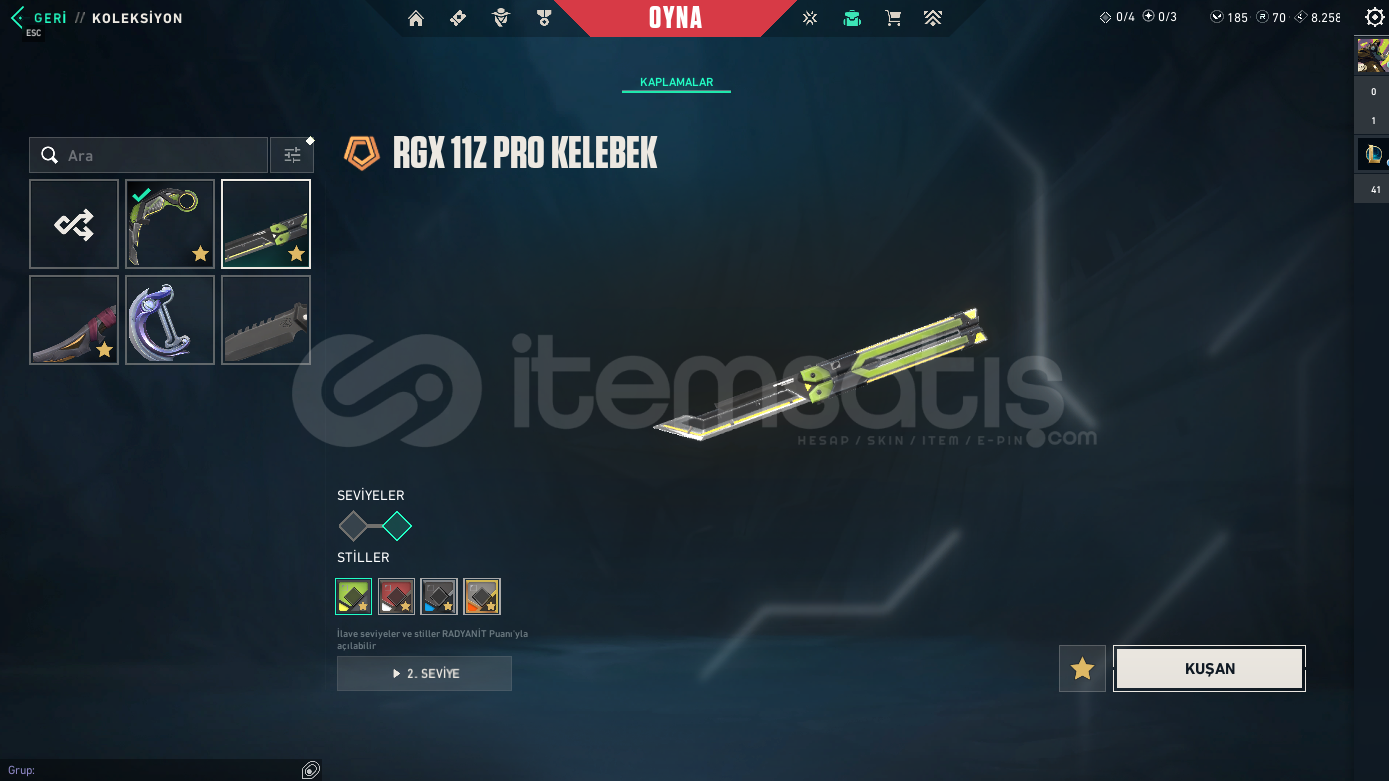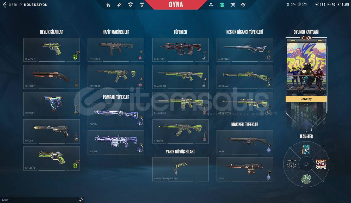 RANK:GOLD IISUNUCU:EULEVEL: 198ENVANTER DEĞERİ: 44,700 VP RGX 11z Pro OutlawNocturnum BulldogRGX 11z Pro SheriffVCT x M8 ClassicNocturnum ClassicIridian Thorn BladeRGX 11z Pro VandalNocturnum MarshalRGX 11z Pro KarambitRGX 11z Pro GuardianKuronami MarshalNocturnum PhantomNocturnum ScytheRGX 11z Pro PhantomNeo Frontier SheriffRGX 11z Pro FireflyRGX 11z Pro SpectreRGX 11z Pro OperatorRGX 11z Pro ClassicIridian Thorn BuckyIridian Thorn OperatorIridian Thorn SheriffIridian Thorn Judge...