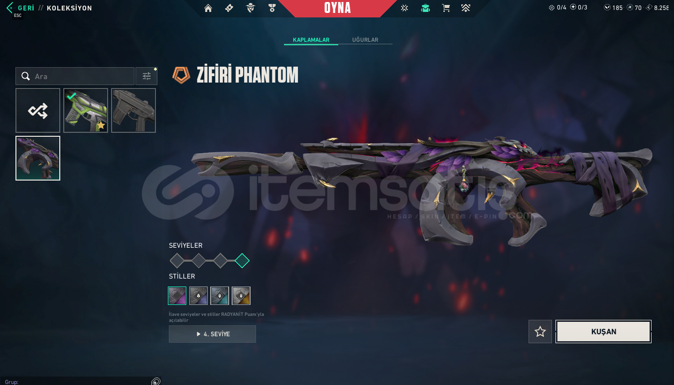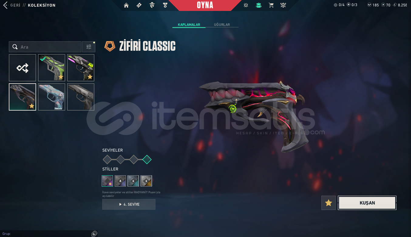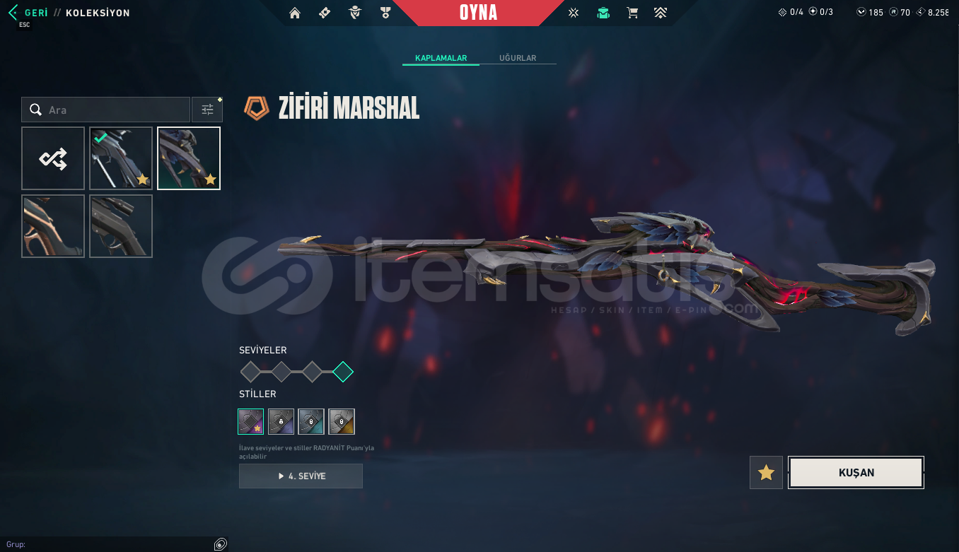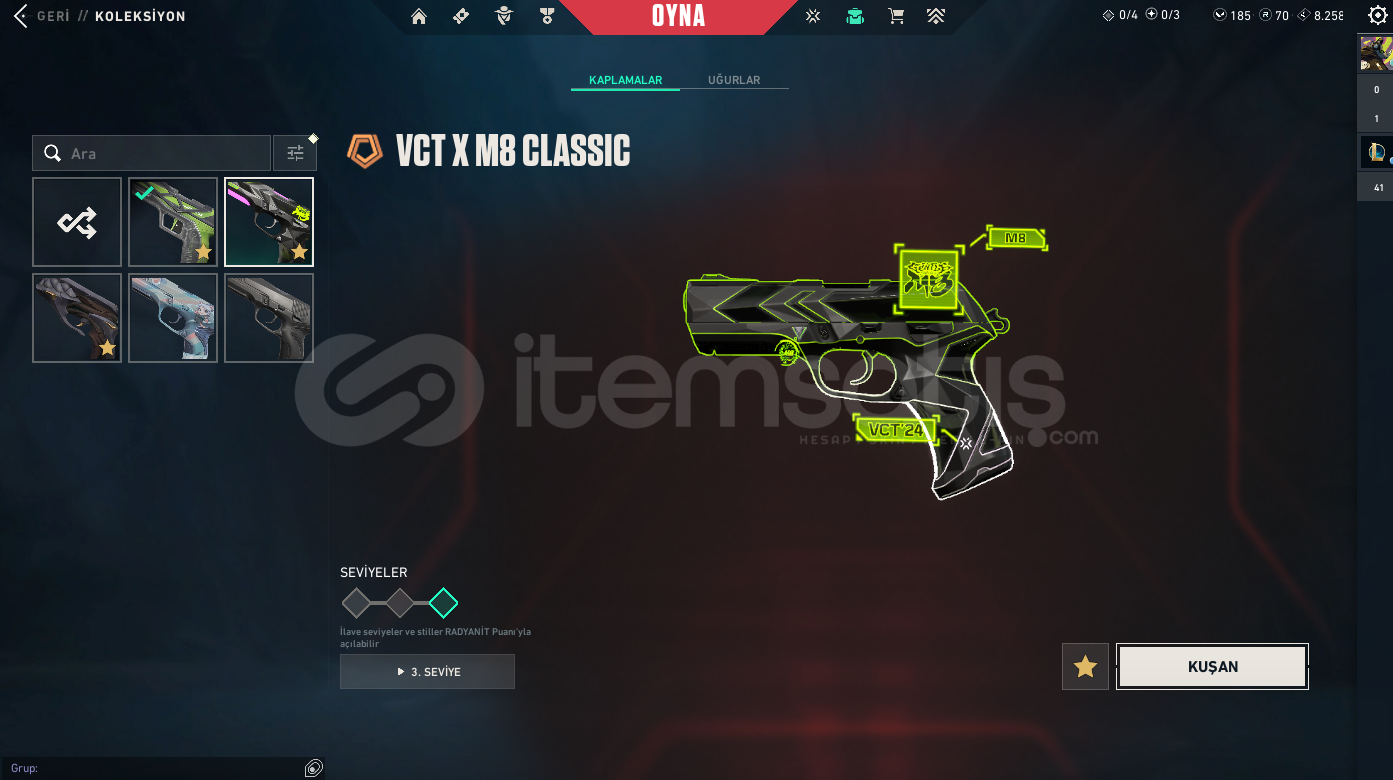 RANK:GOLD IISUNUCU:EULEVEL: 198ENVANTER DEĞERİ: 44,700 VP RGX 11z Pro OutlawNocturnum BulldogRGX 11z Pro SheriffVCT x M8 ClassicNocturnum ClassicIridian Thorn BladeRGX 11z Pro VandalNocturnum MarshalRGX 11z Pro KarambitRGX 11z Pro GuardianKuronami MarshalNocturnum PhantomNocturnum ScytheRGX 11z Pro PhantomNeo Frontier SheriffRGX 11z Pro FireflyRGX 11z Pro SpectreRGX 11z Pro OperatorRGX 11z Pro ClassicIridian Thorn BuckyIridian Thorn OperatorIridian Thorn SheriffIridian Thorn Judge...