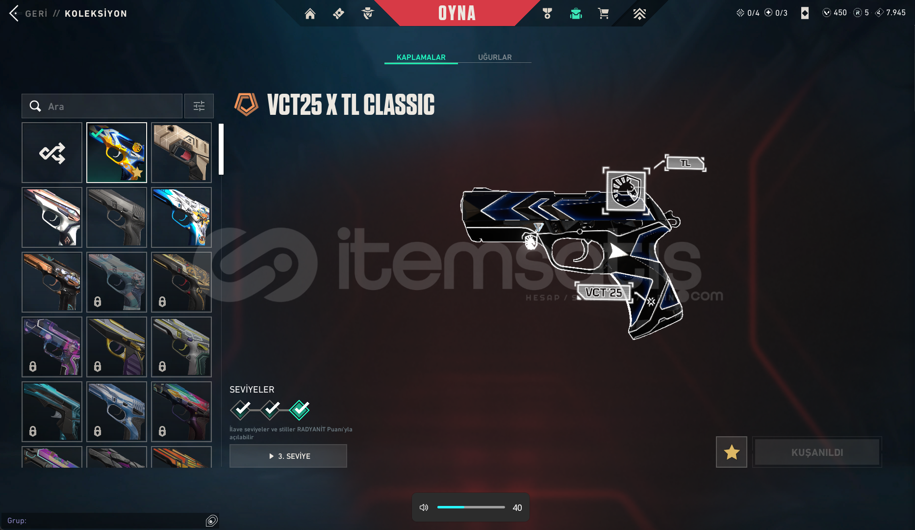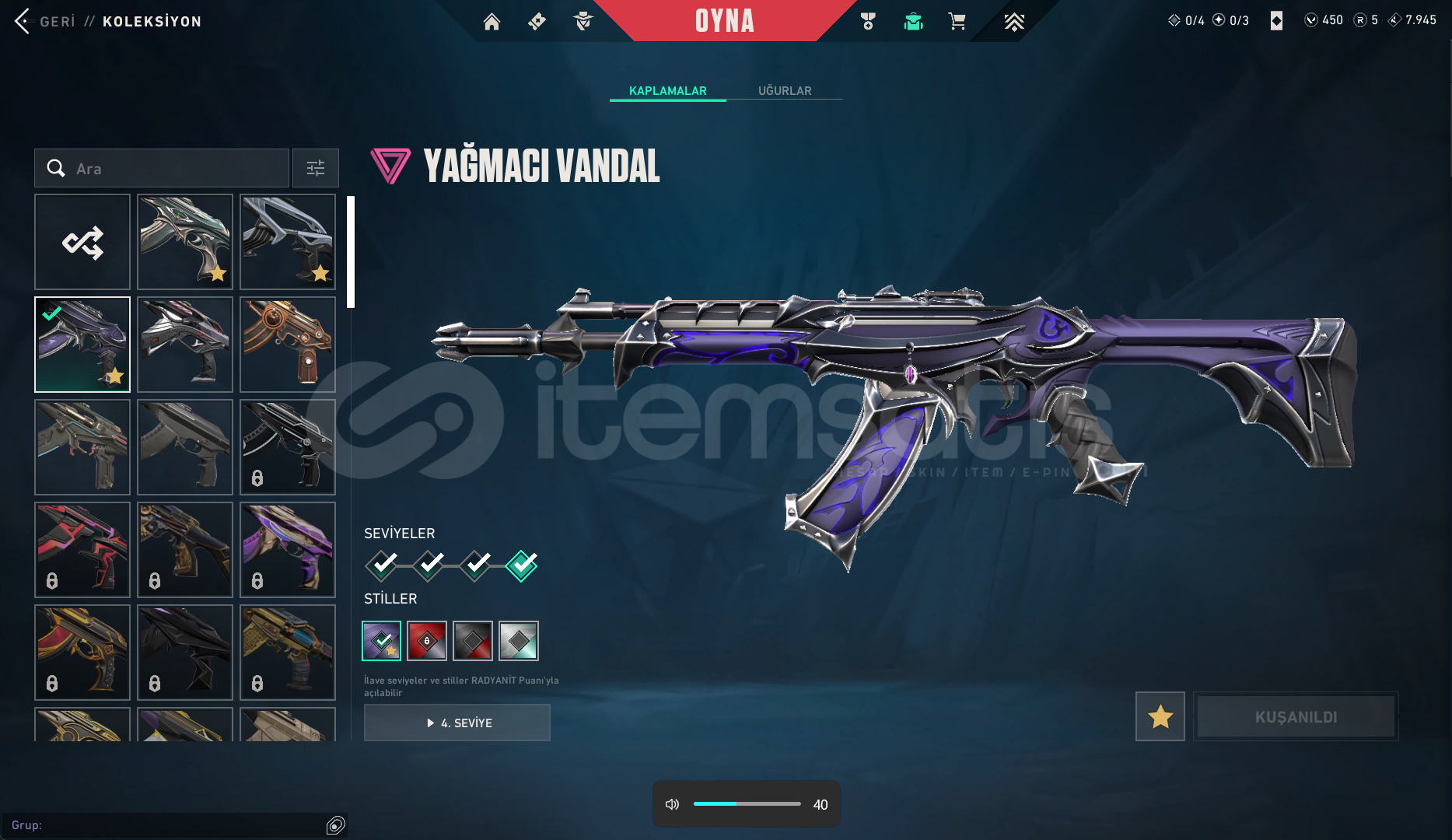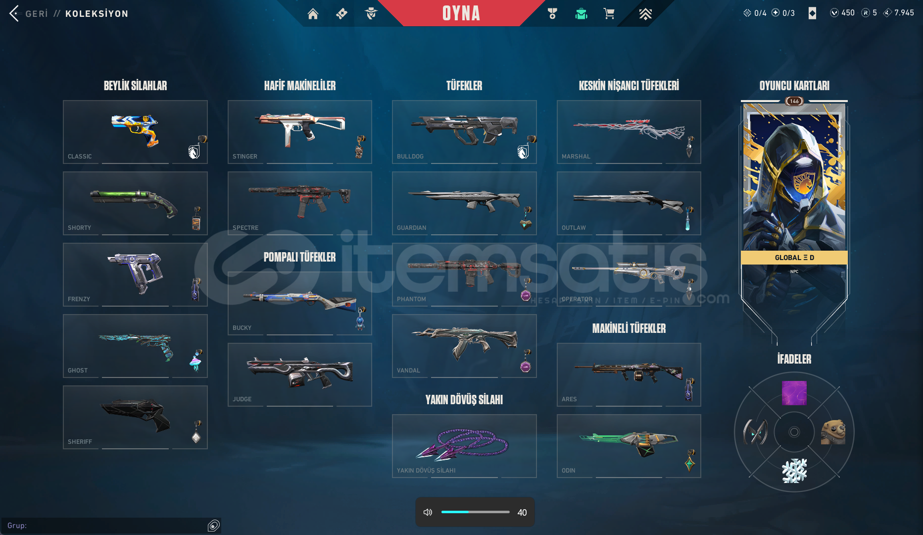 • Hesapta aktif 450 VP bulunmaktadır. (Skinlerin toplam vp değer karşılığı ~74.000 VP aralığında'dır.)
