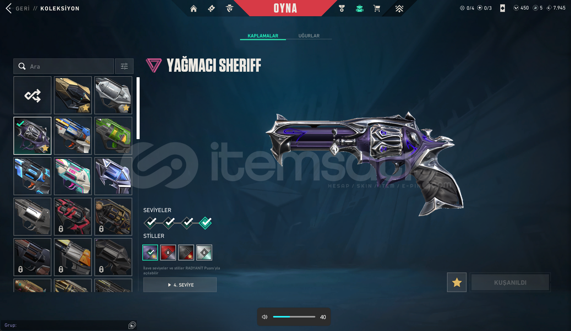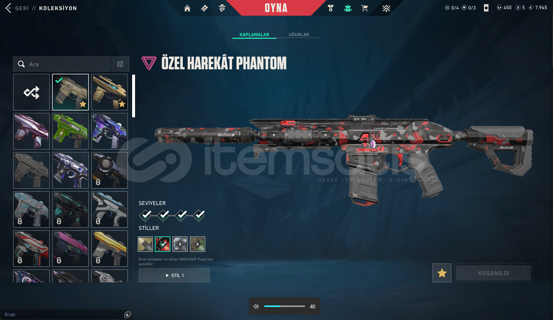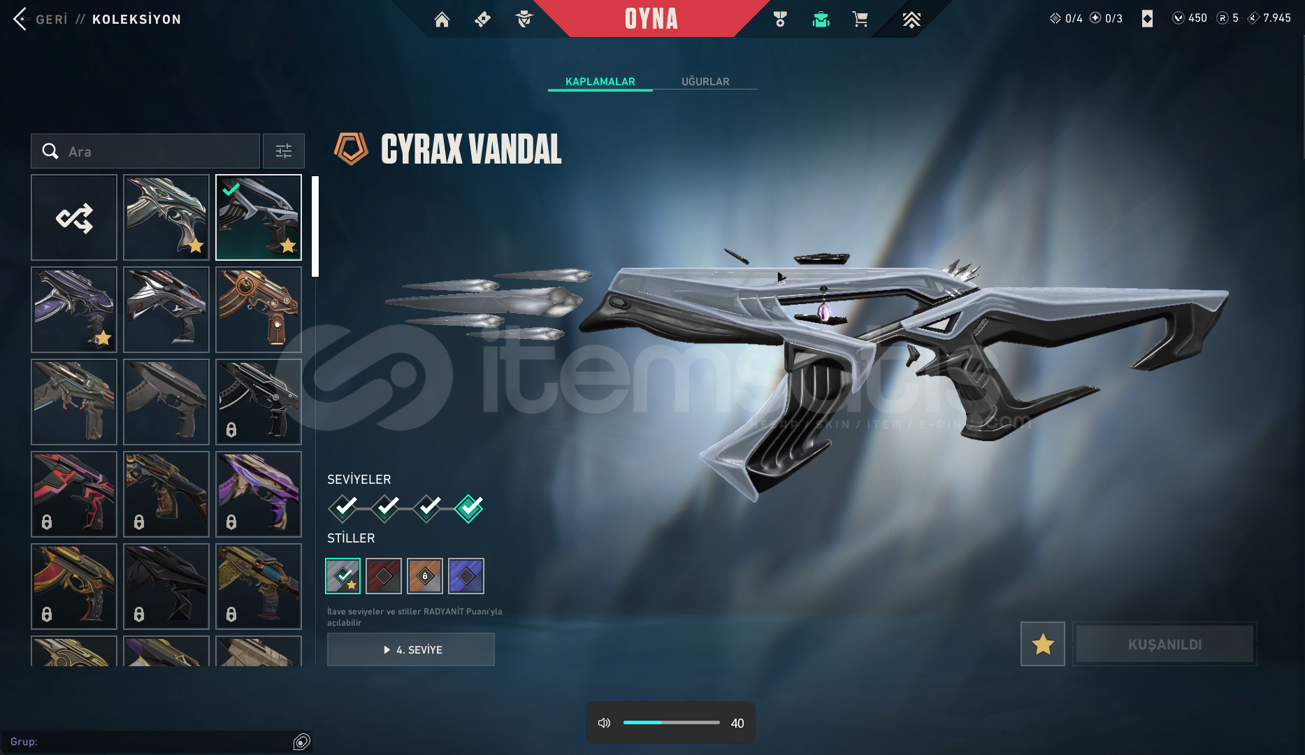 • Hesapta aktif 450 VP bulunmaktadır. (Skinlerin toplam vp değer karşılığı ~74.000 VP aralığında'dır.)