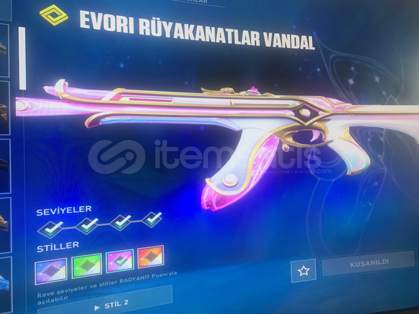 hesabın içerisinde bir adet evori rüyakanatlar vandal ve uzaylı avcısı bıçak mevcuttur. Geri kalan silahlarda skin kesinlikle yoktur. Dikkatinize. Lol hesabı iyi değildir.