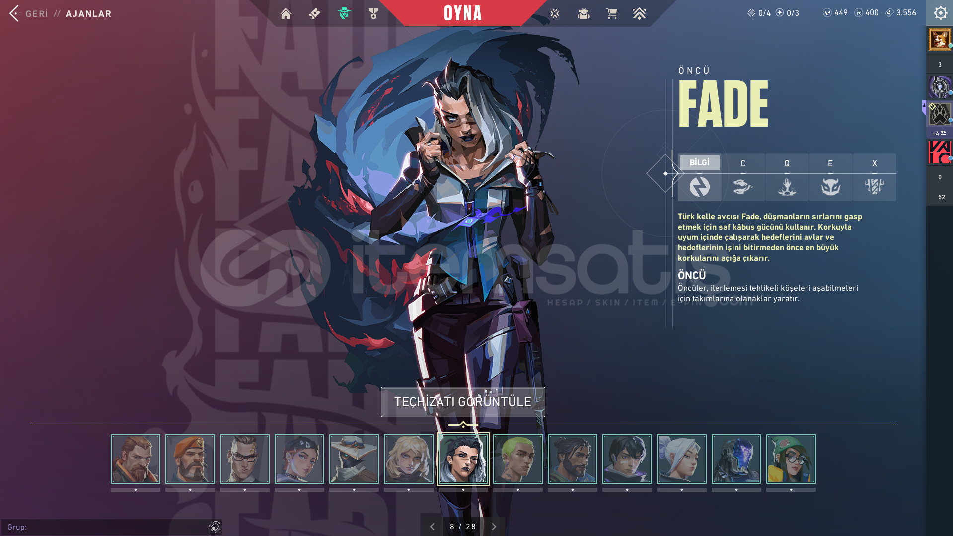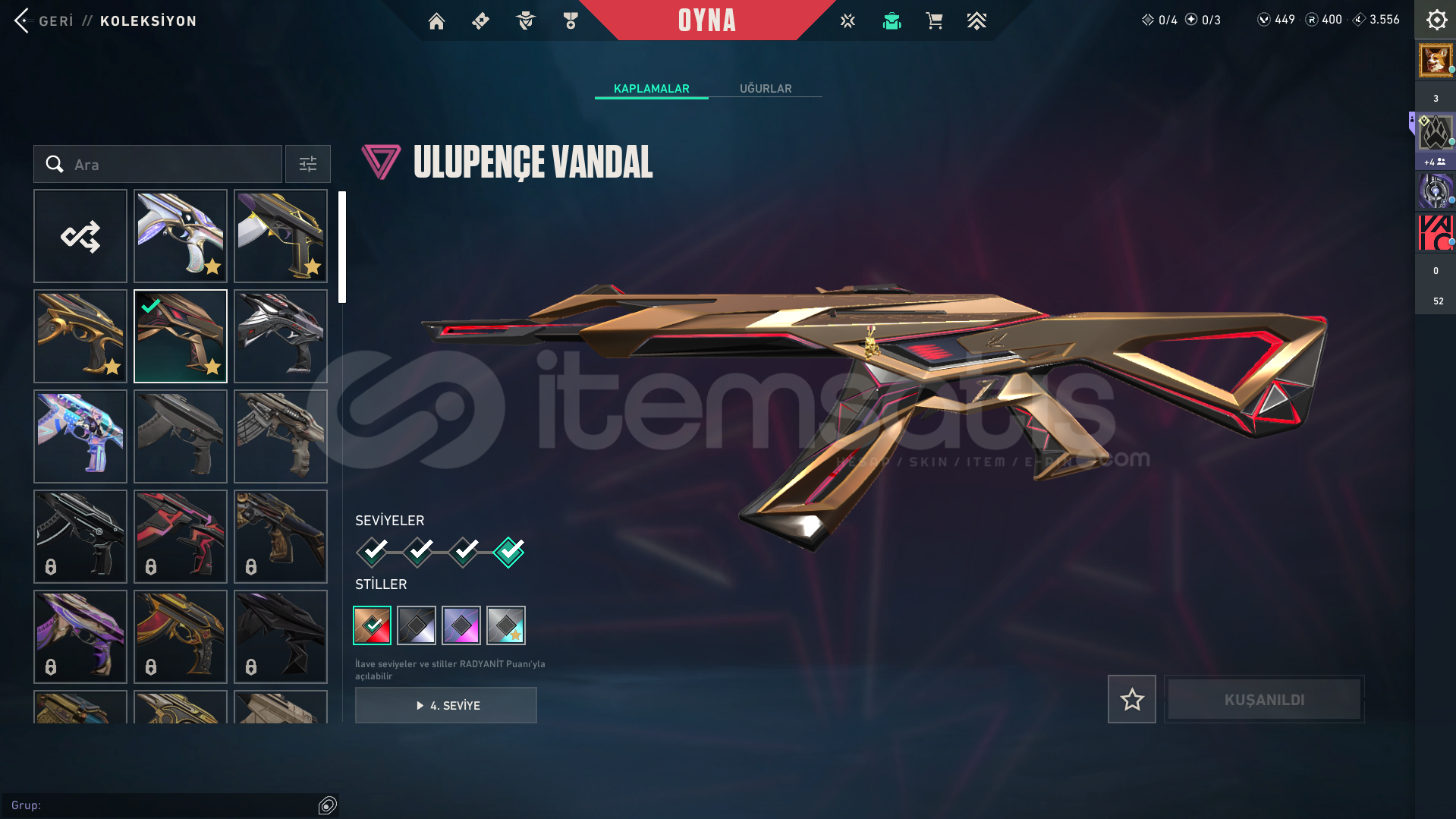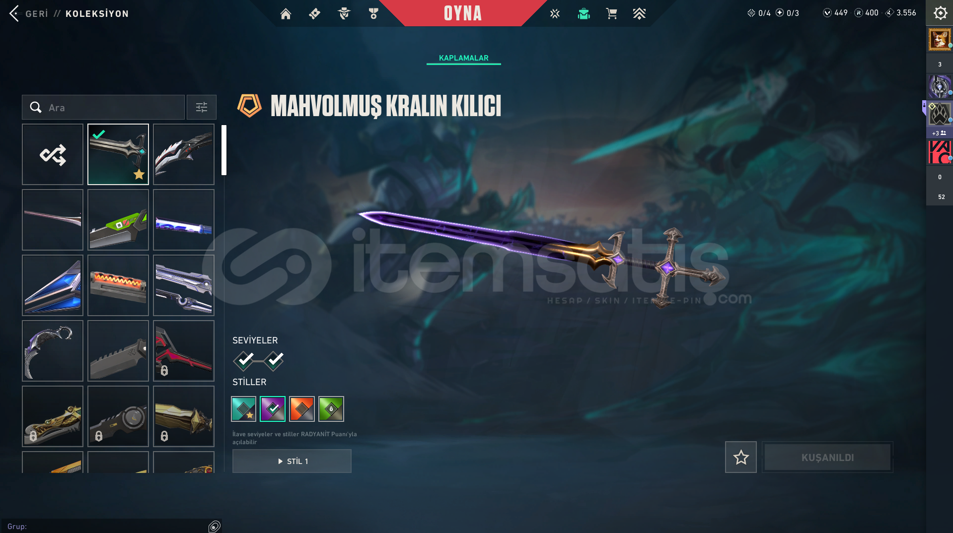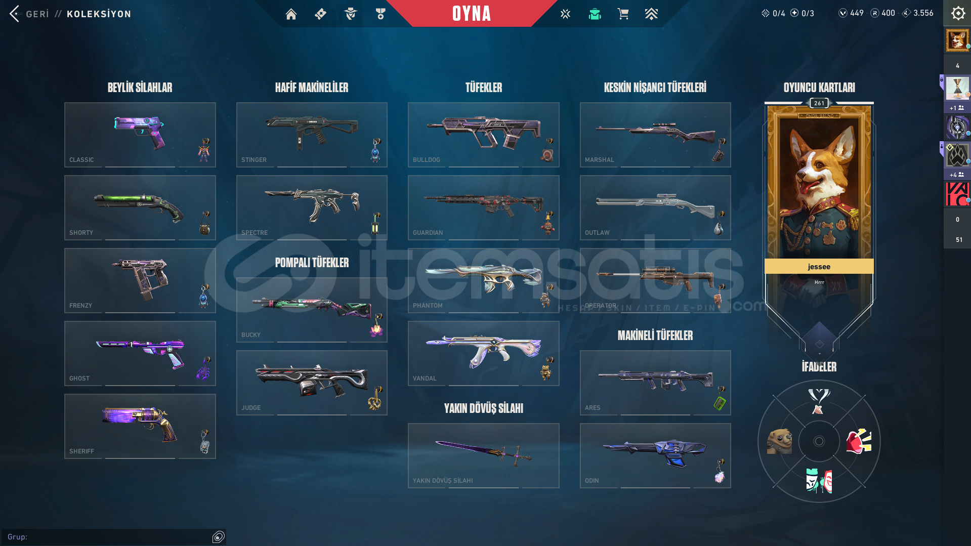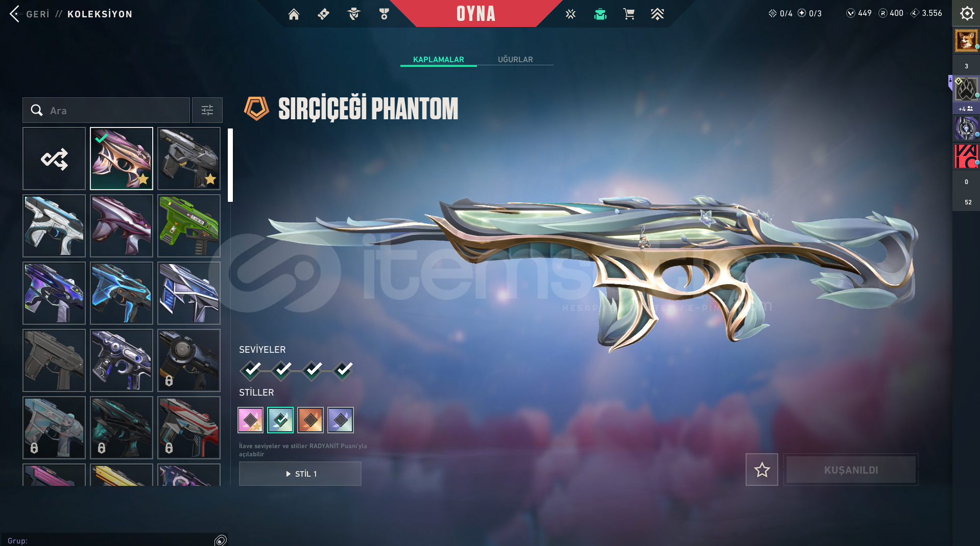 skinlerimiz Sır çiceği phantom/protokol phantom/asil Vandal/ulupençe Vandal/evori Vandal/cesur yürek Vandal/yitik soectre/afet kılıç/yağmacı karambit/sihirphunk operatör/sprectrum classic/seri tetik şerif/radianit entertainment system ghost/gaia'nin intikamı ghost/özel harekat guardian vardır. ve 4 veya 4 den fazla gamepass acıktır. atktik ayı vardır ve bronz 1 dir. 261 seviyedir ve coğu sprey unvan ve kart vardır. ve tüm ajanlar acıktır.