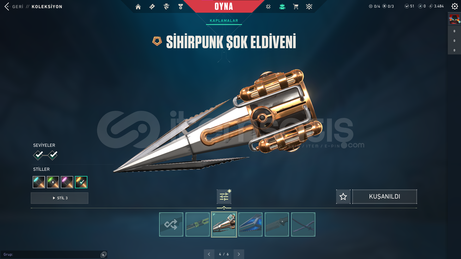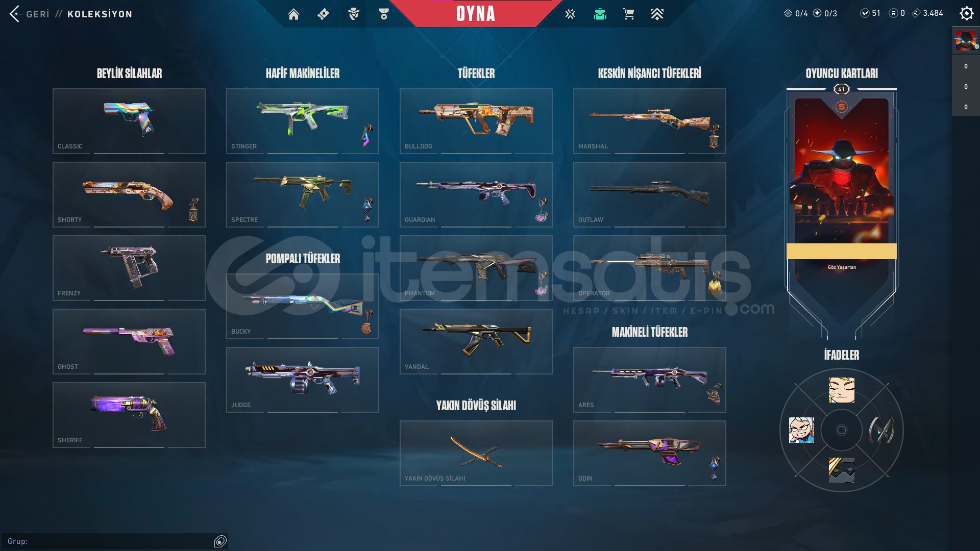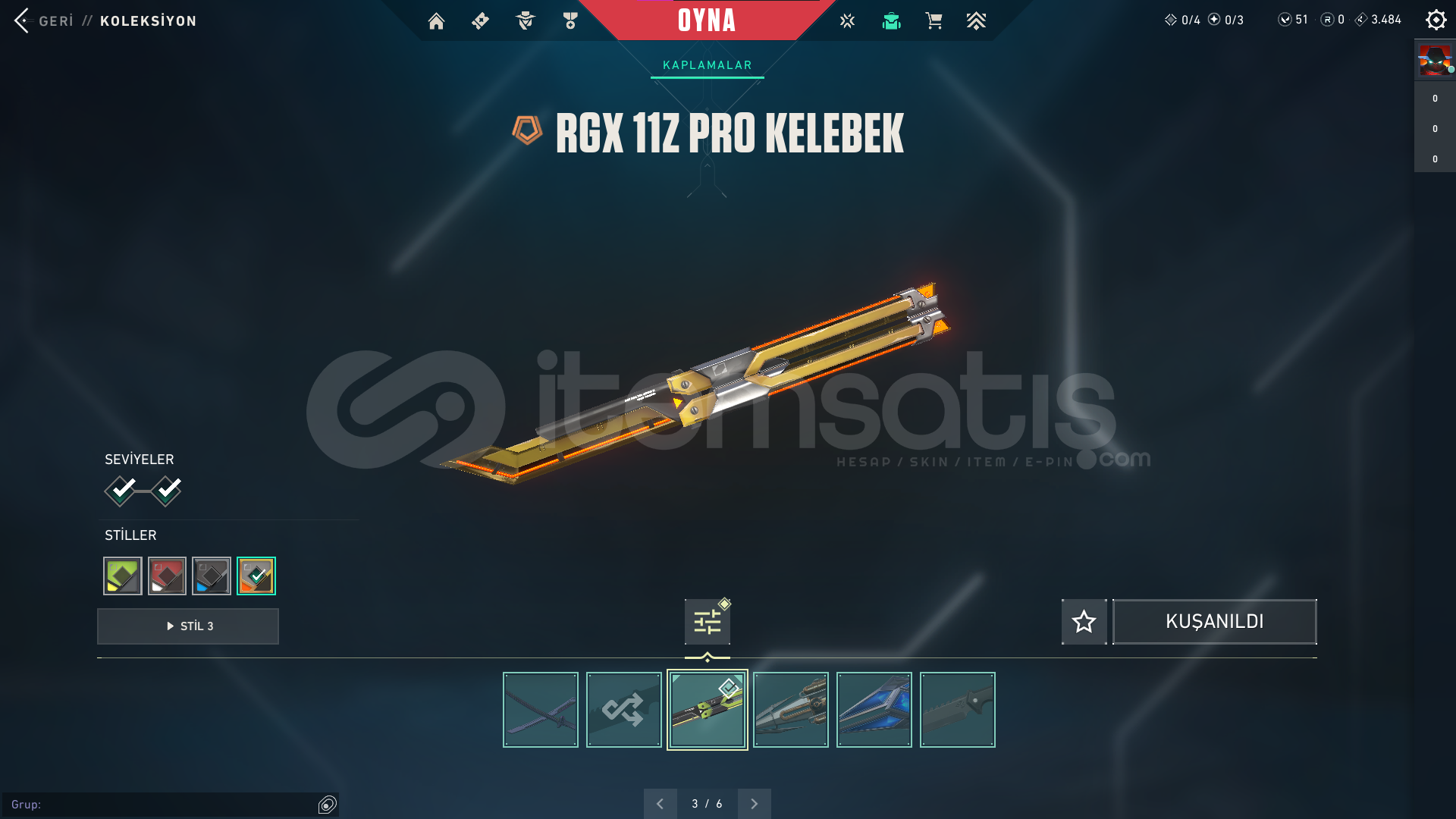 ⭐ Hesabın içinde EX.O Kılıcı , RGX 11z Pro Kelebek , Sihipunk Şok Eldiveni , Solarex Yadigarı , Ejder Ateşi Vandal , Devinim Vandal , ATLAS // CMD Vandal , Champions 2025 Vandal , Seri Tetik Sheriff , Sihirpunk Operator gibi skinlerle toplamda 37 skin bulunmaktadır.