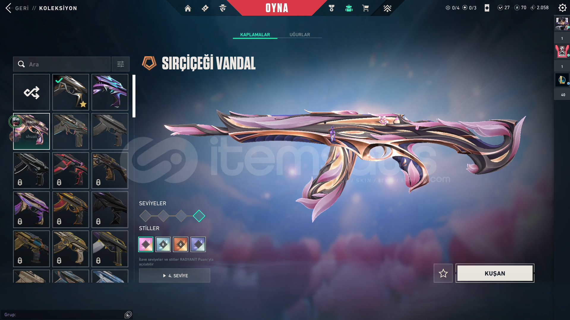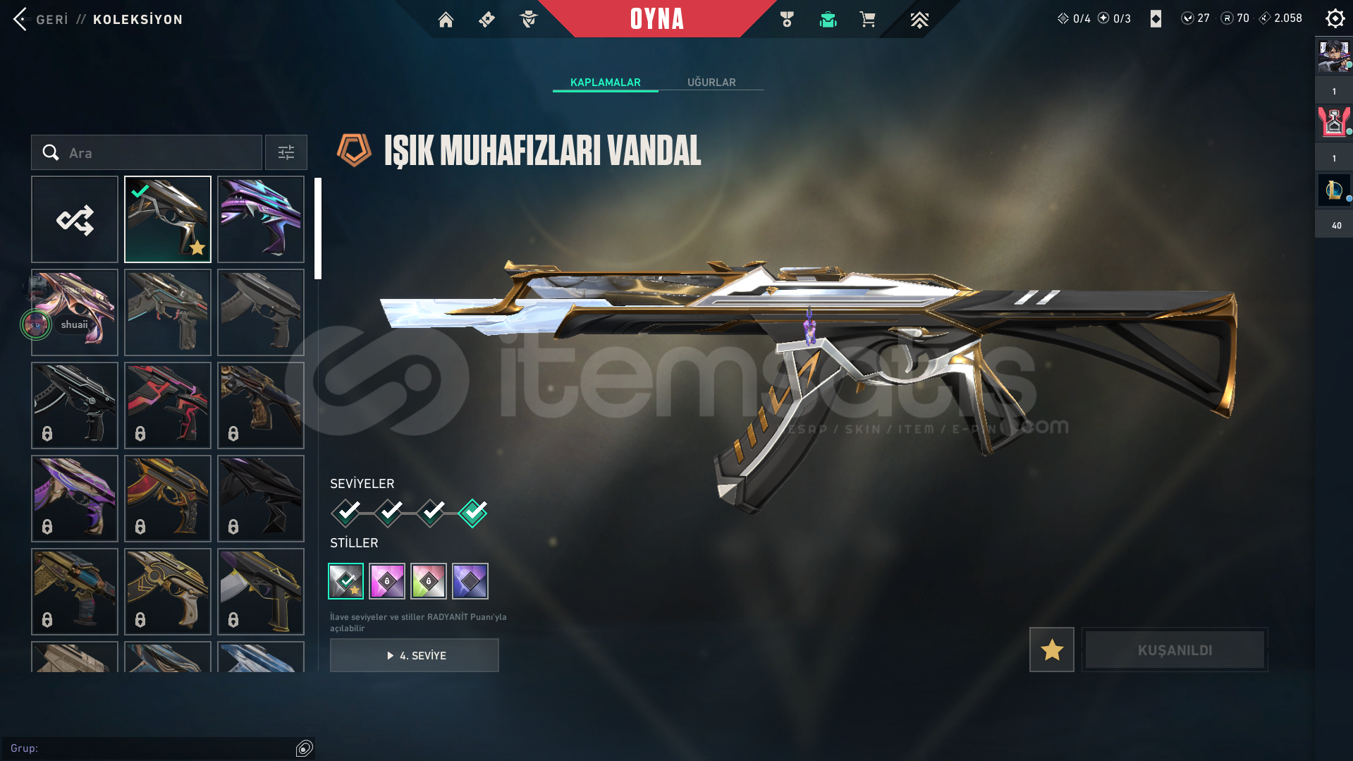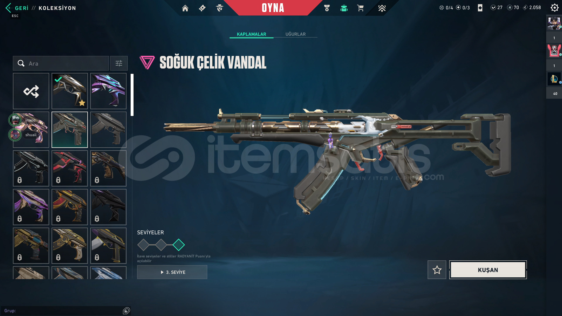 Hesapta:Sır Çiçeği VandalIşık Muhafızları VandalSoğuk Çelik VandalHesapta herhangi bir sorun yoktur. Eğer bir sorun olursa 7/24 yardımcı olunur.Pazarlık vardır. Alıcısına hayırlı olsun.