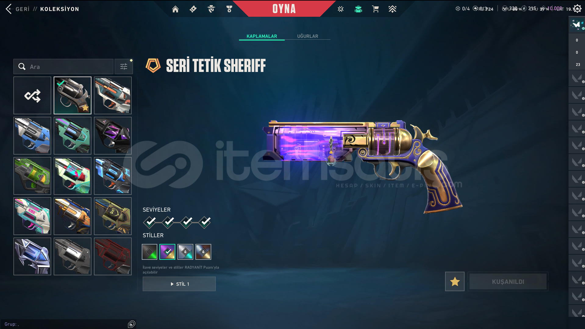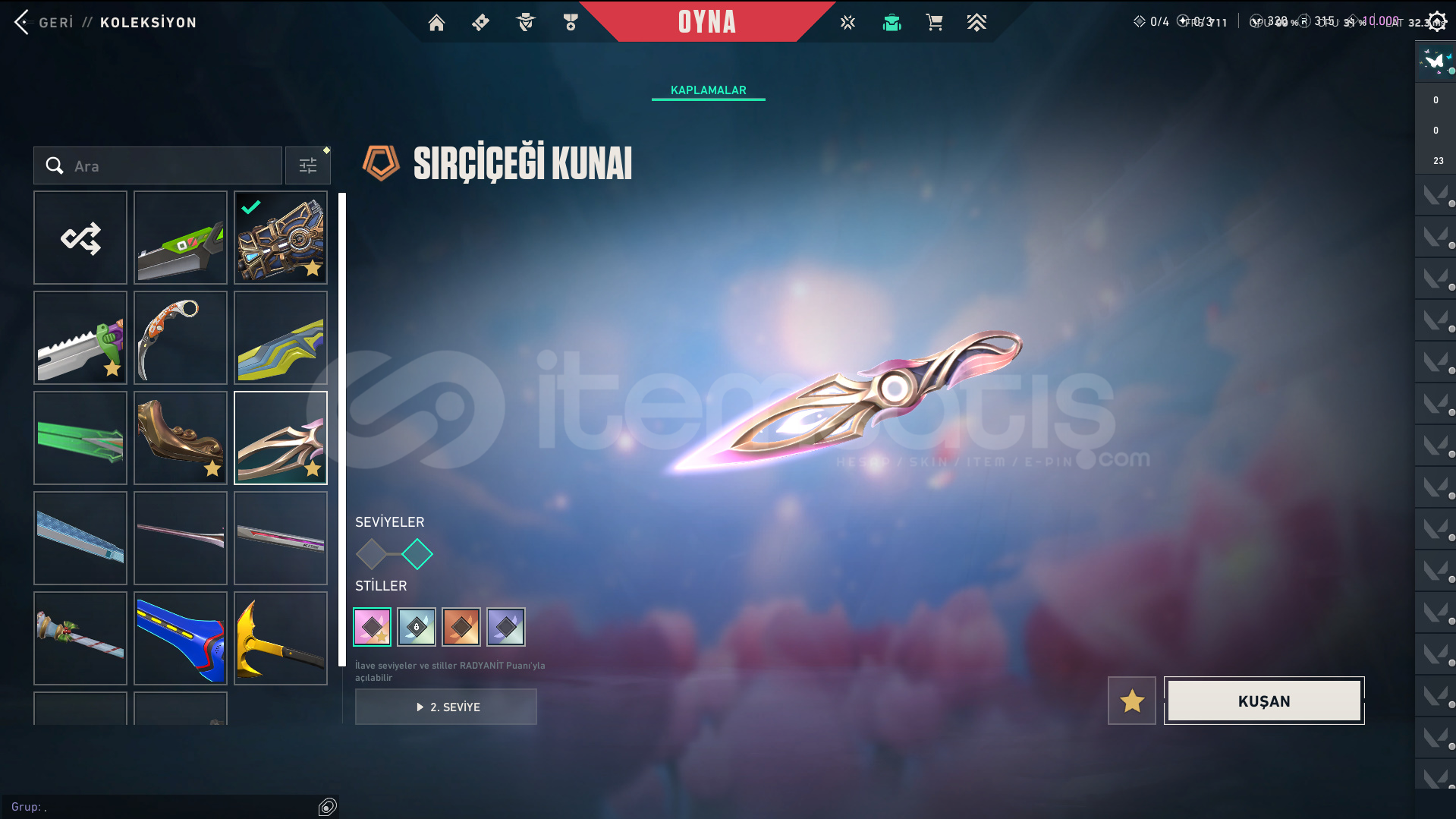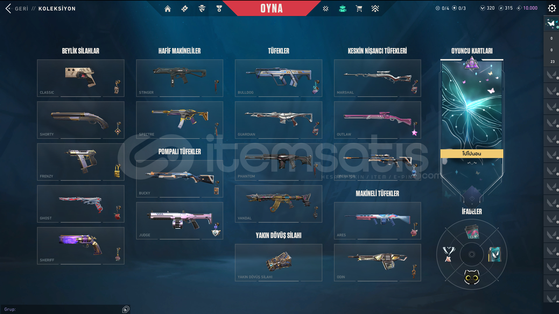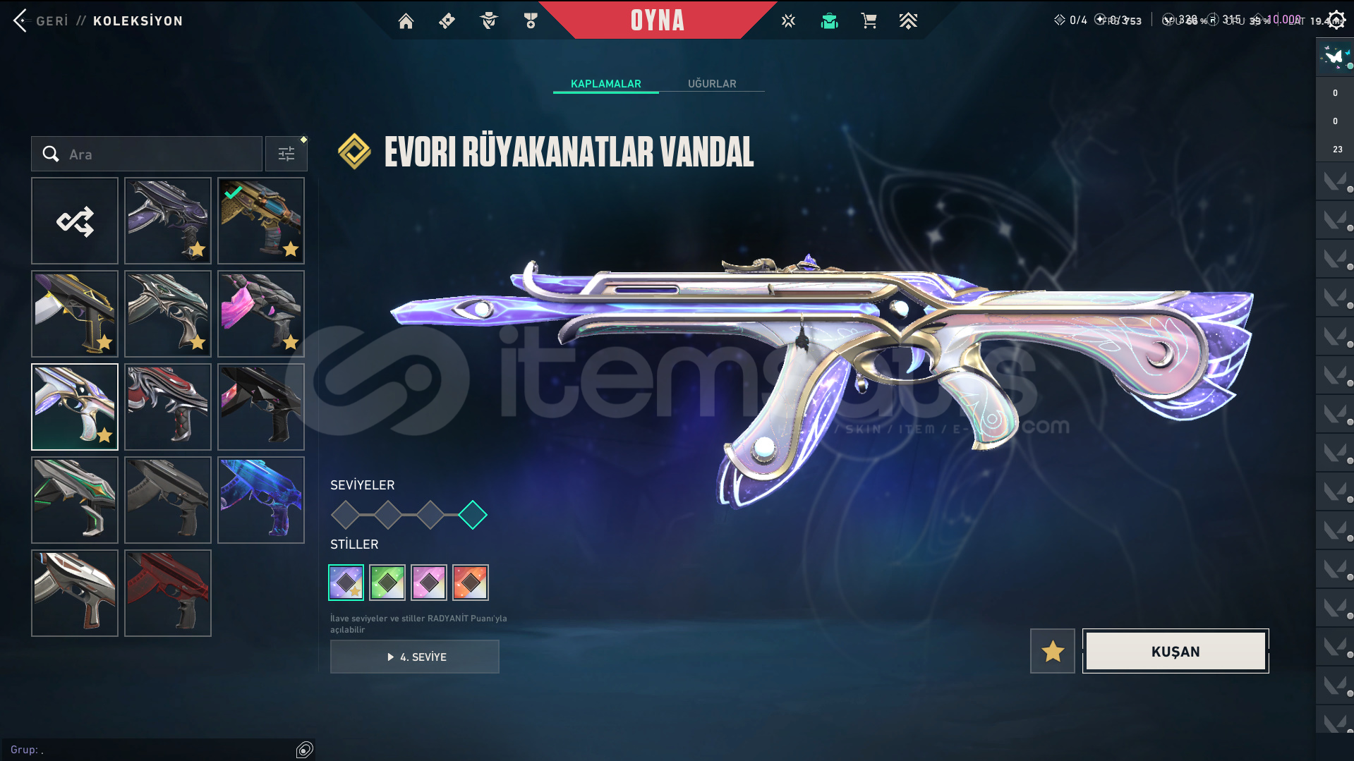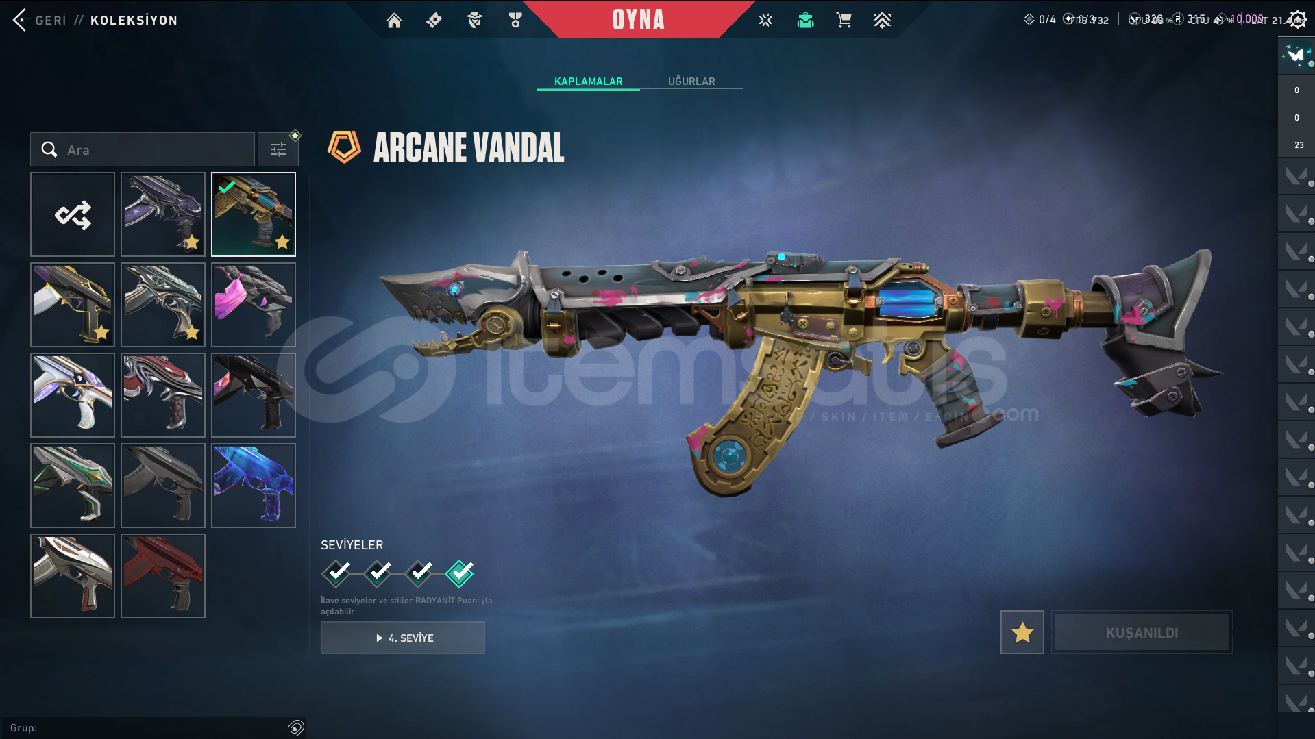 Skinler: Evori Dreamwings Vandal - Dolmir's Revenge Vandal - Arcane Vandal - Reaver Vandal - Prime Vandal - Forsaken Vandal / Reaver Phantom - Ion Phantom - BlastX Phantom / Neo Frontier Sheriff / Reaver Ghost - Gaia's Vengeance Ghost / Prime Spectre / Prime//2.0 Odin / Overlay Dagger - Velocity Karambit - Striker Knife - Comet Sword - Snowfall Wand - Prism III Axe - K/TAC Blade - Shellspire Sword - Ruyi Staff - Celestial Fan - Equilibrium - BlastX Polymer KnifeTech Coated Knife - Mystbloom Kunai - Power Fist - Arcane Gauntlets VE DAHA SAYAMADIKLARIM İLE BİRLİKTE TOPLAM 141 SKİN MEVCUTTUR.