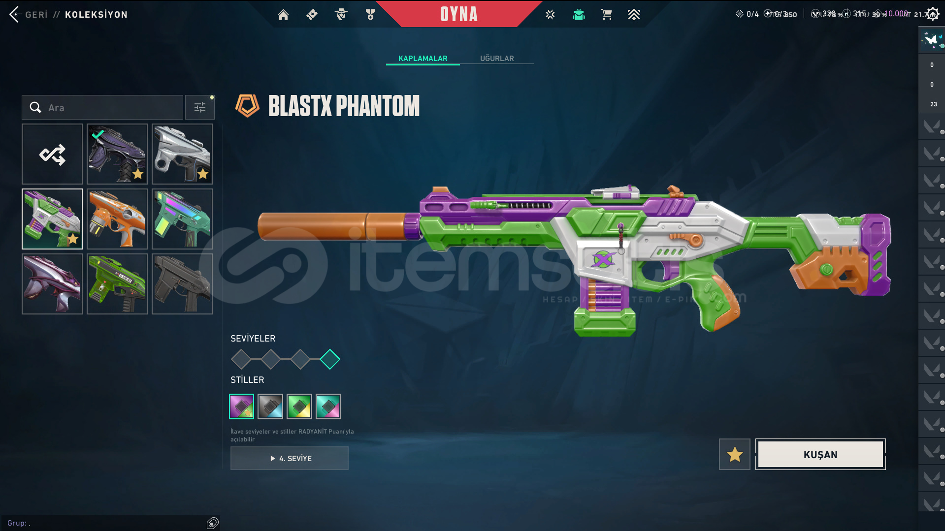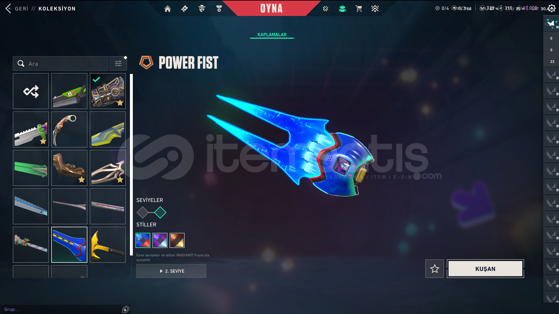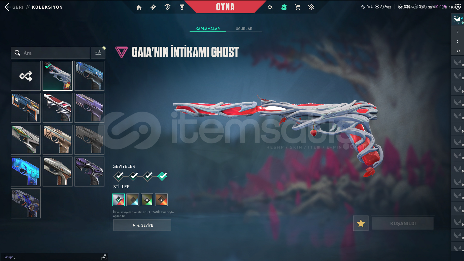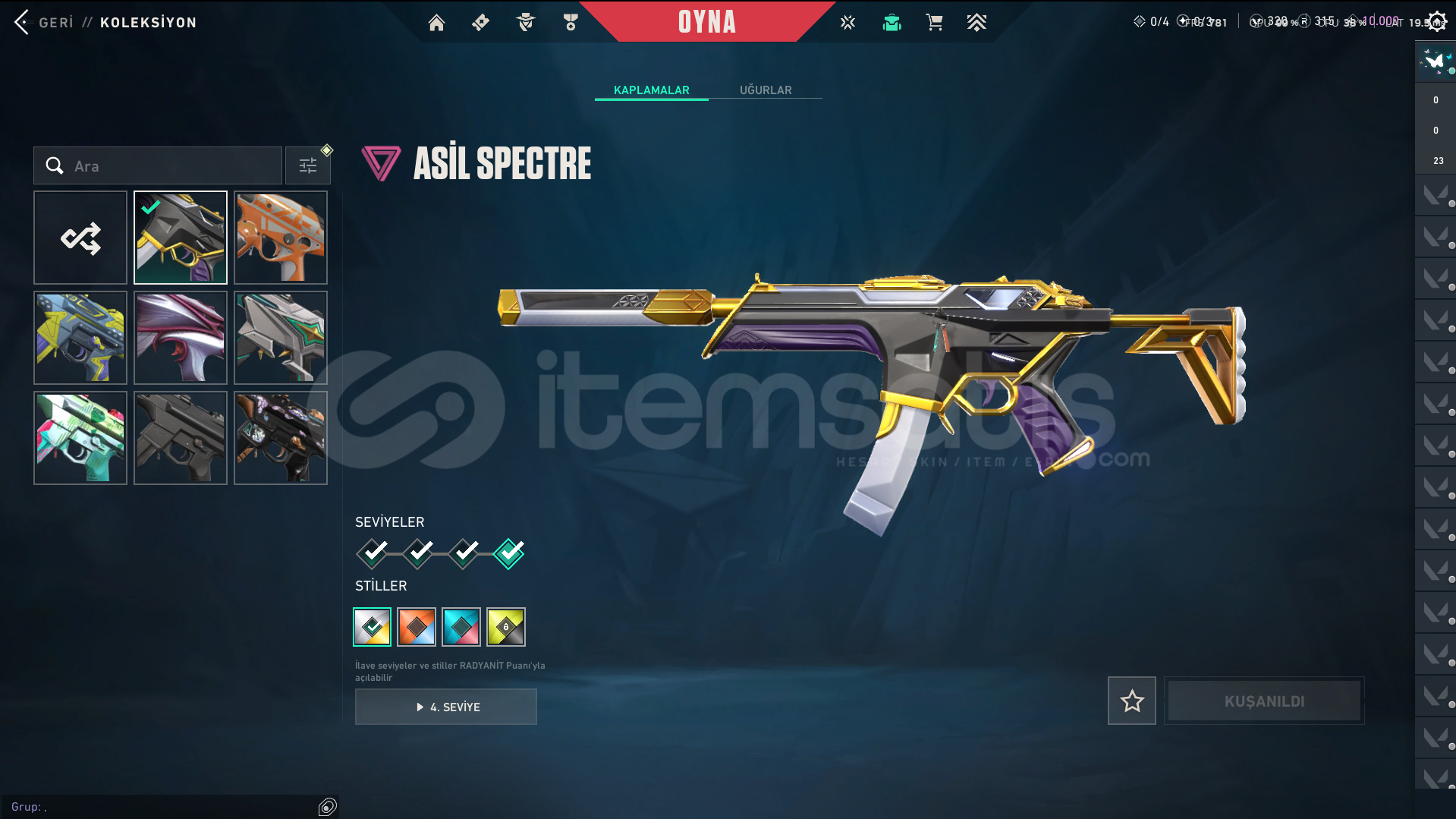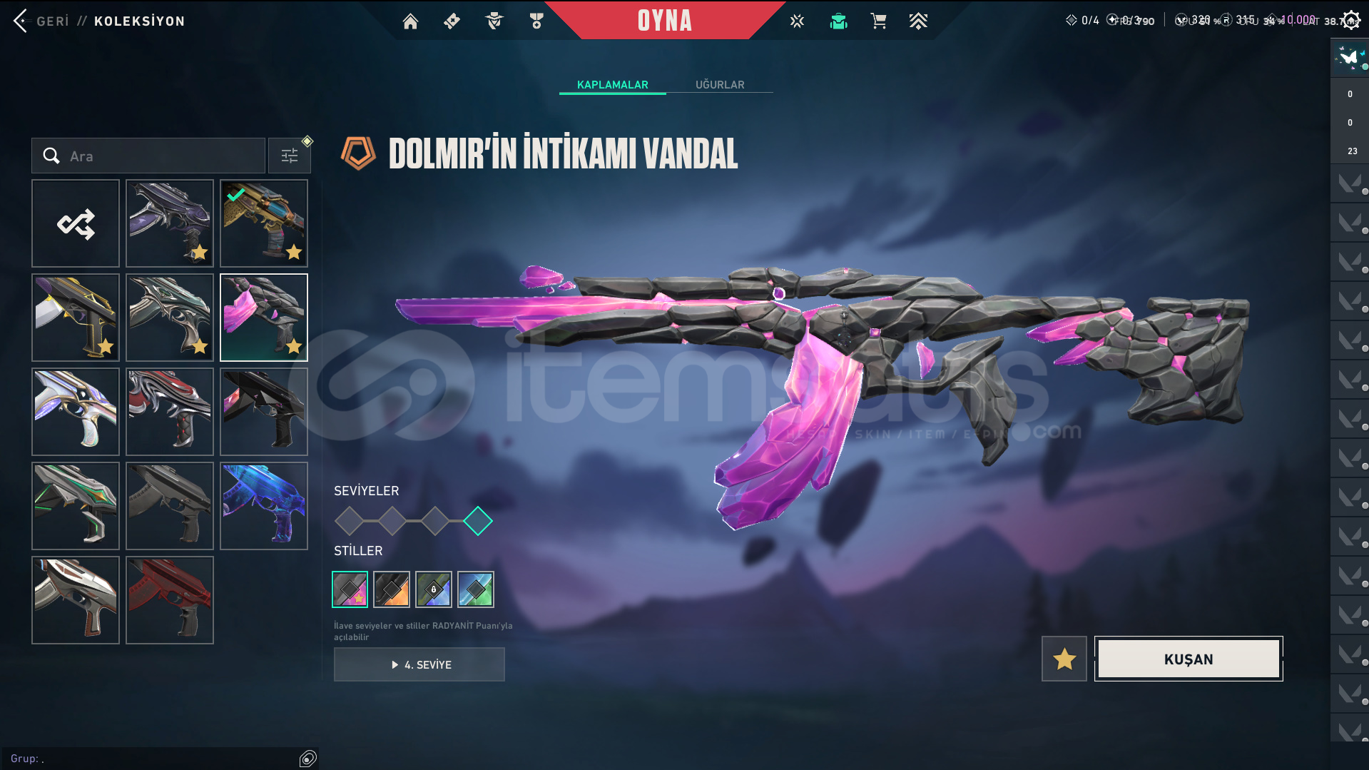 Skinler: Evori Dreamwings Vandal - Dolmir's Revenge Vandal - Arcane Vandal - Reaver Vandal - Prime Vandal - Forsaken Vandal / Reaver Phantom - Ion Phantom - BlastX Phantom / Neo Frontier Sheriff / Reaver Ghost - Gaia's Vengeance Ghost / Prime Spectre / Prime//2.0 Odin / Overlay Dagger - Velocity Karambit - Striker Knife - Comet Sword - Snowfall Wand - Prism III Axe - K/TAC Blade - Shellspire Sword - Ruyi Staff - Celestial Fan - Equilibrium - BlastX Polymer KnifeTech Coated Knife - Mystbloom Kunai - Power Fist - Arcane Gauntlets VE DAHA SAYAMADIKLARIM İLE BİRLİKTE TOPLAM 141 SKİN MEVCUTTUR.