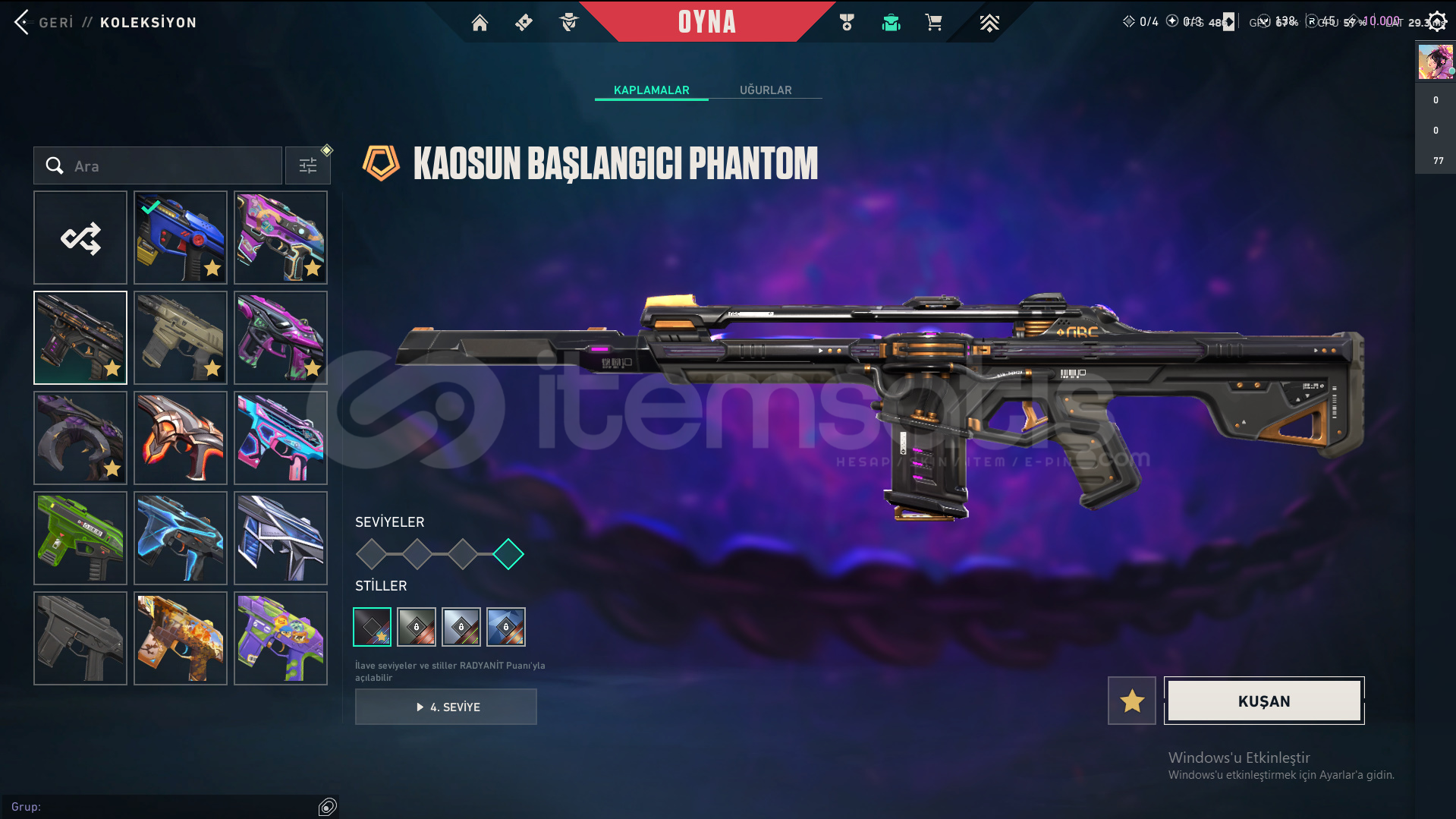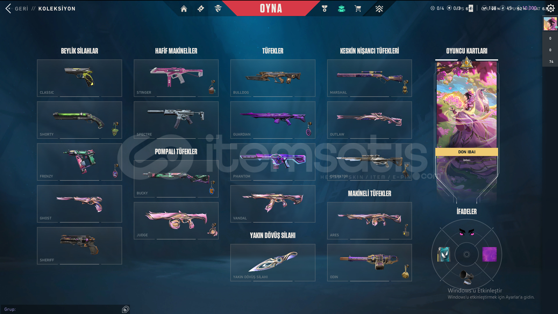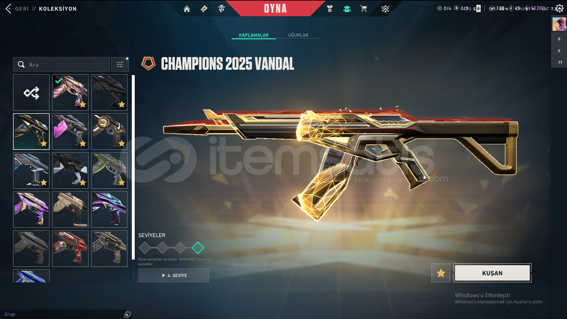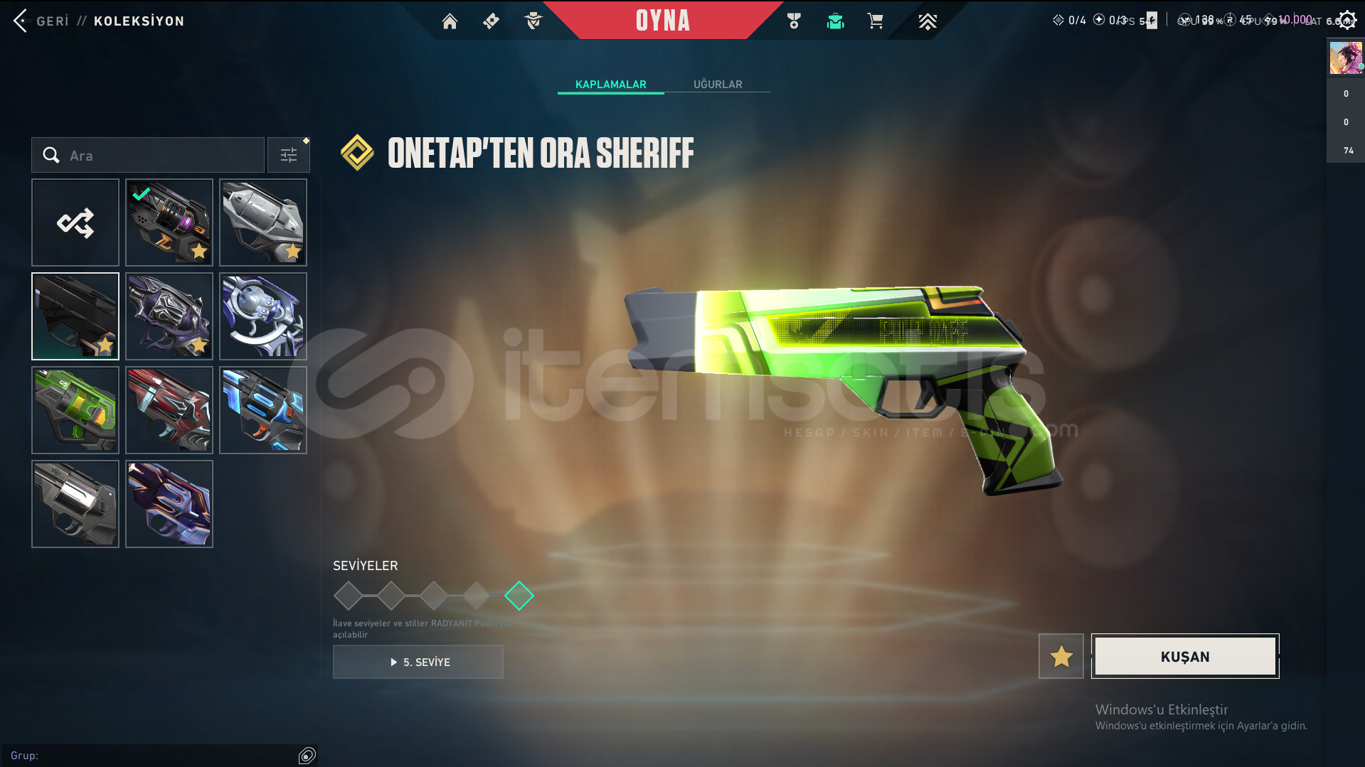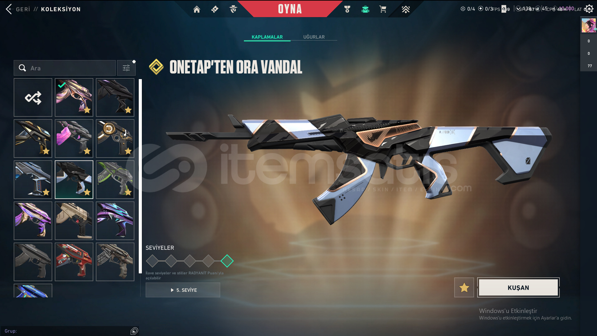 Skinler: ORA by OneTap Vandal - Kuronami Vandal - Overdrive Vandal - Dolmir's Revenge Vandal - Singularity Vandal - Mystbloom Vandal - RGX 11z Pro Vandal - Champions 2025 Vandal - Origin Vandal / Recon Phantom - Prelude to Chaos Phantom - Bubblegum Deathwish Phantom - Glitchpop Phantom - Nocturnum Phantom - Radiant Entertainment System Phantom / ORA by OneTap Sheriff - Prelude to Chaos Sheriff - Reaver Sheriff - Ion Sheriff / Reaver Ghost - Recon Ghost - Sovereign Ghost - Mystbloom Ghost / Elderflame Operator - Sentinels of Light Operator / Mystbloom Judge / Mystbloom Outlaw / Araxys Guardian / Neo Frontier Odin / Neo Frontier Marshal - Sovereign Marshal / Mystbloom Ares / Prime Classic / Aemondir Bulldog / Radiant Crisis 001 Spectre / Torque Coiler - Overlay Dagger - Heart Splitter - Xenohunter Knife - ATLAS // CMD Baton - Interhelm Sword - Recon Balisong - Iridian Thorn Blade - Mystbloom Kunai - EX.O Edge - Mystbloom Fanblade VE DAHA SAYAMADIKLARIM İLE BİRLİKTE TOPLAM 145 SKİN MEVCUTTUR.