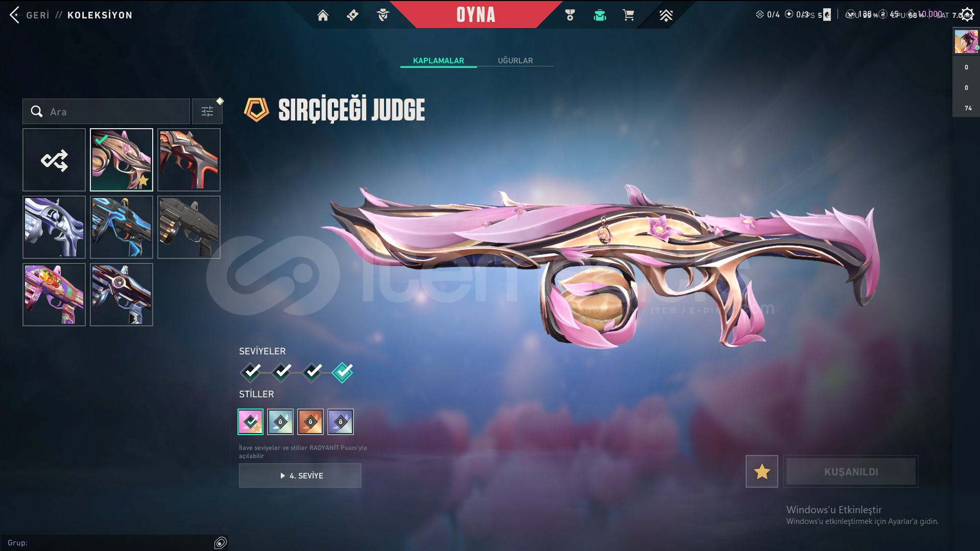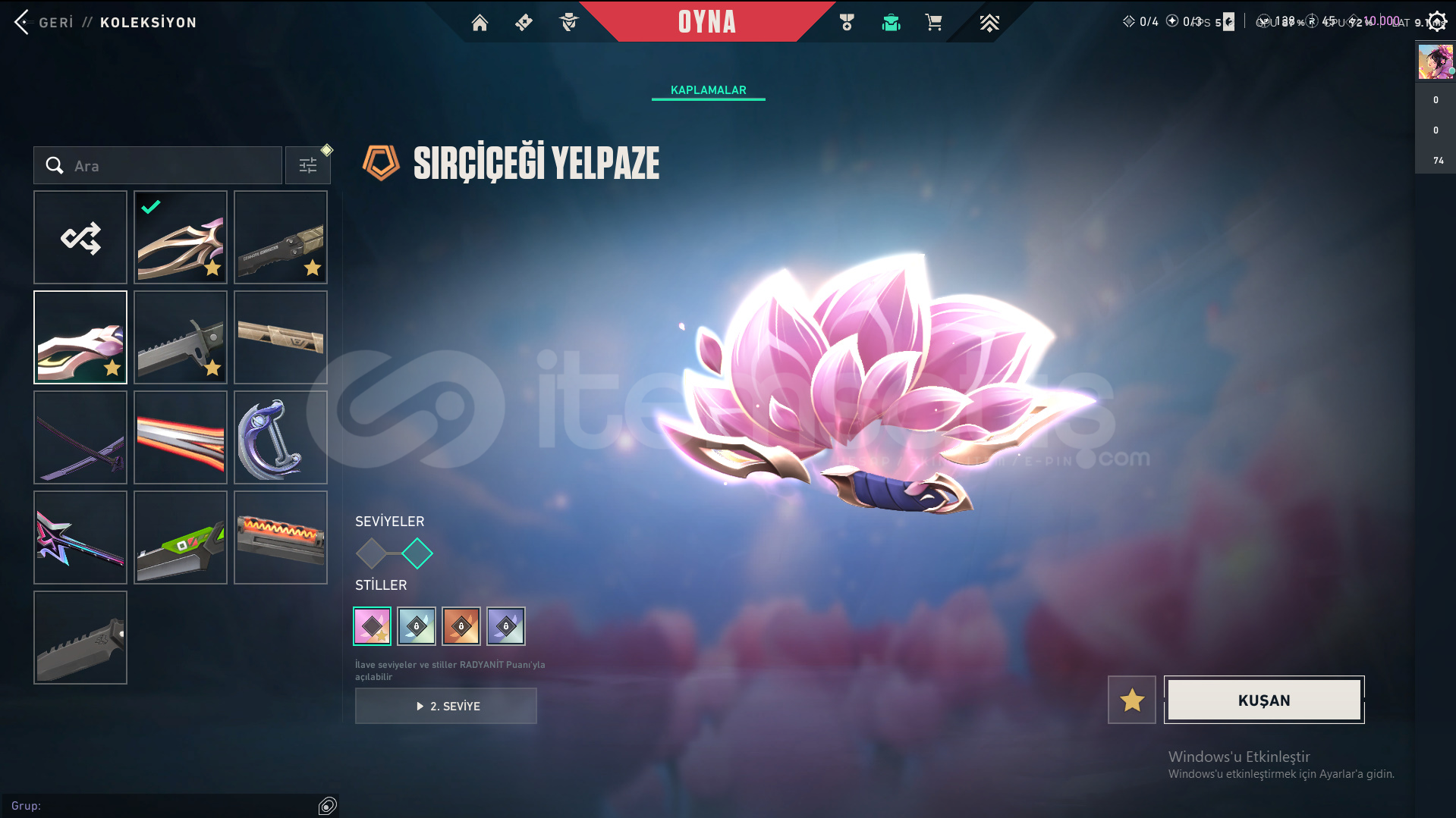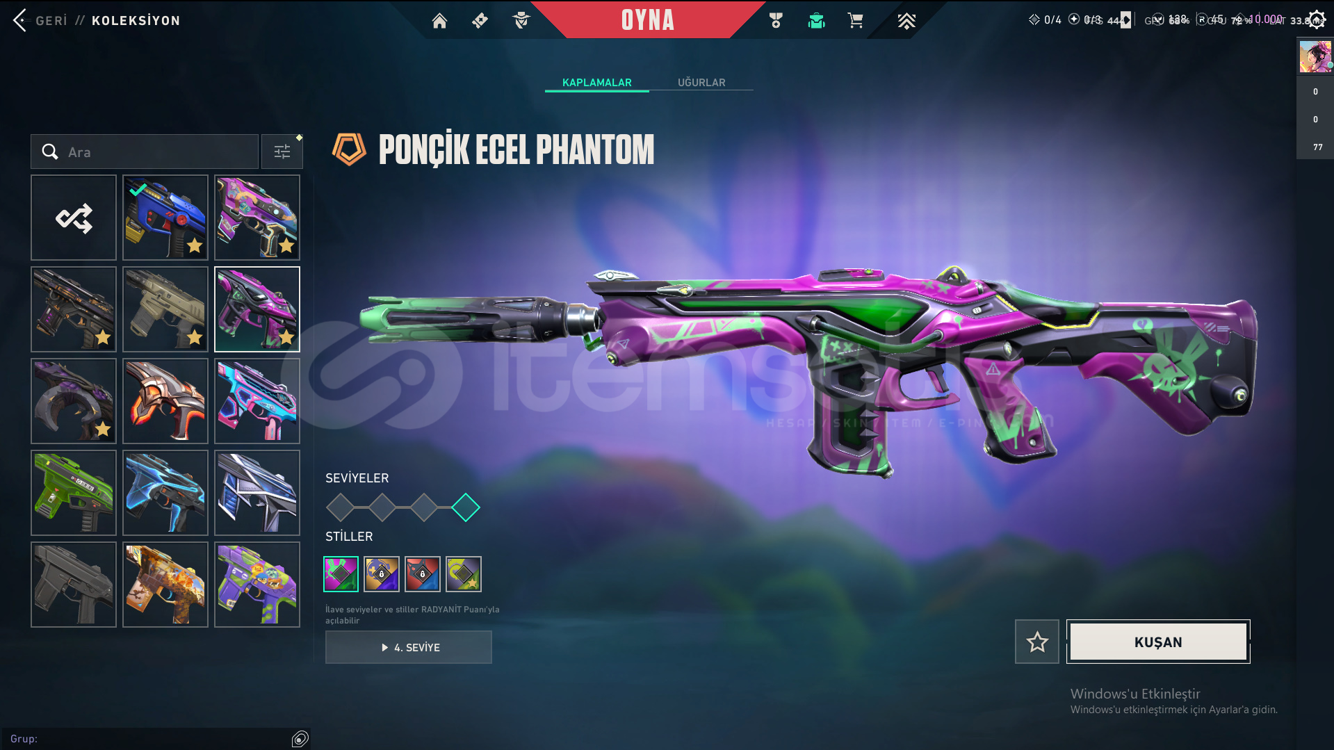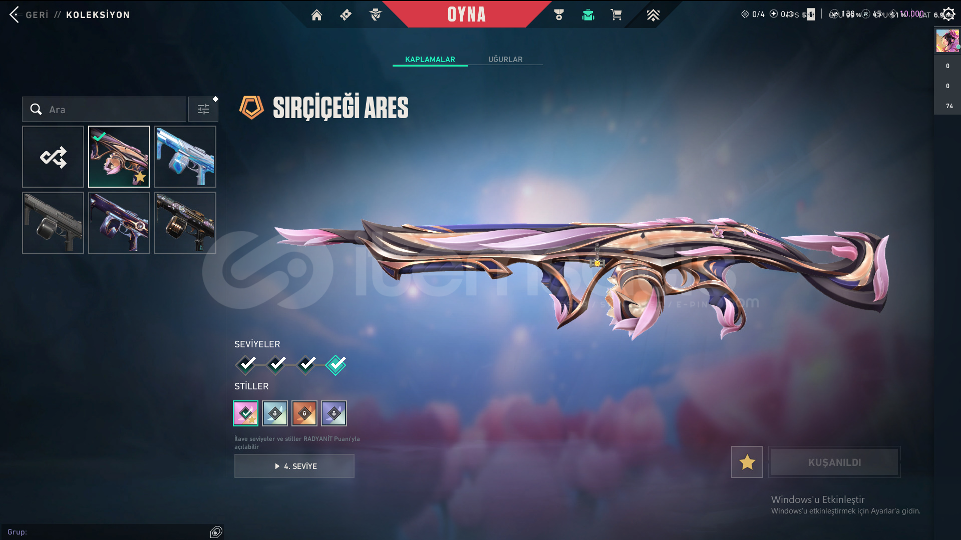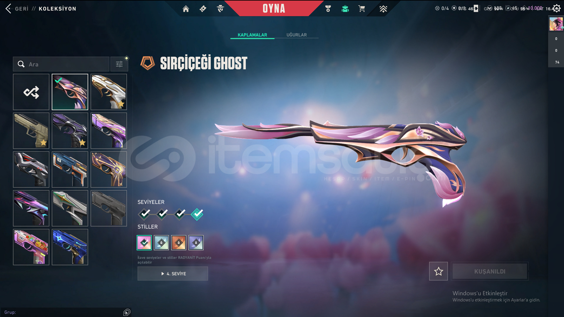 Skinler: ORA by OneTap Vandal - Kuronami Vandal - Overdrive Vandal - Dolmir's Revenge Vandal - Singularity Vandal - Mystbloom Vandal - RGX 11z Pro Vandal - Champions 2025 Vandal - Origin Vandal / Recon Phantom - Prelude to Chaos Phantom - Bubblegum Deathwish Phantom - Glitchpop Phantom - Nocturnum Phantom - Radiant Entertainment System Phantom / ORA by OneTap Sheriff - Prelude to Chaos Sheriff - Reaver Sheriff - Ion Sheriff / Reaver Ghost - Recon Ghost - Sovereign Ghost - Mystbloom Ghost / Elderflame Operator - Sentinels of Light Operator / Mystbloom Judge / Mystbloom Outlaw / Araxys Guardian / Neo Frontier Odin / Neo Frontier Marshal - Sovereign Marshal / Mystbloom Ares / Prime Classic / Aemondir Bulldog / Radiant Crisis 001 Spectre / Torque Coiler - Overlay Dagger - Heart Splitter - Xenohunter Knife - ATLAS // CMD Baton - Interhelm Sword - Recon Balisong - Iridian Thorn Blade - Mystbloom Kunai - EX.O Edge - Mystbloom Fanblade VE DAHA SAYAMADIKLARIM İLE BİRLİKTE TOPLAM 145 SKİN MEVCUTTUR.