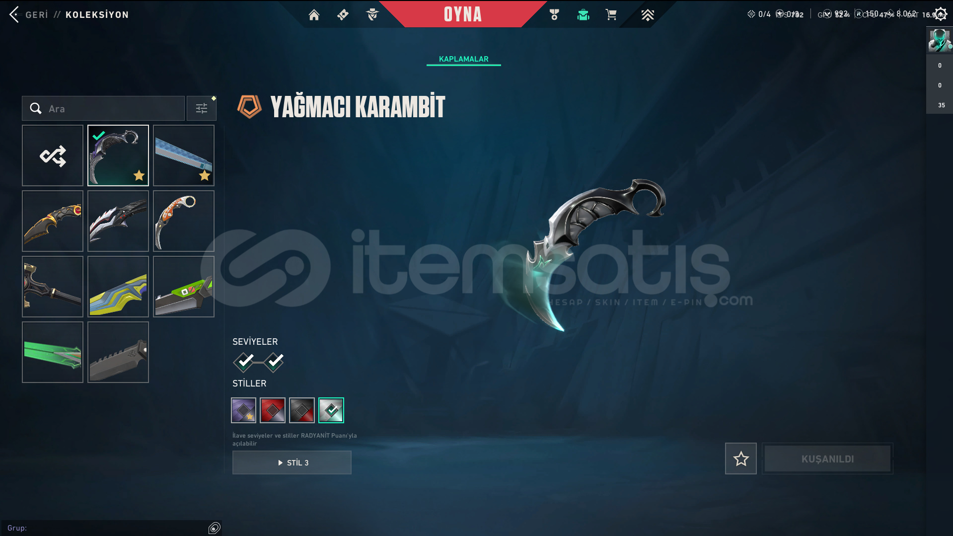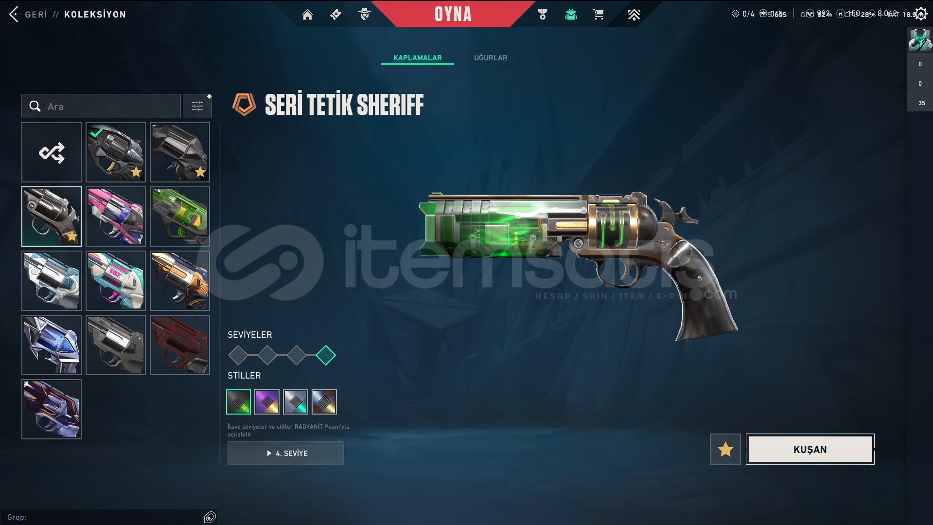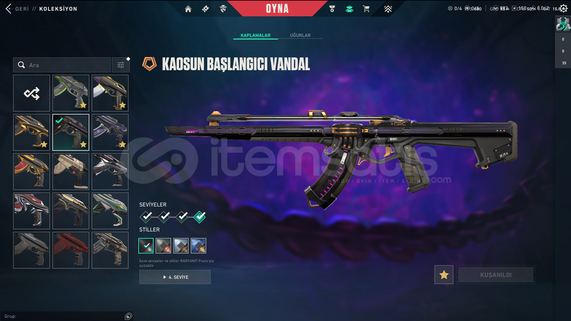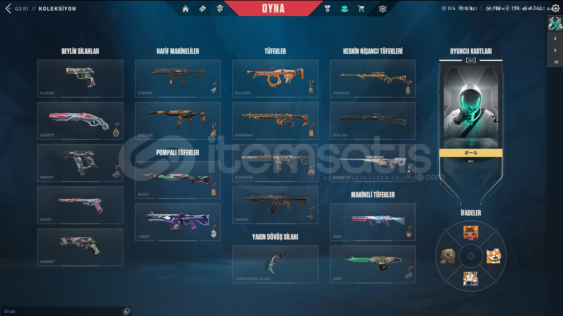 Skinler: Prelude to Chaos Vandal - RGX 11z Pro Vandal - Reaver Vandal - Prime Vandal - Valiant Hero Vandal / Ion Phantom - Recon Phantom - Neo Frontier Phantom / Protocol 781-A Sheriff - Neo Frontier Sheriff - Singularity Sheriff / Origin Operator / Gaia's Vengeance Ghost / Gaia's Vengeance Shorty / Forsaken Classic / XERØFANG Ghost / Velocity Karambit - Ruin Dagger - Equilibrium - Striker Knife - Overlay Dagger - Guardrail Hammer - Byteshift Knife - Comet Sword - Reaver Karambit VE DAHA SAYAMADIKLARIM İLE BİRLİKTE TOPLAM 152 SKİN MEVCUTTUR.