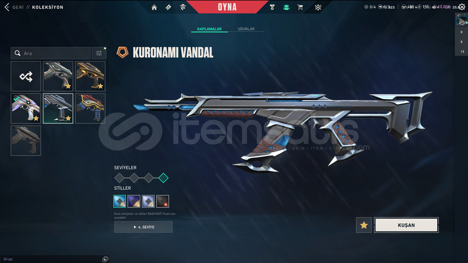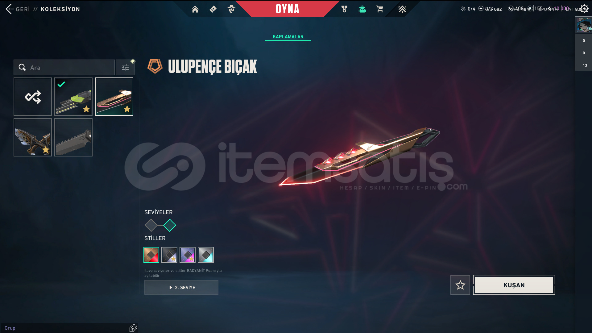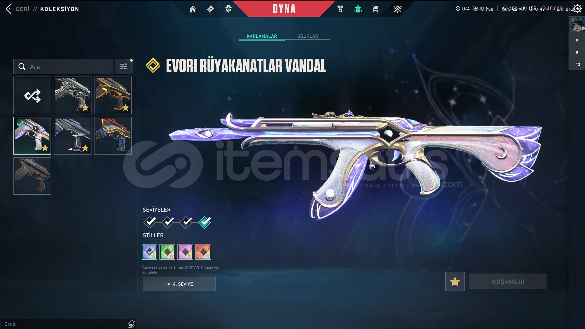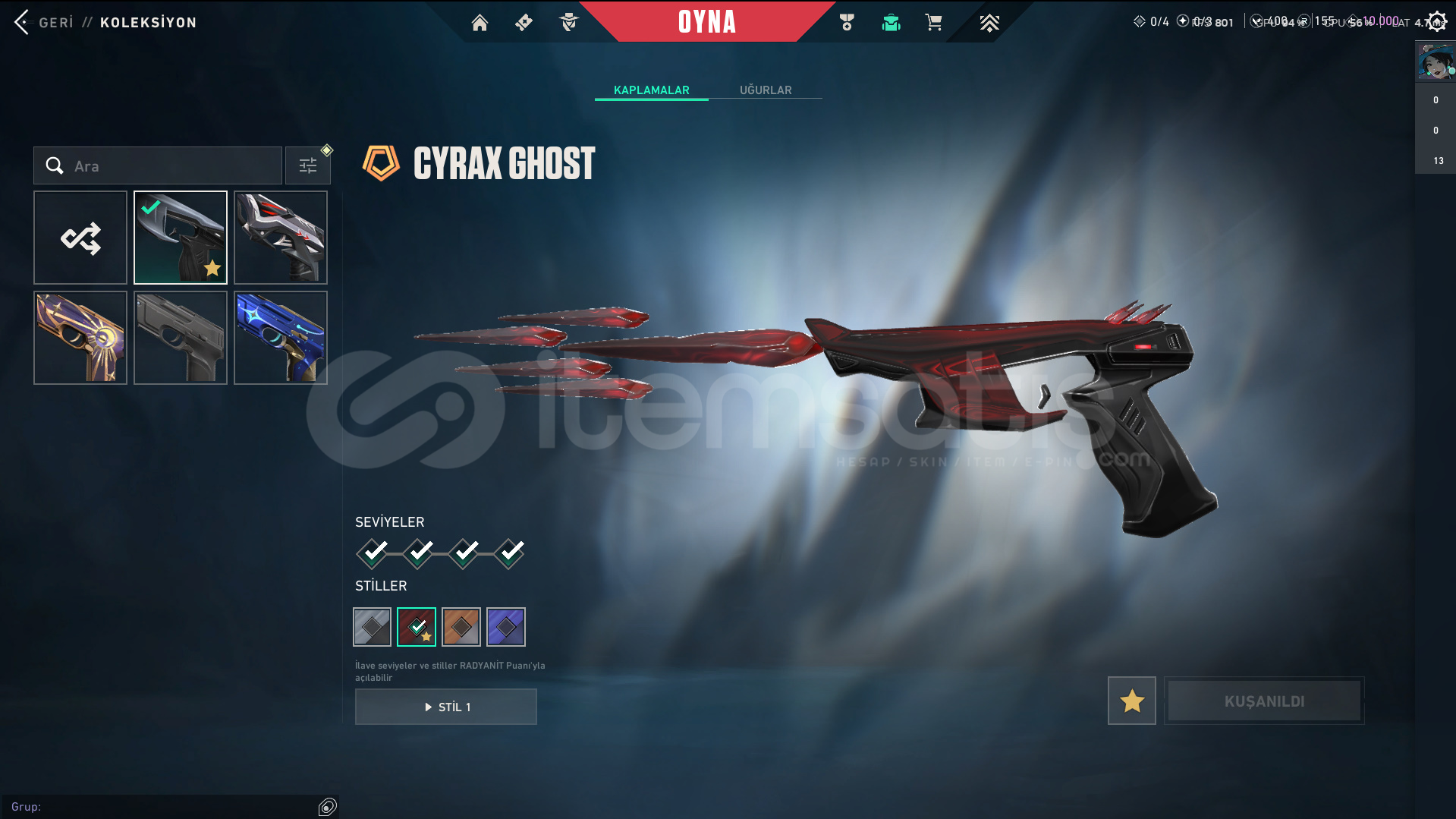 Skinler: Evori Dreamwings Vandal - Forsaken Vandal - Kuronami Vandal - Valiant Hero Vandal - Oni Vandal / Reaver Phantom / Reaver Operator / Sovereign Guardian / Neo Frontier Marshal / Sentinels of Light Sheriff / CYRAX Ghost / XERØFANG Knife - RGX 11z Pro Blade - Relic Stone Daggers VE DAHA SAYAMADIKLARIM İLE BİRLİKTE TOPLAM 30 SKİN MEVCUTTUR.