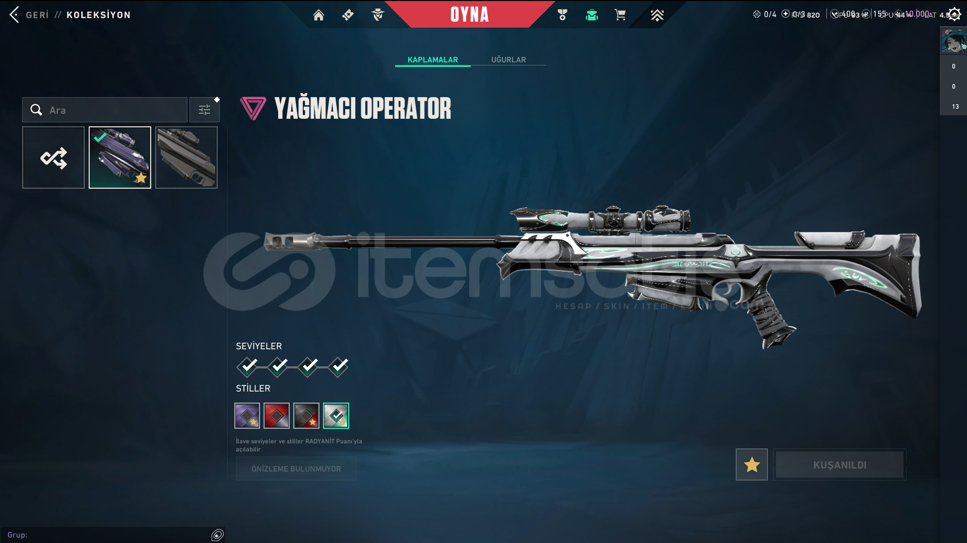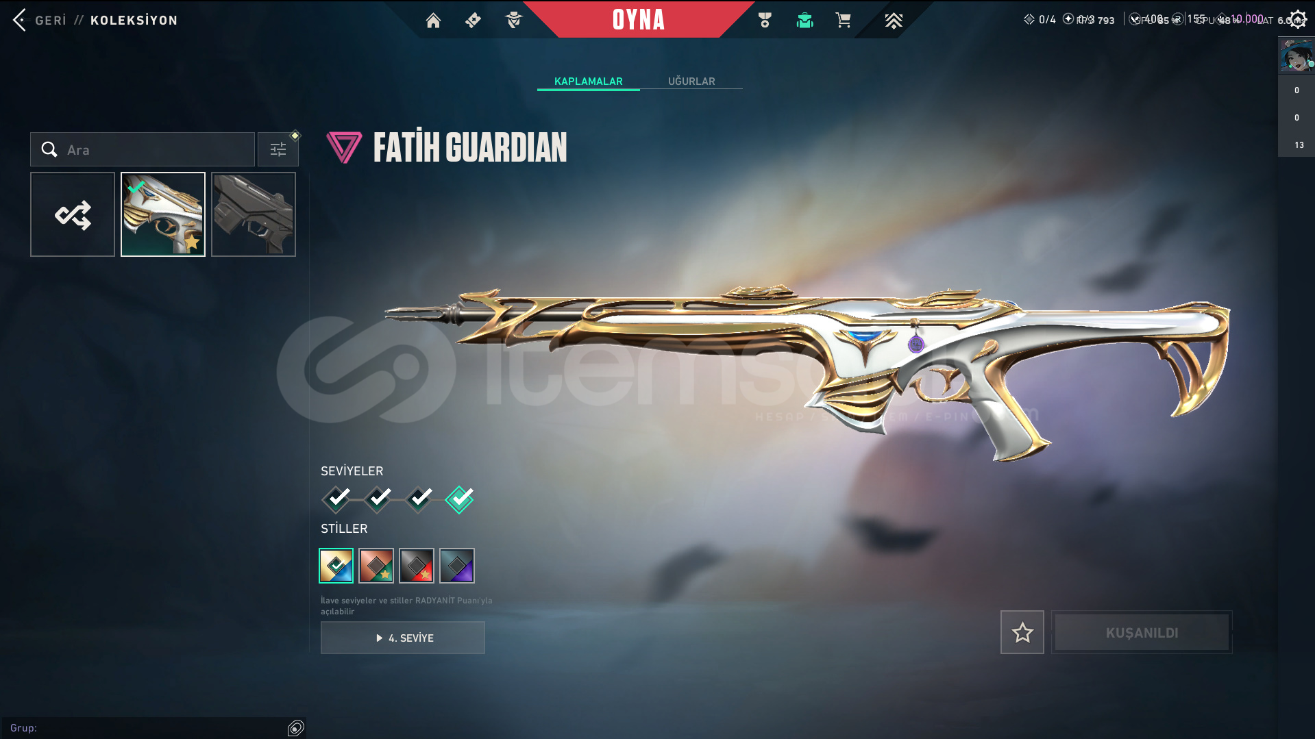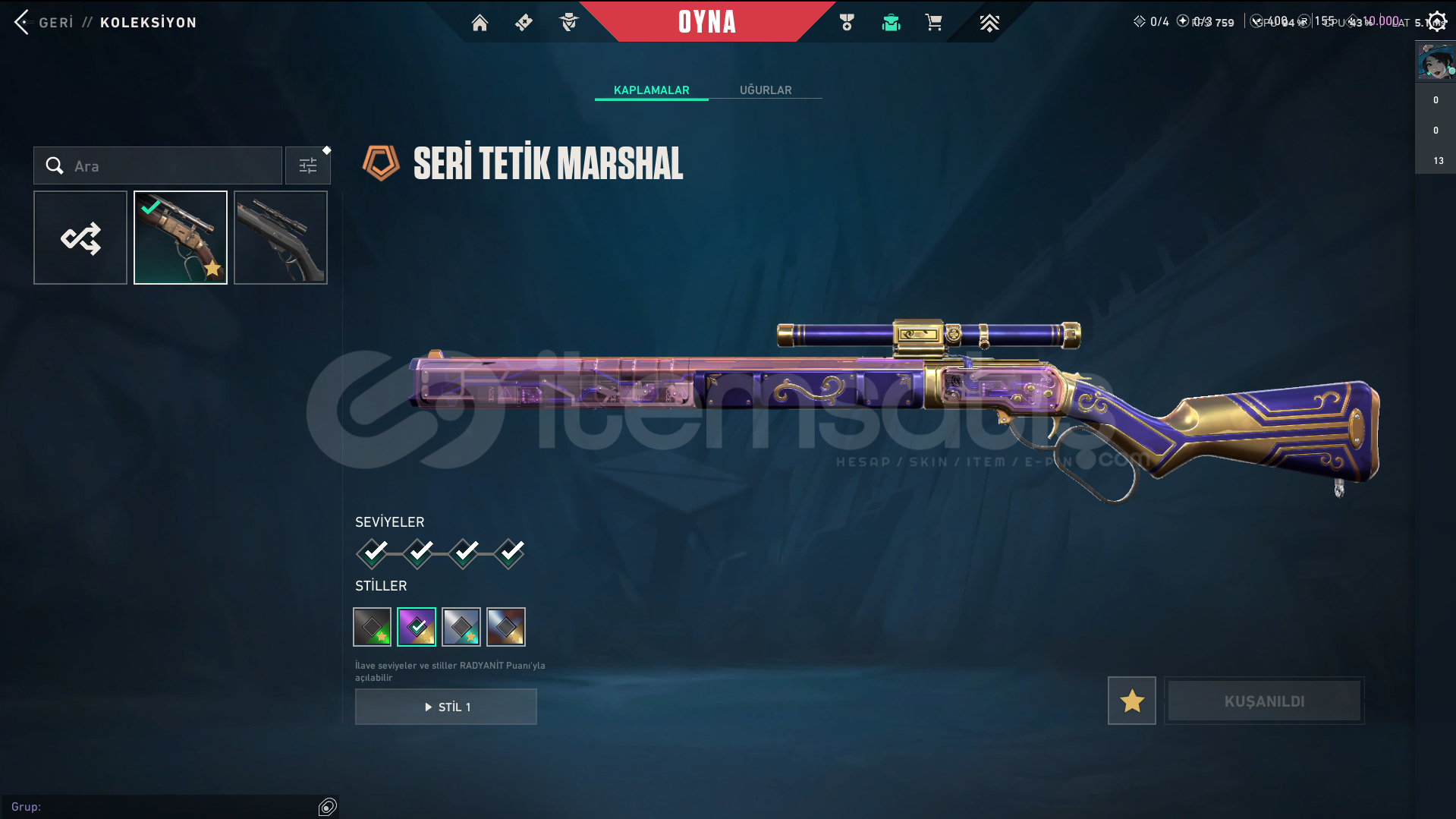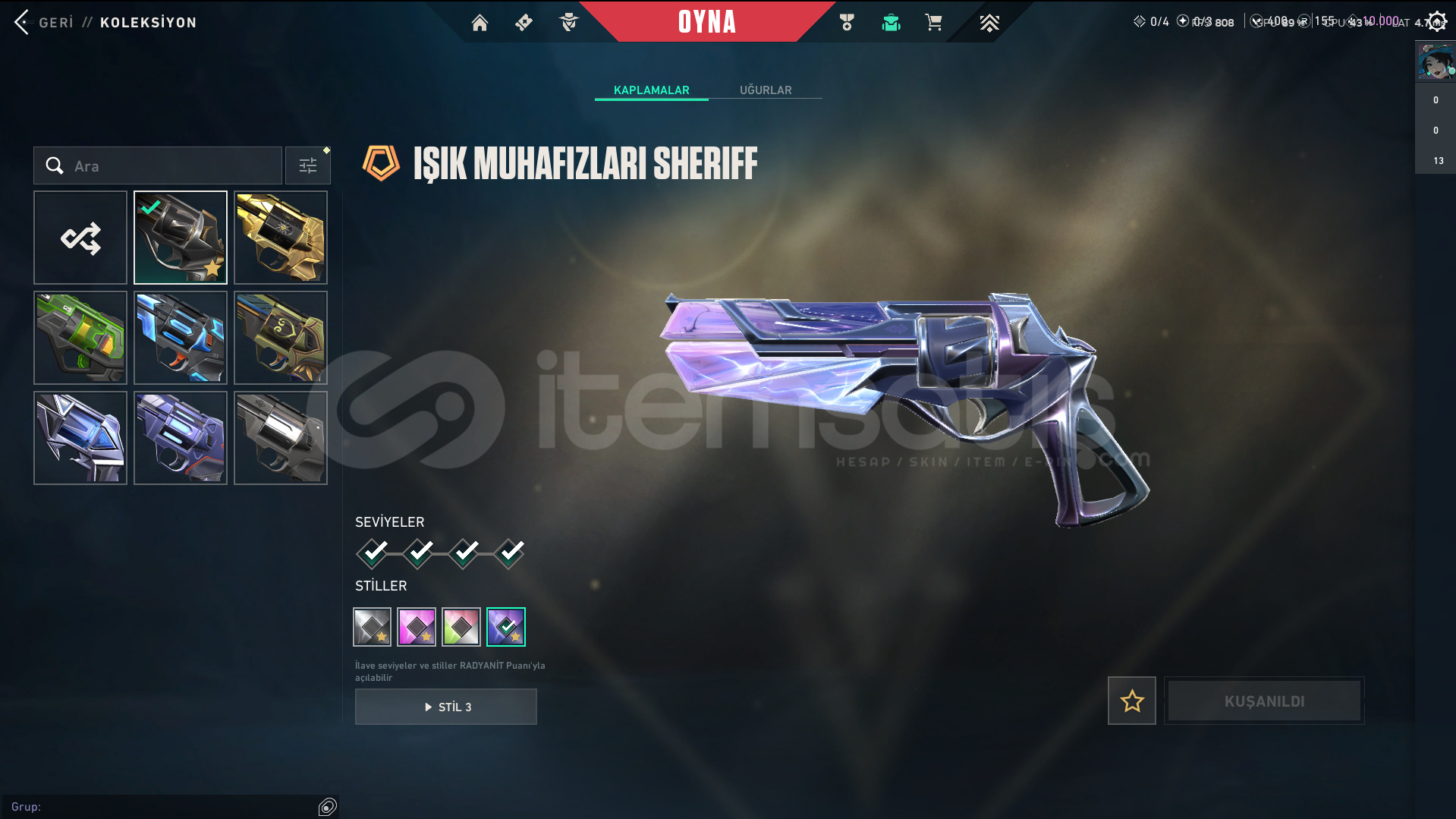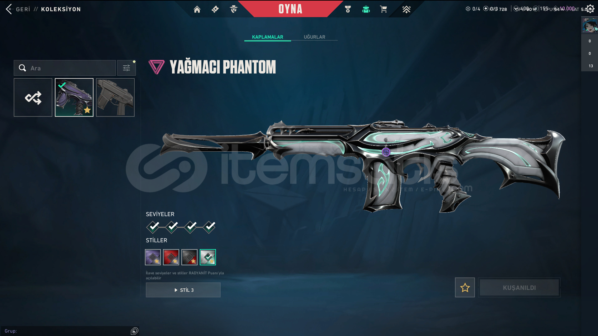 Skinler: Evori Dreamwings Vandal - Forsaken Vandal - Kuronami Vandal - Valiant Hero Vandal - Oni Vandal / Reaver Phantom / Reaver Operator / Sovereign Guardian / Neo Frontier Marshal / Sentinels of Light Sheriff / CYRAX Ghost / XERØFANG Knife - RGX 11z Pro Blade - Relic Stone Daggers VE DAHA SAYAMADIKLARIM İLE BİRLİKTE TOPLAM 30 SKİN MEVCUTTUR.