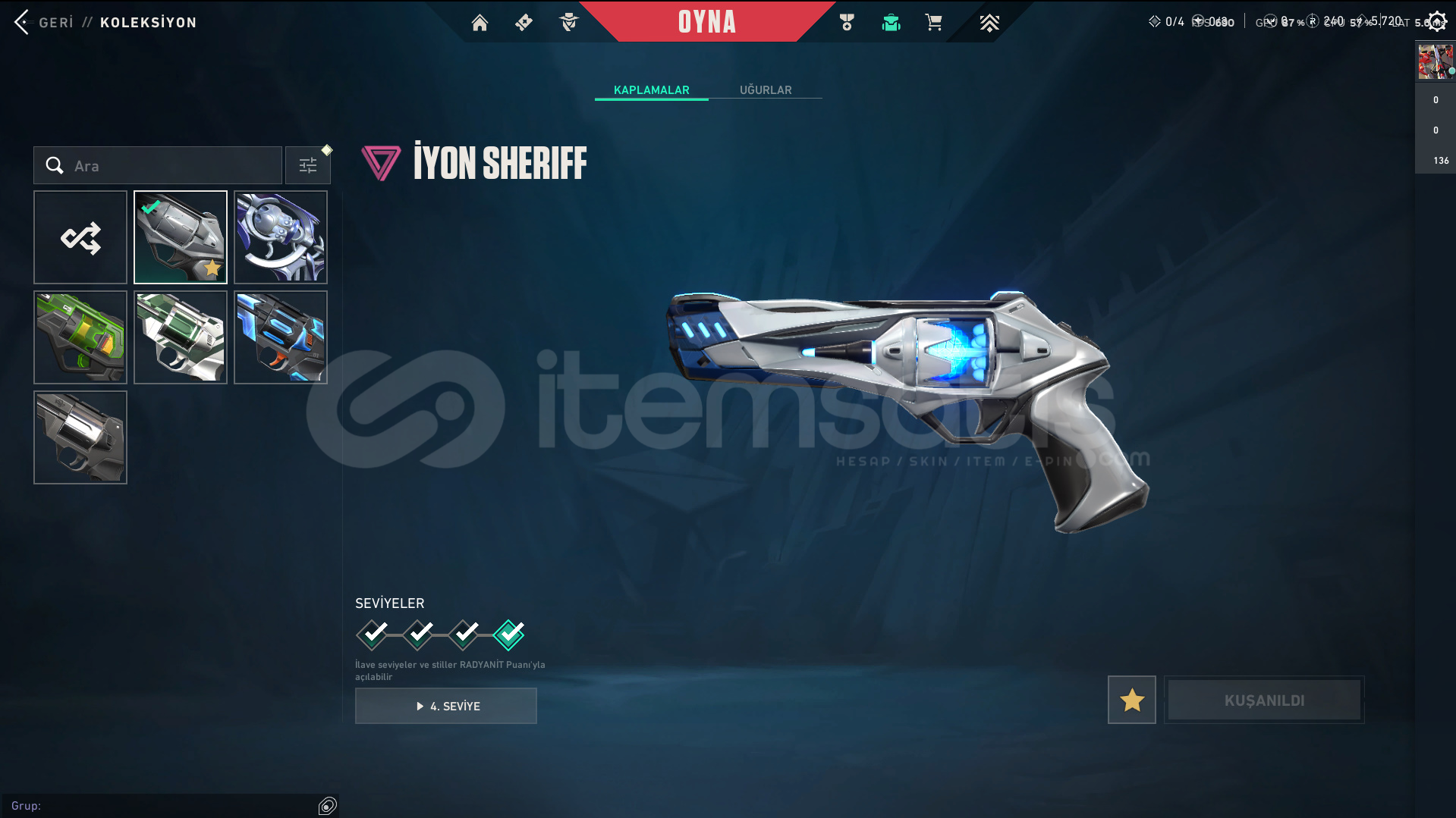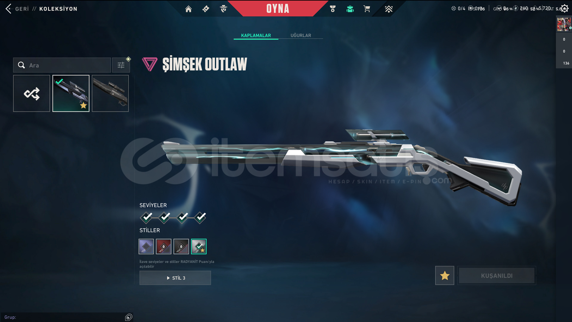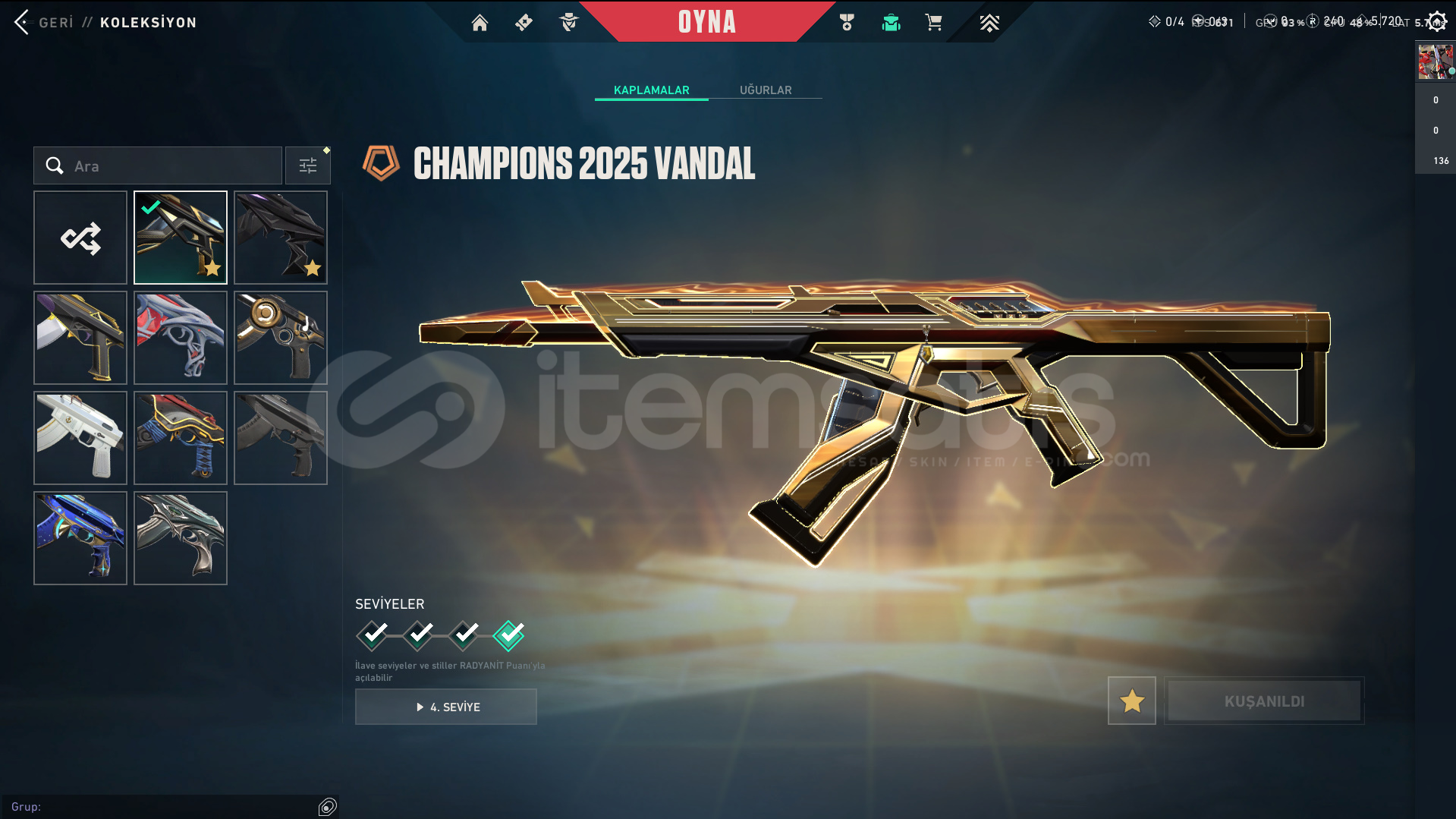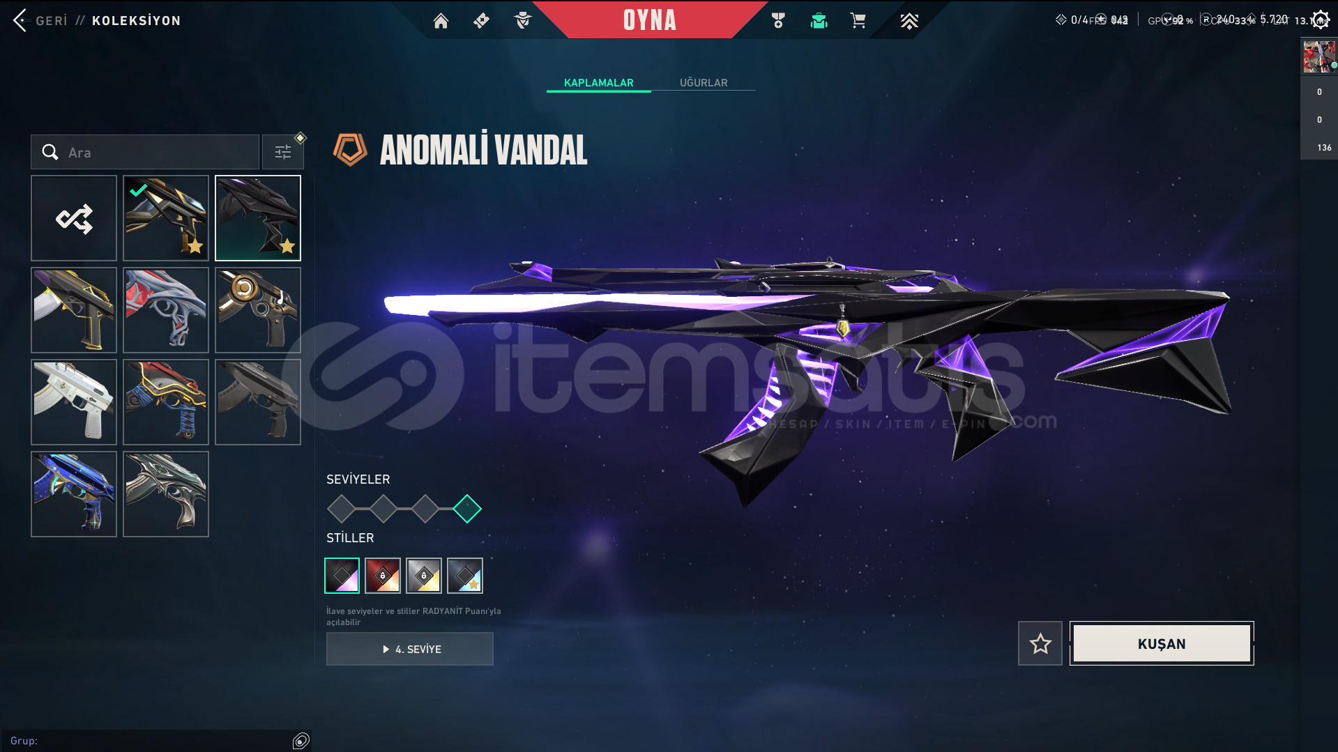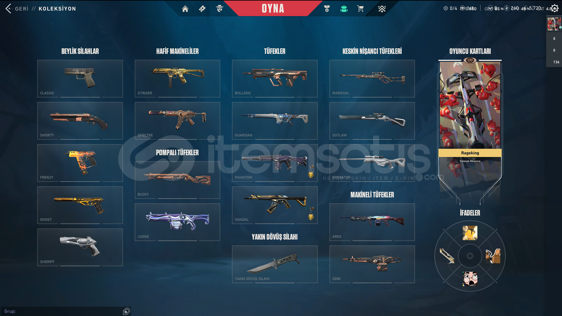 Skinler: Singularity Vandal - Champions 2025 Vandal - Neptune Vandal - Origin Vandal - Prime Vandal - Gaia's Vengeance Vandal - Oni Vandal - Forsaken Vandal / Reaver Phantom - ChronoVoid Phantom / Phaseguard Ghost / Bolt Outlaw / Recon Ghost / Black.Market Classic / Ion Operator / Ion Sheriff / Magepunk Spectre / Xenohunter Knife VE DAHA SAYAMADIKLARIM İLE BİRLİKTE TOPLAM 45 SKİN MEVCUTTUR.