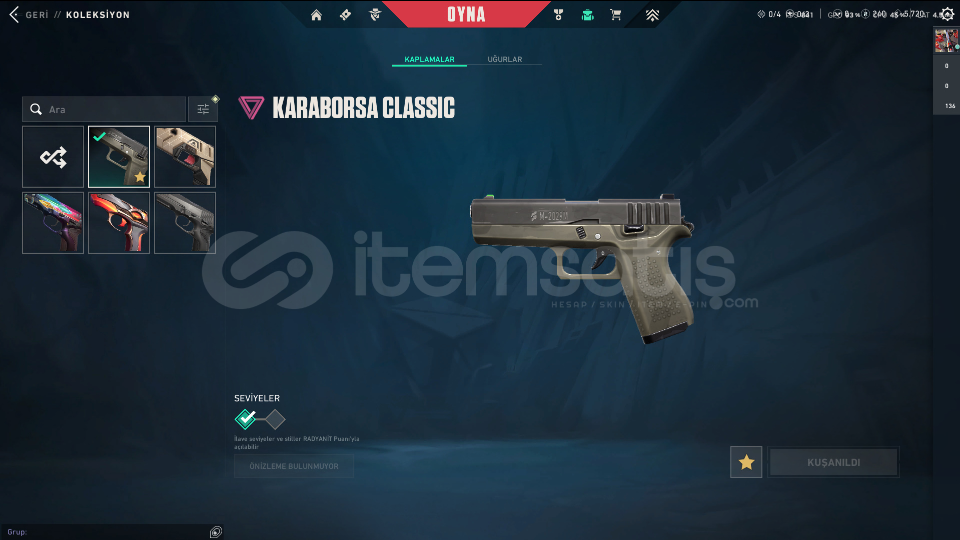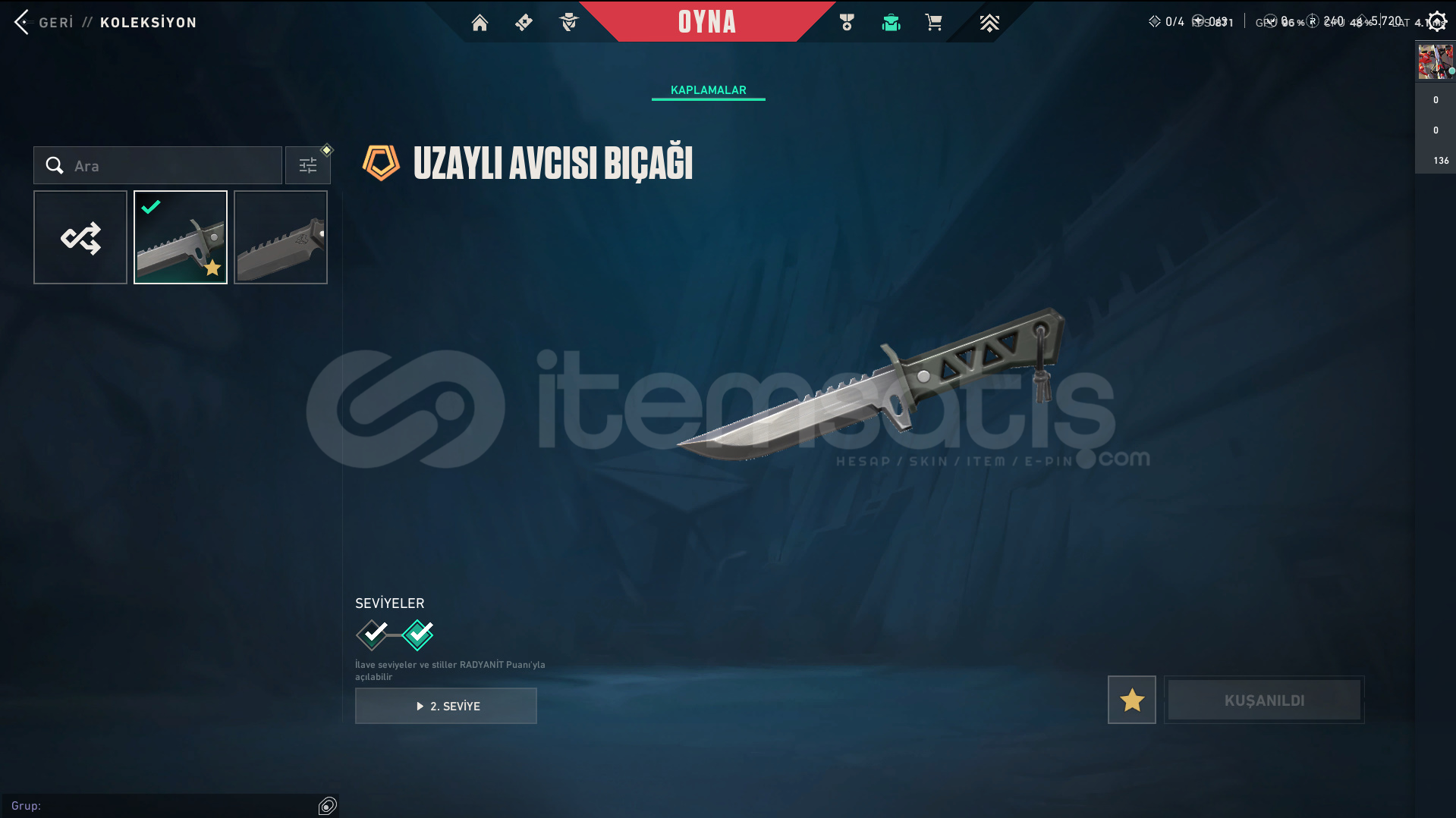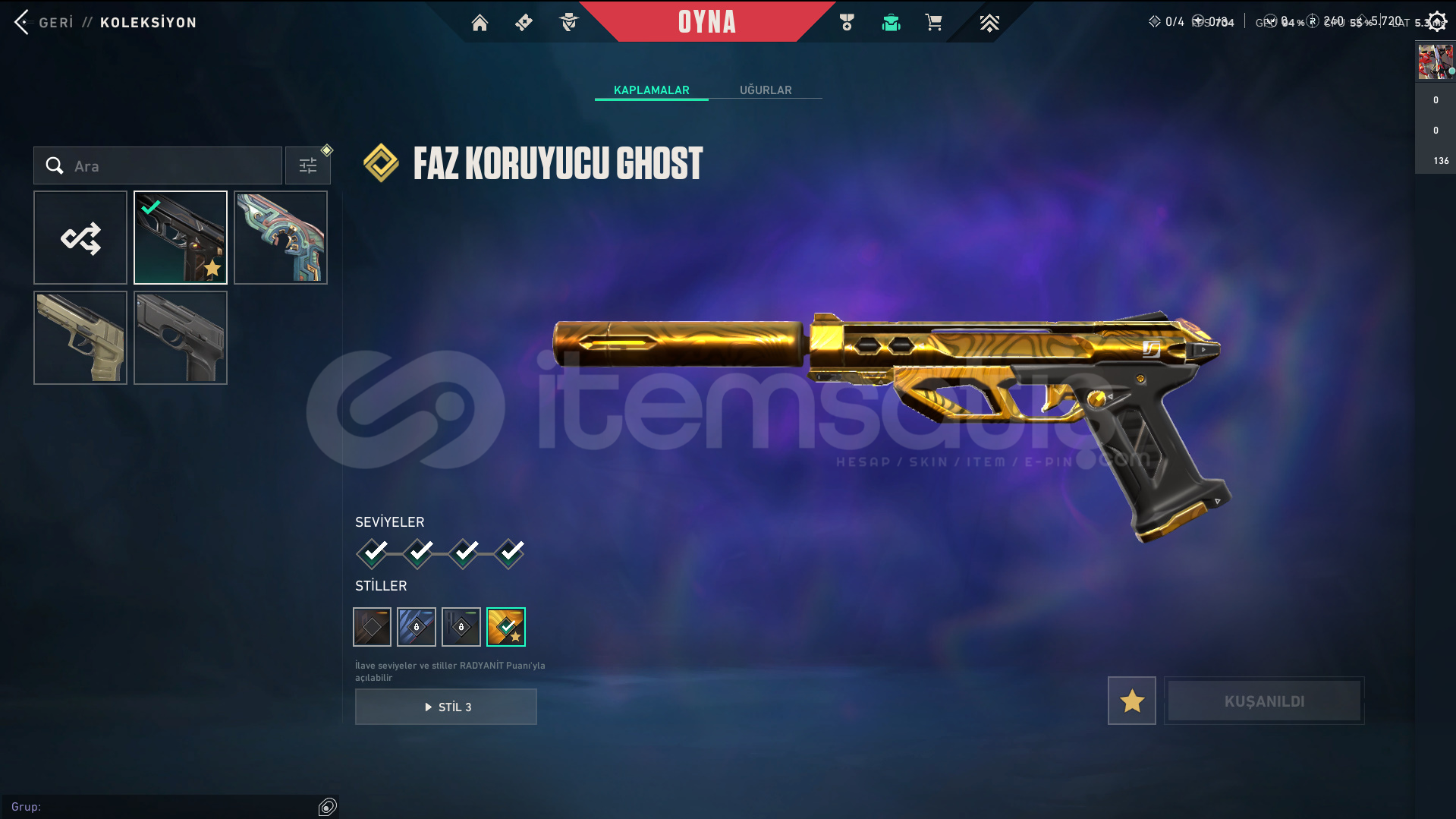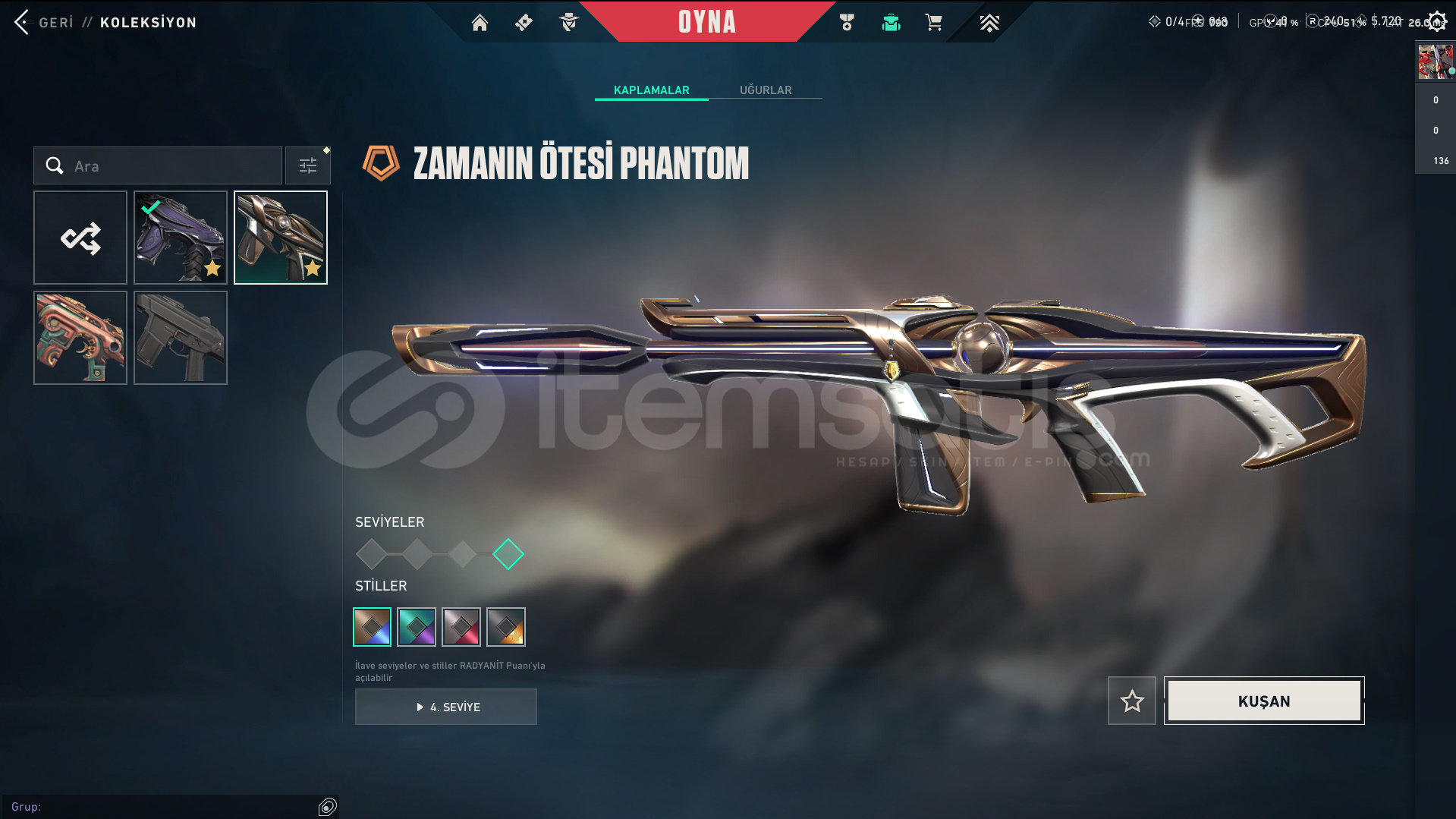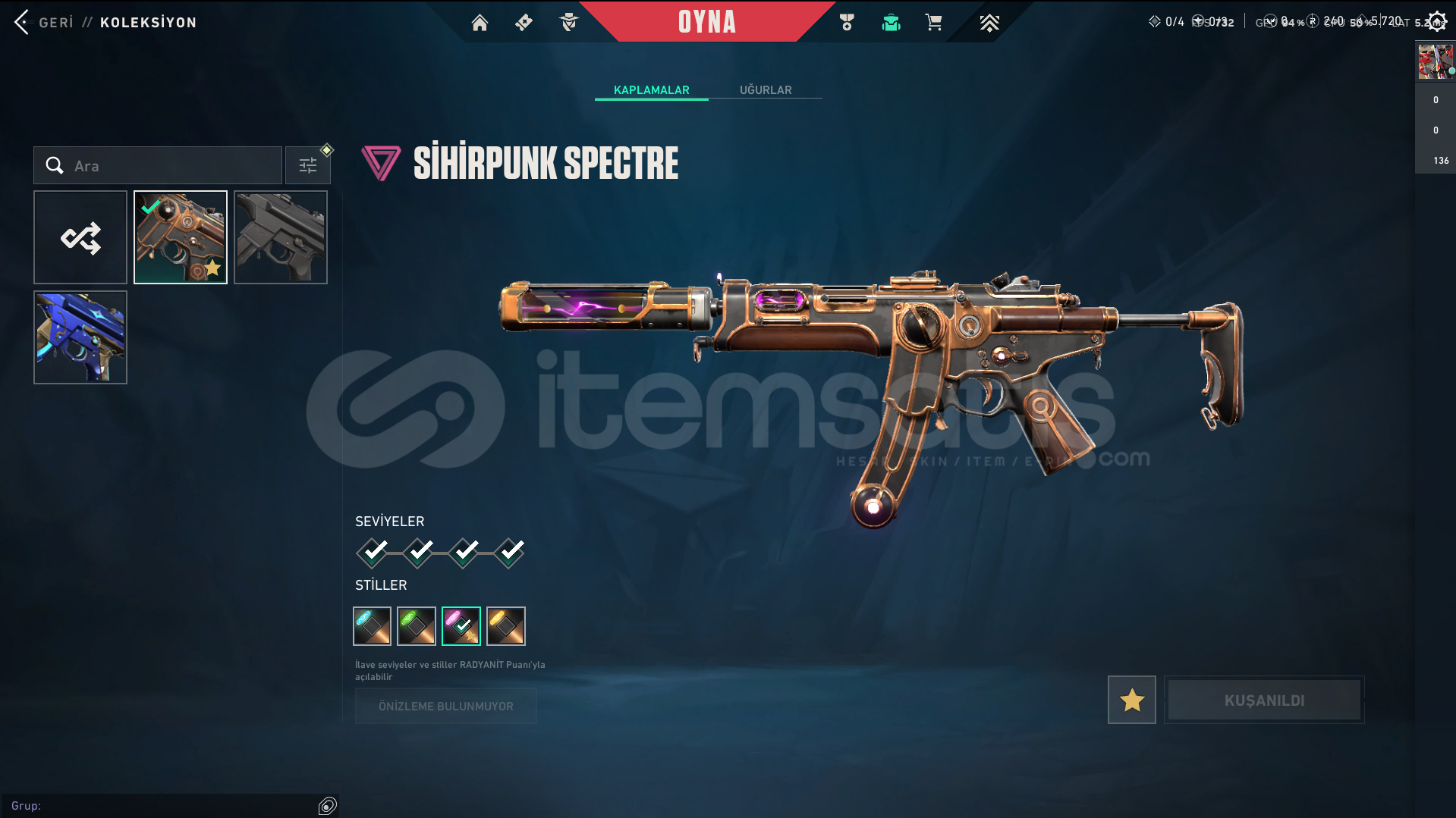 Skinler: Singularity Vandal - Champions 2025 Vandal - Neptune Vandal - Origin Vandal - Prime Vandal - Gaia's Vengeance Vandal - Oni Vandal - Forsaken Vandal / Reaver Phantom - ChronoVoid Phantom / Phaseguard Ghost / Bolt Outlaw / Recon Ghost / Black.Market Classic / Ion Operator / Ion Sheriff / Magepunk Spectre / Xenohunter Knife VE DAHA SAYAMADIKLARIM İLE BİRLİKTE TOPLAM 45 SKİN MEVCUTTUR.