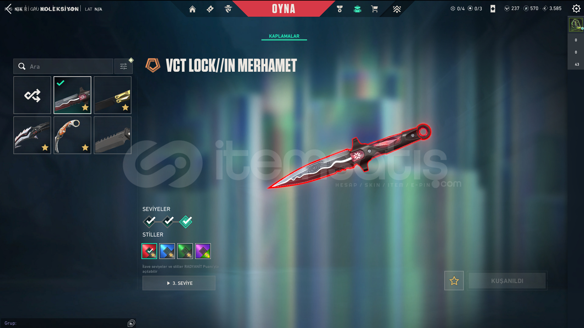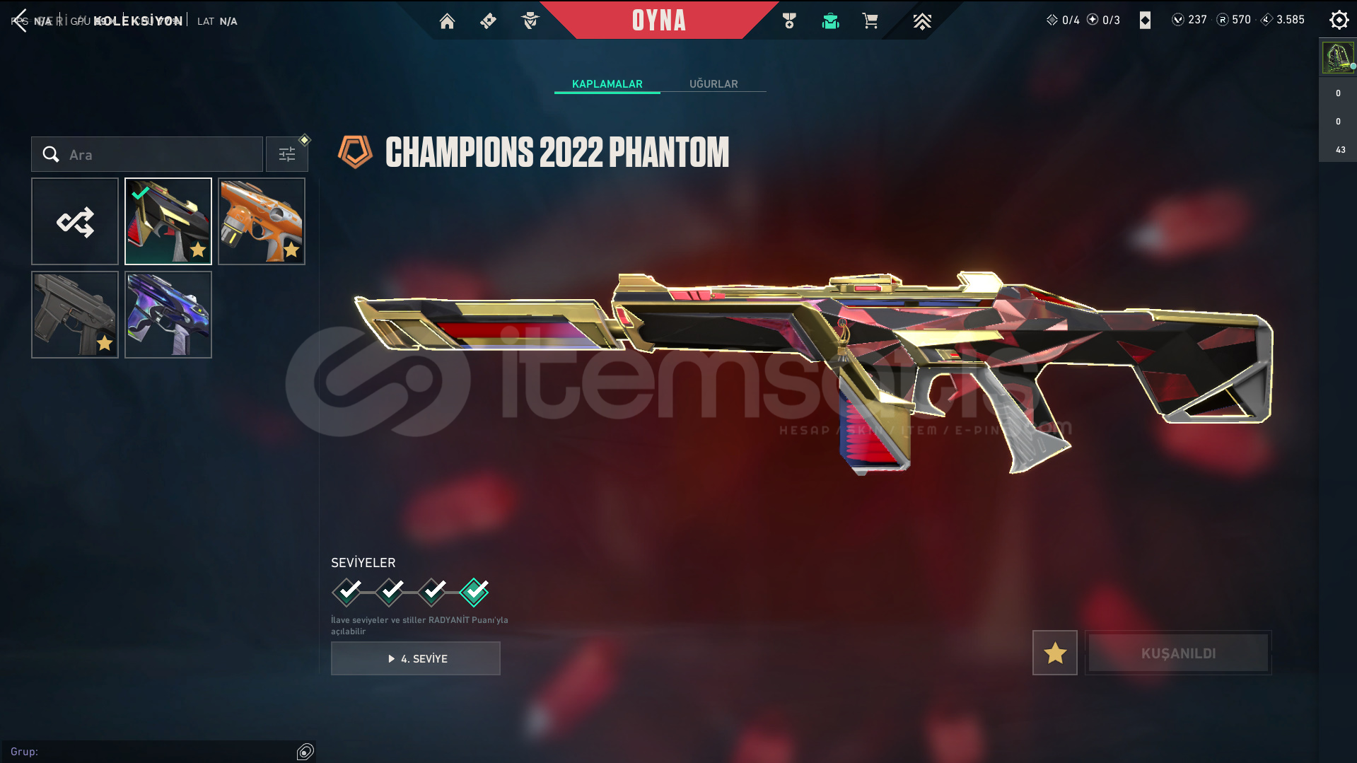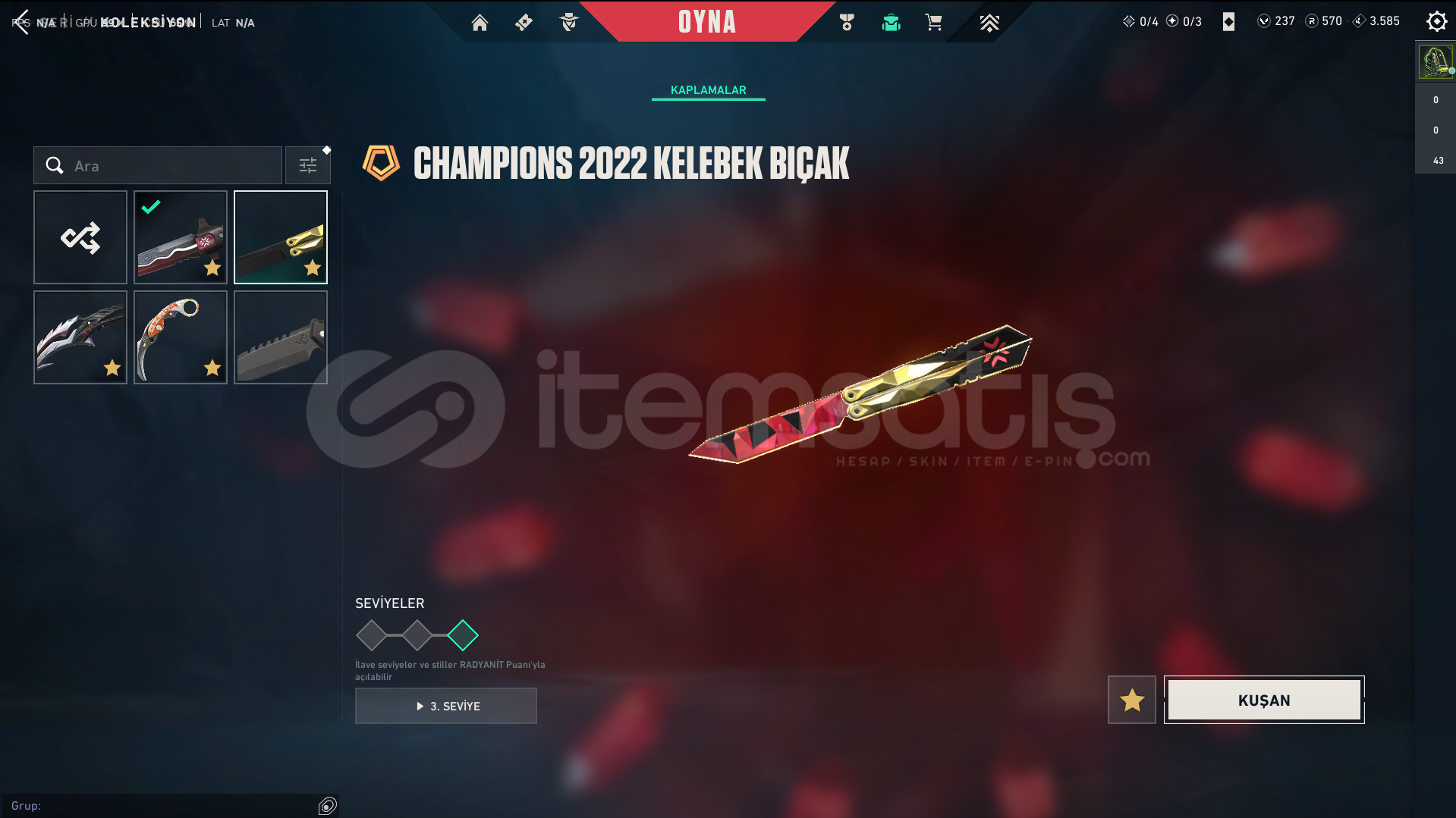 Skinler: Araxys Vandal - Reaver Vandal - Prime Vandal - Ion Vandal / Champions 2022 Phantom / Araxys Operator / Prime Classic / XERØFANG Ghost / Champions 2022 Butterfly Knife - VCT LOCK//IN Misericórdia - Byteshift Knife - Velocity Karambit VE DAHA SAYAMADIKLARIM İLE BİRLİKTE TOPLAM 55 SKİN MEVCUTTUR.