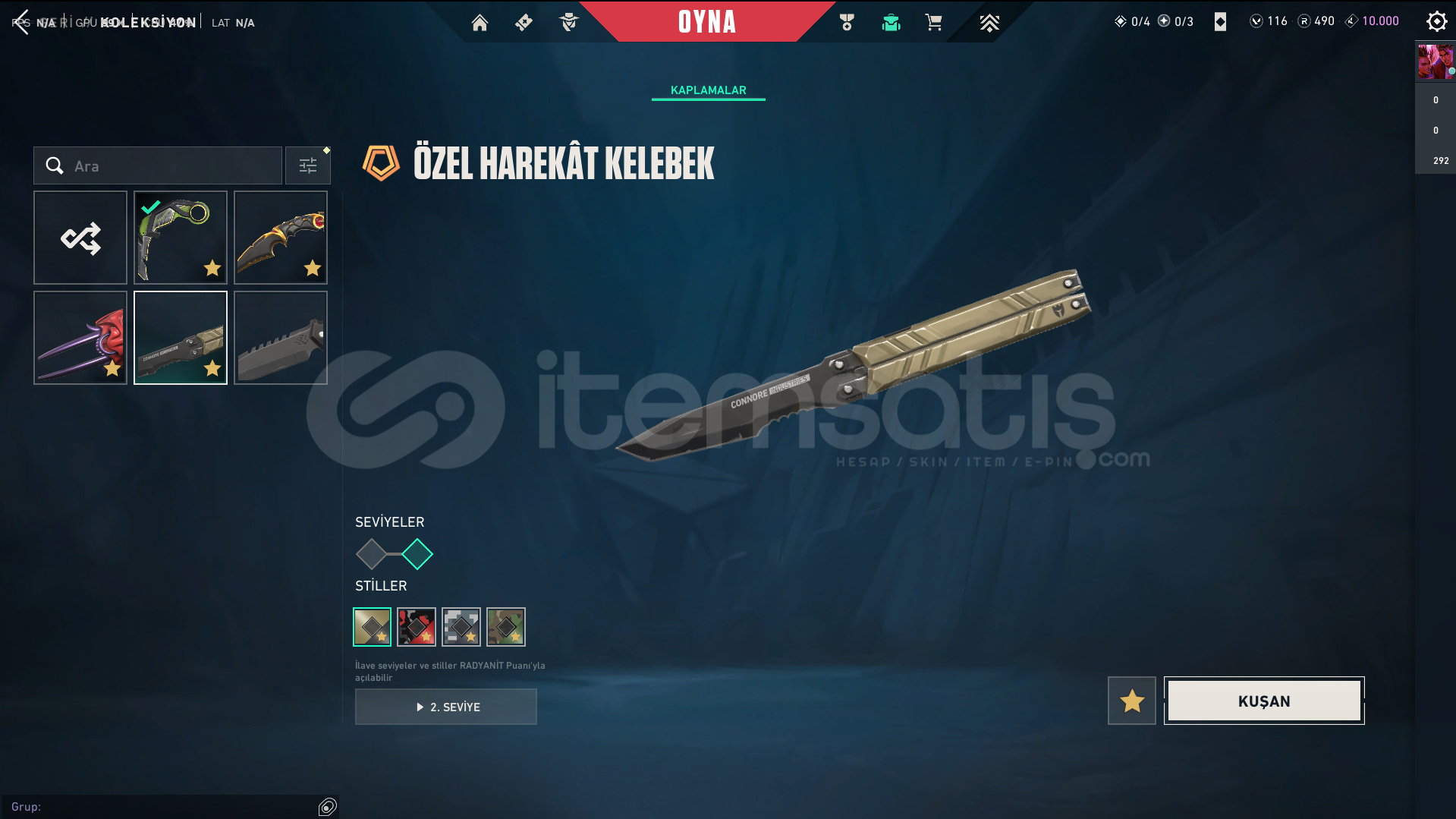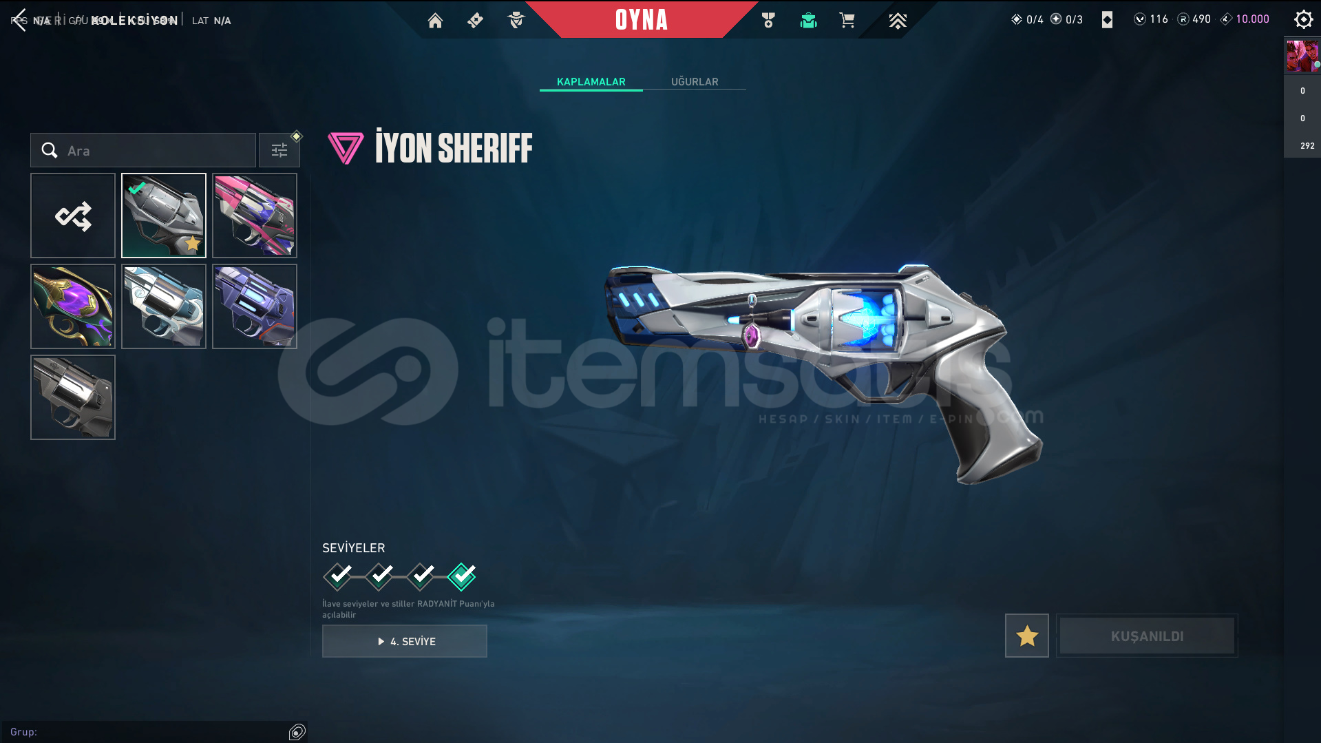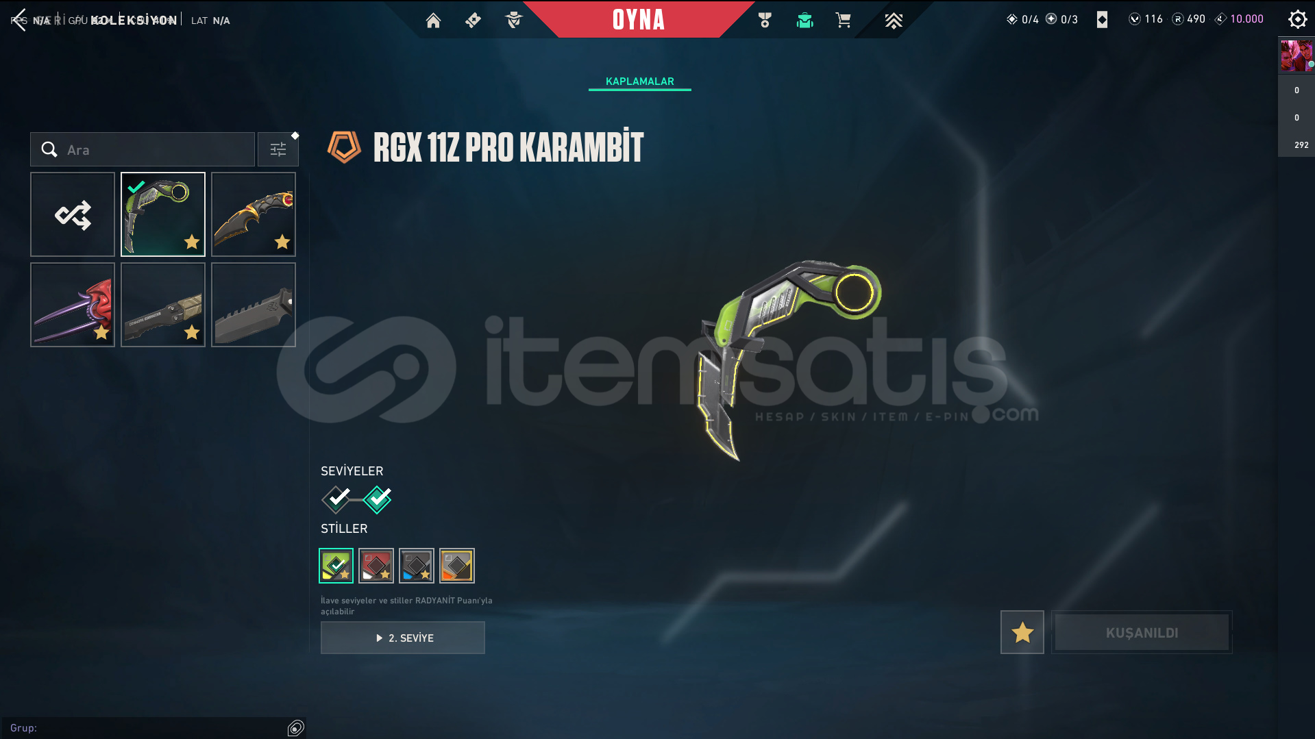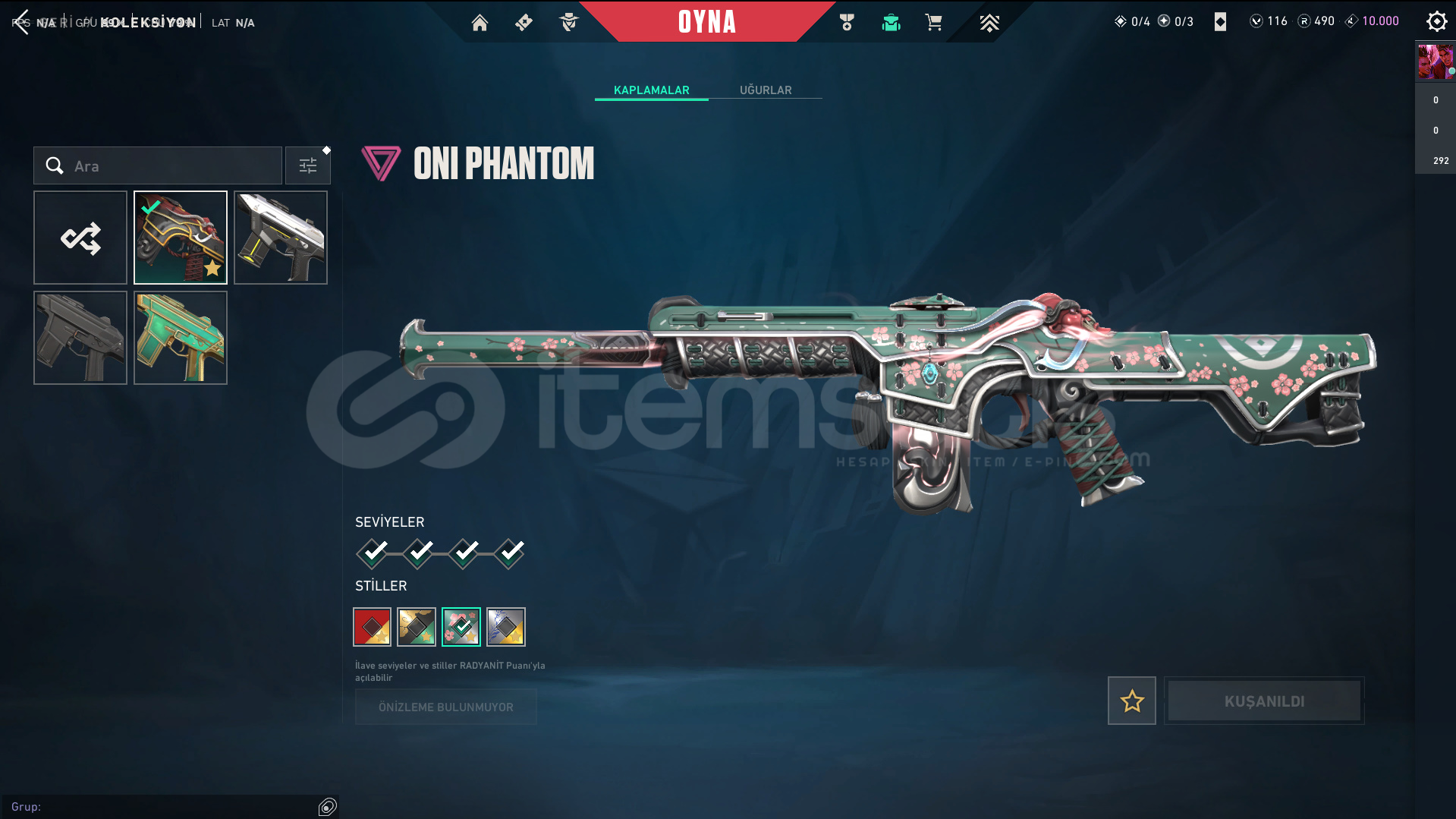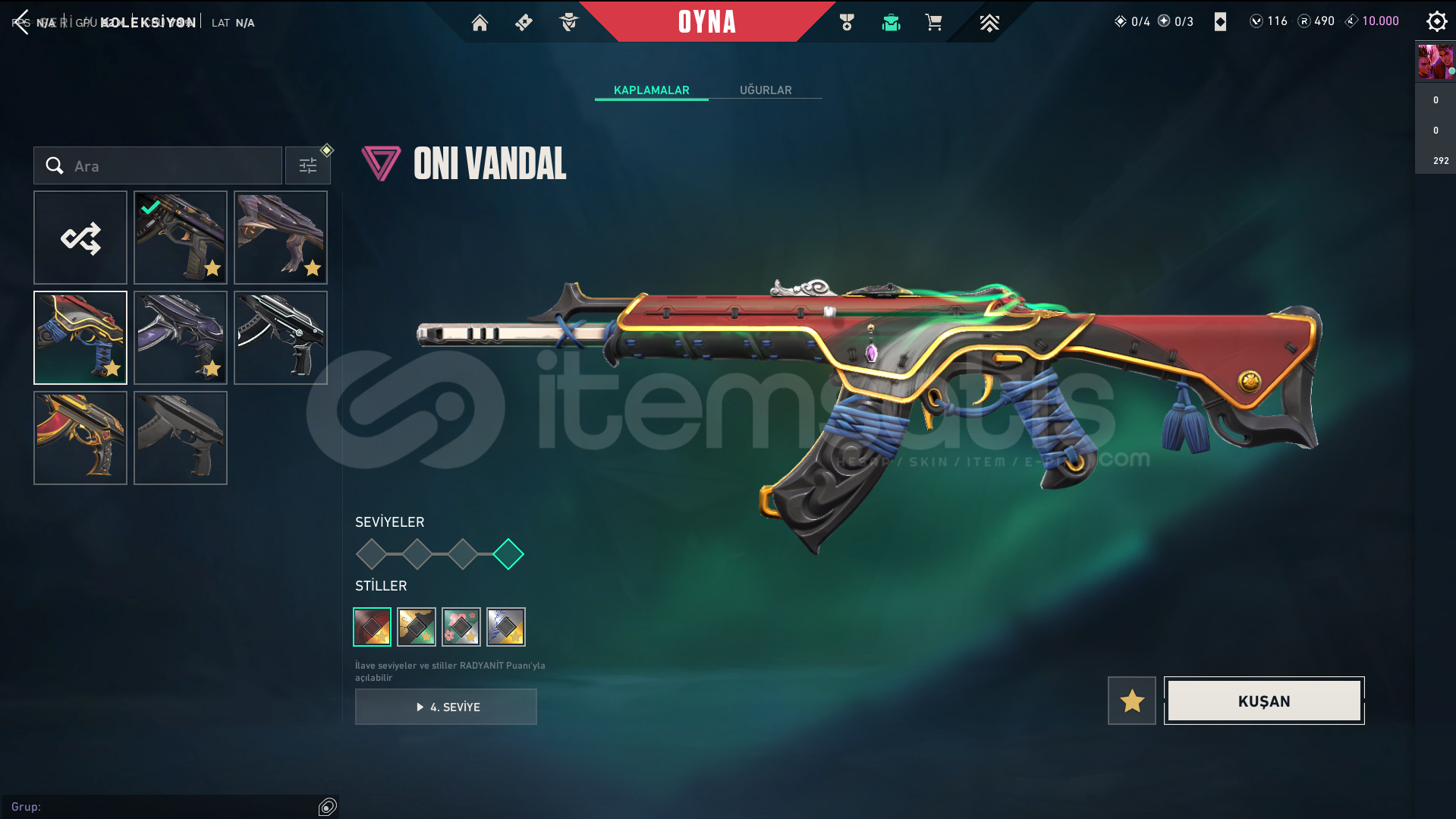 Skinler: Elderflame Vandal - Prelude to Chaos Vandal - Oni Vandal - Reaver Vandal / Oni Phantom / Sovereign Ghost / Ion Sheriff / Singularity Spectre / RGX 11z Pro Karambit - Recon Balisong - Ruin Dagger - Oni Claw VE DAHA SAYAMADIKLARIM İLE BİRLİKTE TOPLAM 56 SKİN MEVCUTTUR.