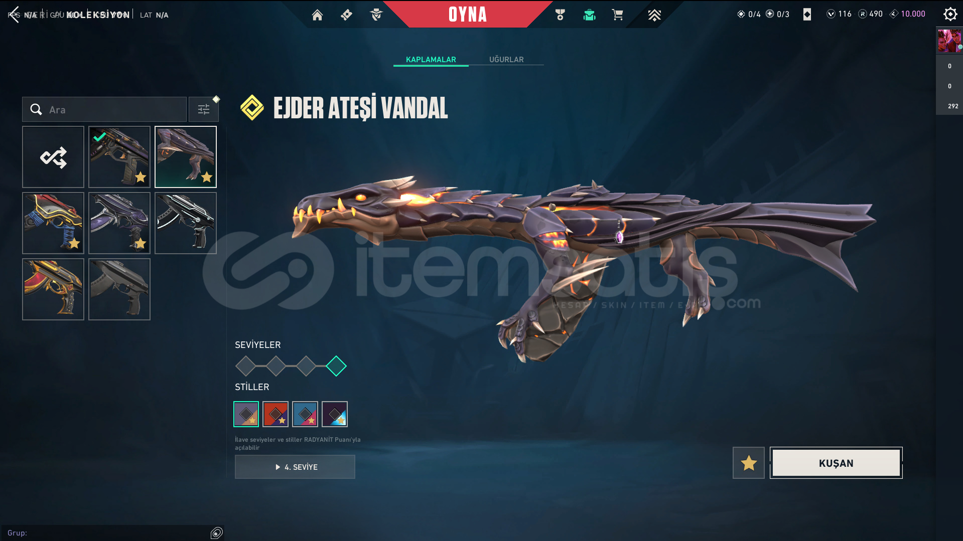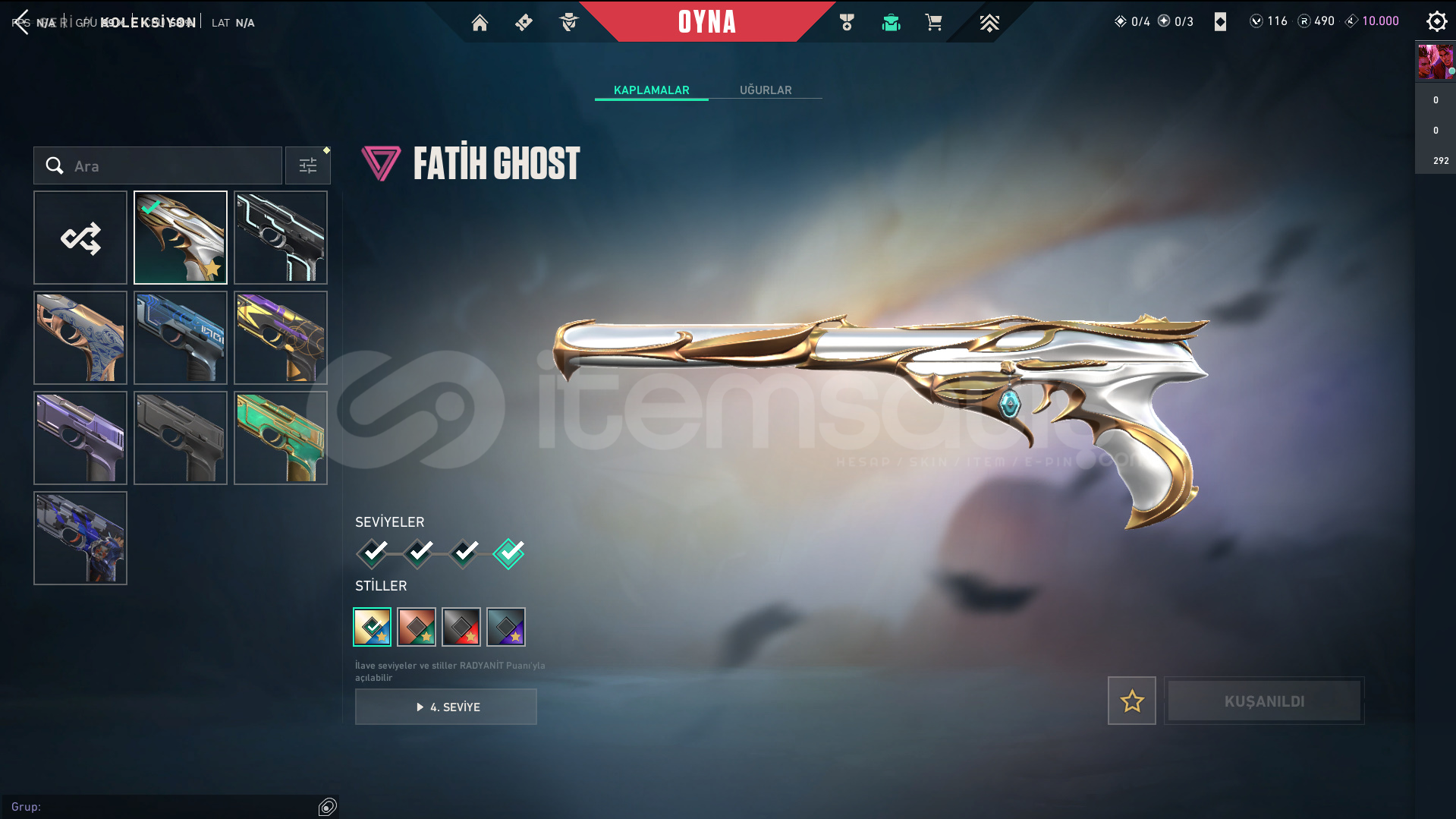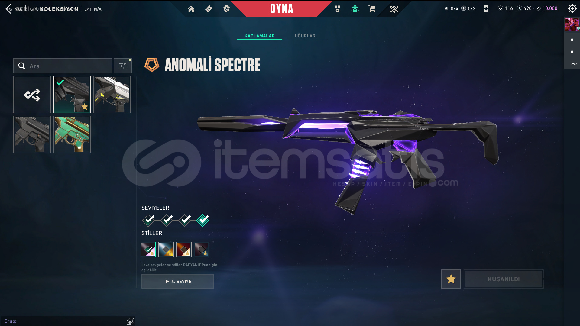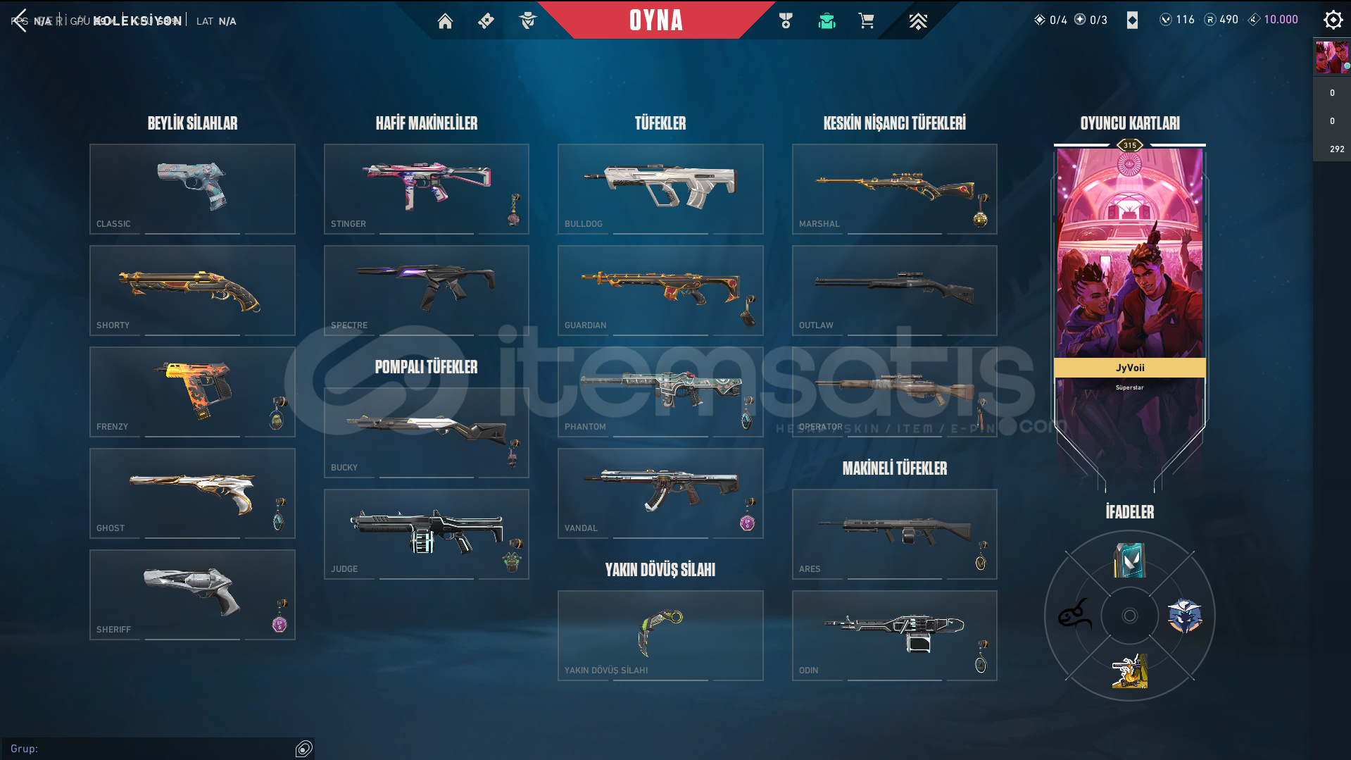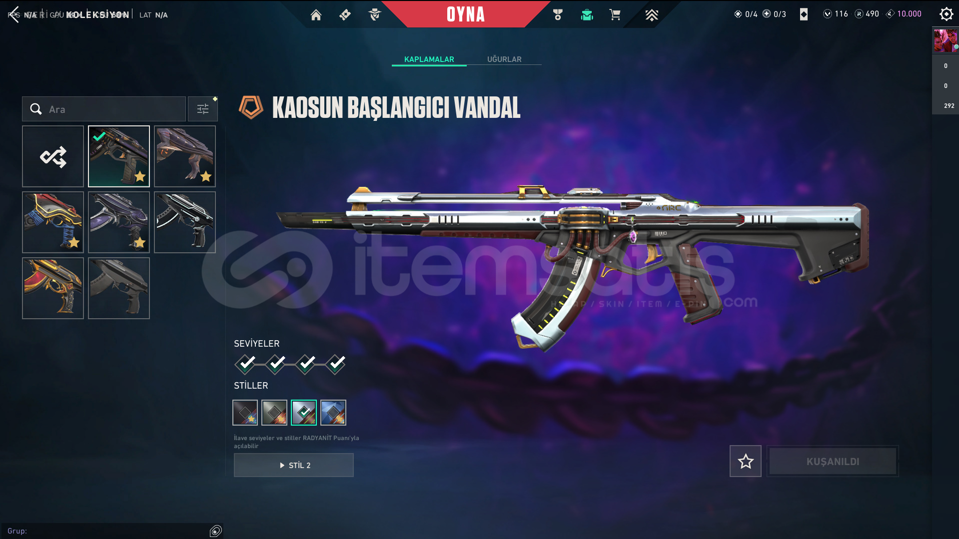 Skinler: Elderflame Vandal - Prelude to Chaos Vandal - Oni Vandal - Reaver Vandal / Oni Phantom / Sovereign Ghost / Ion Sheriff / Singularity Spectre / RGX 11z Pro Karambit - Recon Balisong - Ruin Dagger - Oni Claw VE DAHA SAYAMADIKLARIM İLE BİRLİKTE TOPLAM 56 SKİN MEVCUTTUR.